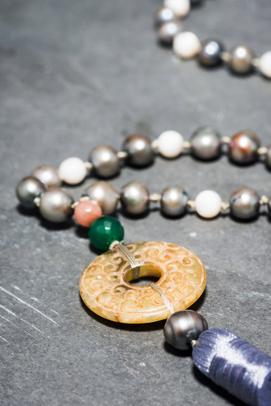 ORIENT DUSK ANTIQUE CARVED NEPHRITE JADE MANDALA NECKLACE