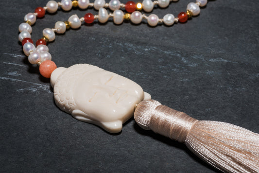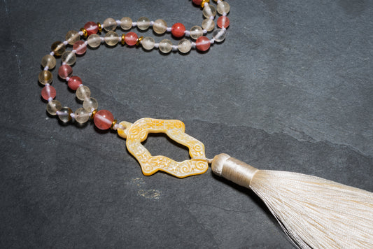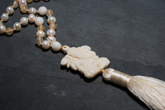 PEARL + RUTILE QUARTZ SILK HAND CARVED GANESHA MALA