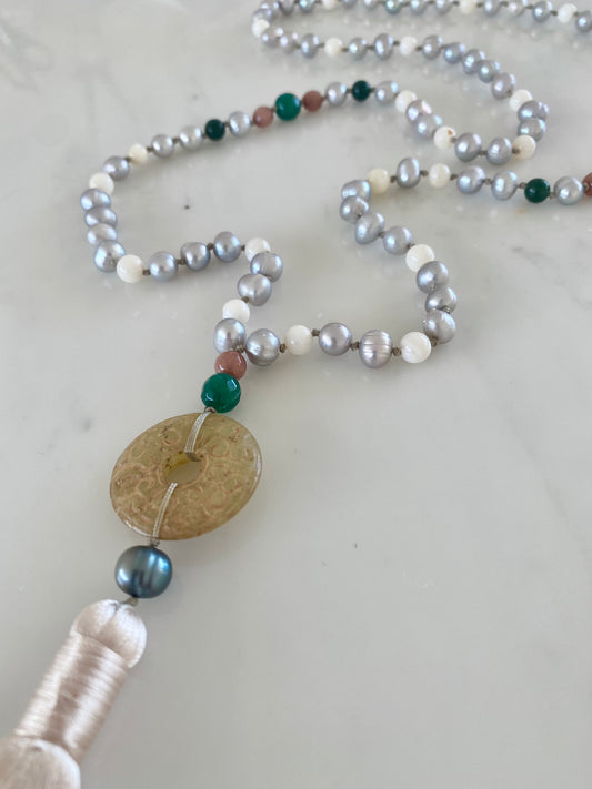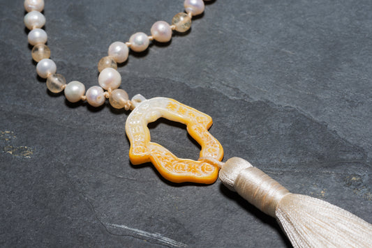 Sold out for nowPEARL + RUTILE QUARTZ SILK HAND CARVED MOTHER OF PEARL HAMSA MALA