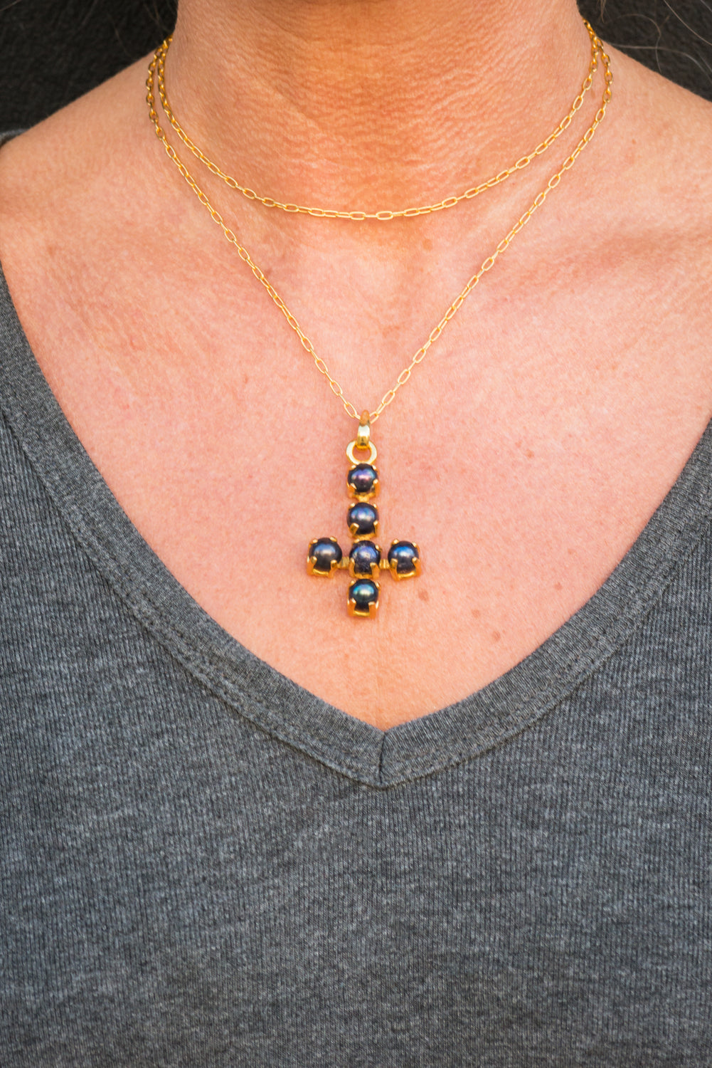 Indulge in the allure of luck and luxury with our stunning handmade pendant, skillfully crafted by our artisan. This enchanting piece features black pearls, celebrated for their symbolic fortune, set in gold-plated 925 silver. The cross design is adorned with six black pearls, delicately claw-set, creating a luxe rock and roll chic vibe that exudes both sophistication and edge.