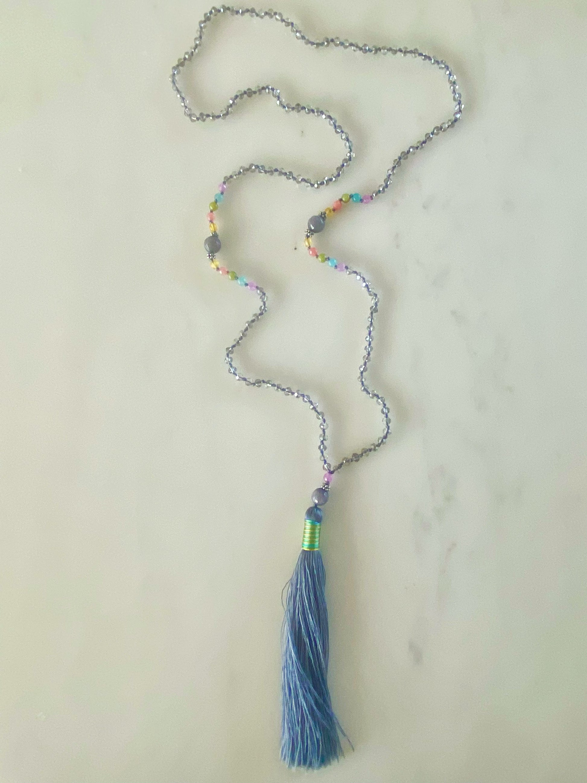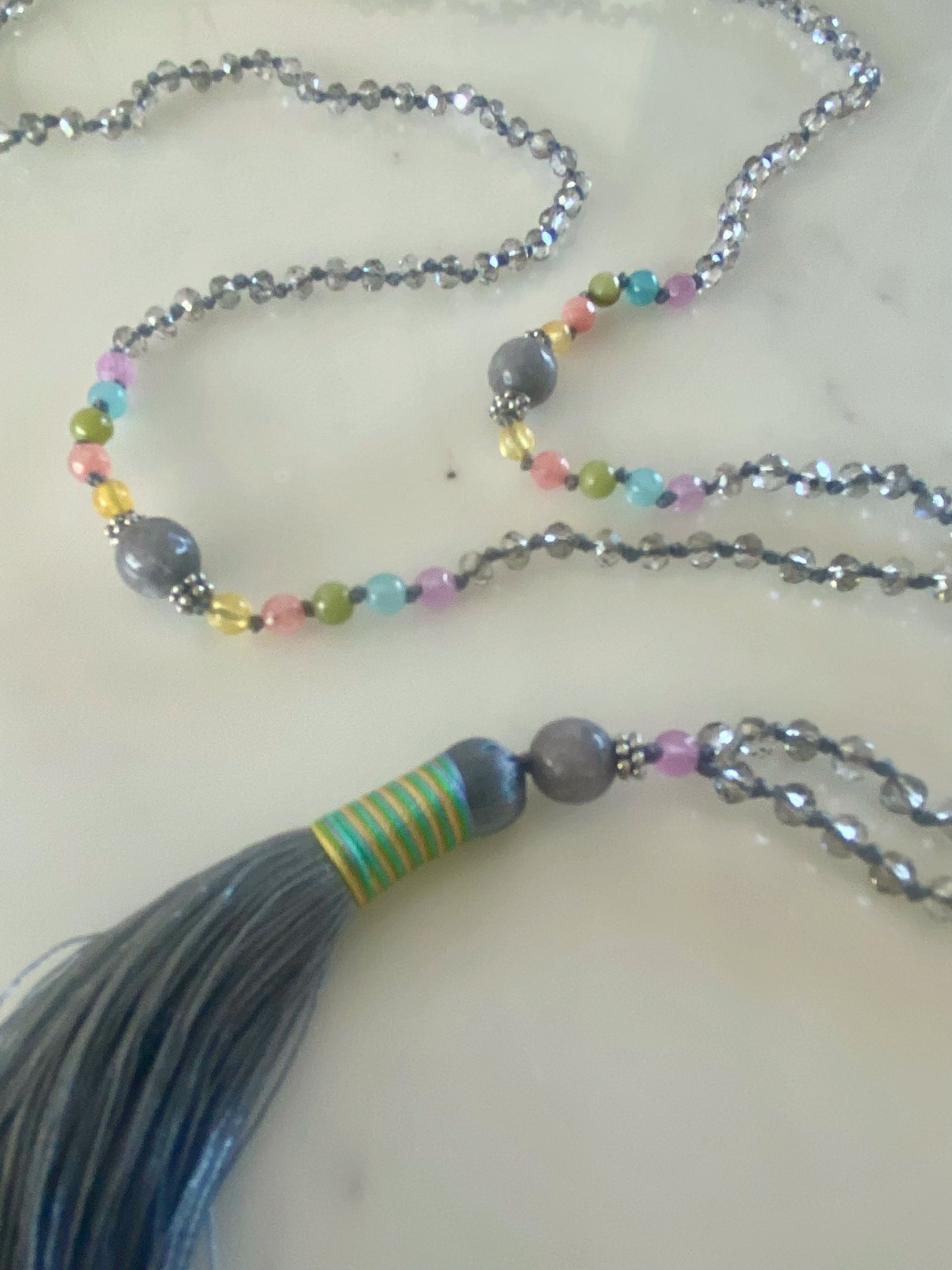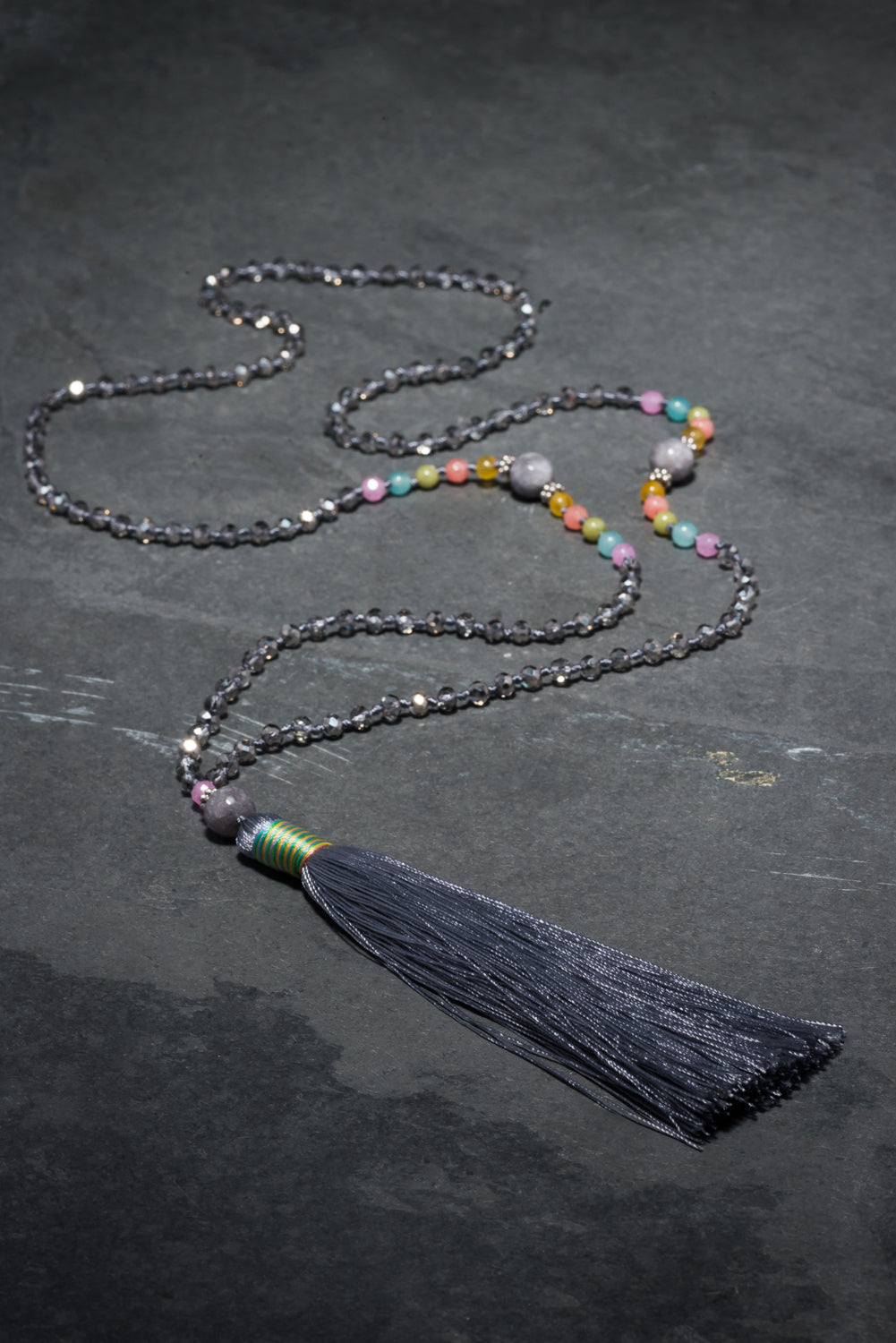 The perfect way to wear all this seasons pastels in an easy neutral pieces. Made up of clear sparkling crystals, at its centre sit hawks eye semi precious stones surrounded by a rainbow of pastel agate faceted semi precious stones. It is finished with a soft grey tassel wrapped in a swirl of colours.