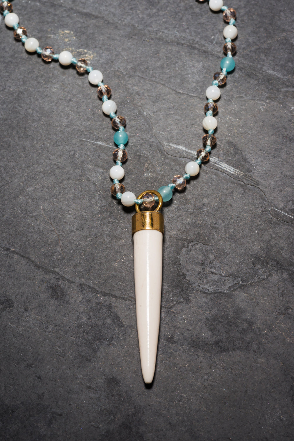 A beautiful Yang energy artisan made tusk necklace. Smooth creamy shell beads are hand woven with aqua semi precious agates, champagne crystals and accents of gold. Finished with a white hand carved horn tusk set in hand cast brass.