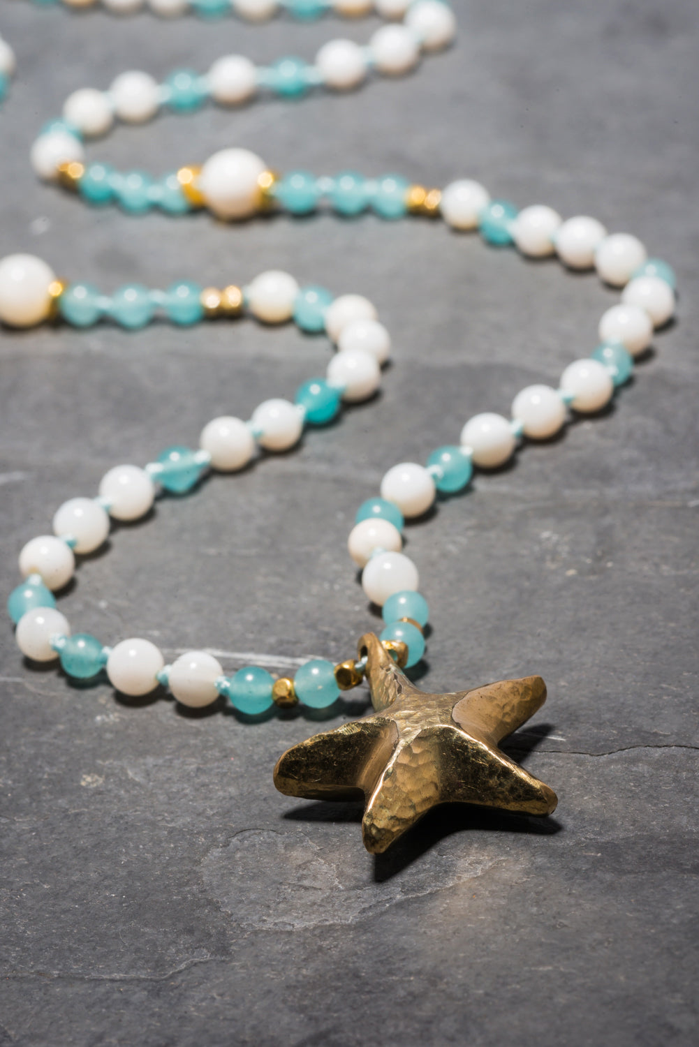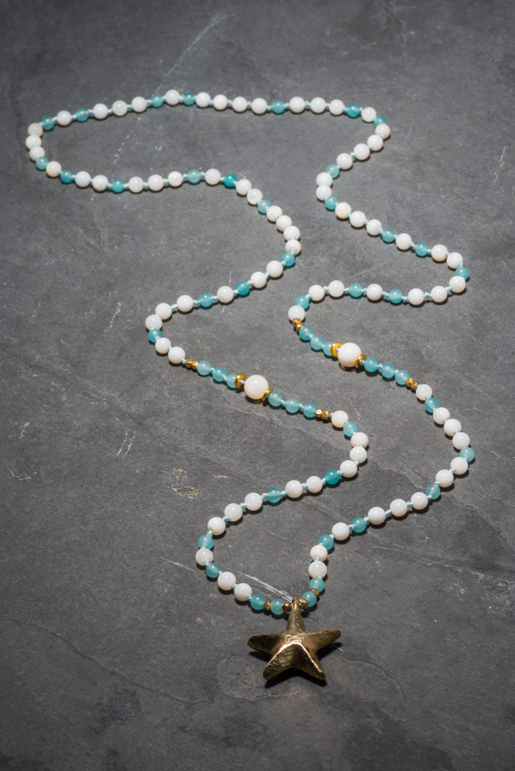 Hand knotted in soft aqua thread with smooth shell beads and aqua agate semi precious stones. Golden touches give this beach a sunshine beach and turquoise waters feel.