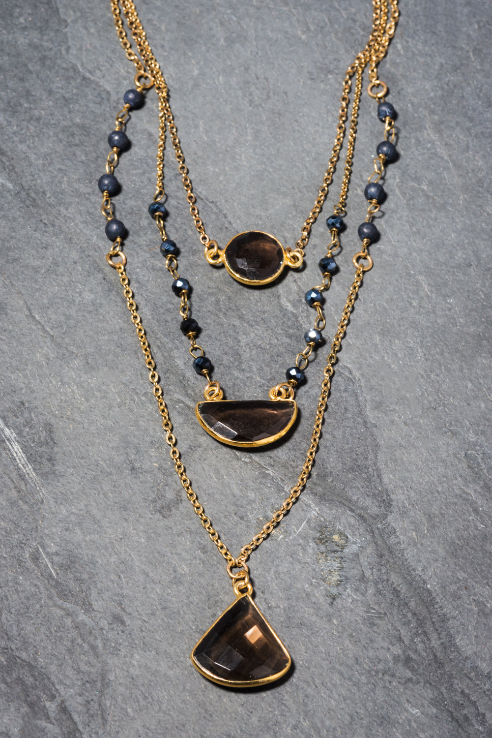 This beautiful and on trend three layered gold plated necklace sits on the chest and is perfect with lower cut tanks, tees and cami tops. It has three gorgeous smokey quartz semi precious stones in a round, a crescent and a drop shape which hang one below the other with sparkling dark crystals in between.
