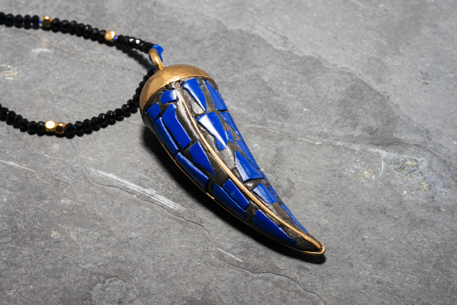 This Yves Saint Laurent inspired, rich and opulent deep blue tusk necklace made of lapis lazuli semi precious stones inset in brass. It is a beautiful statement piece for those of you who like to give a wink to high fashion. Volcanic stone beading, brass detailing, rich blue agate semi precious stones sit as it's centre and it has a satisfyingly weighty feel. Wear alone or layer with an blue boheme tassel necklace.