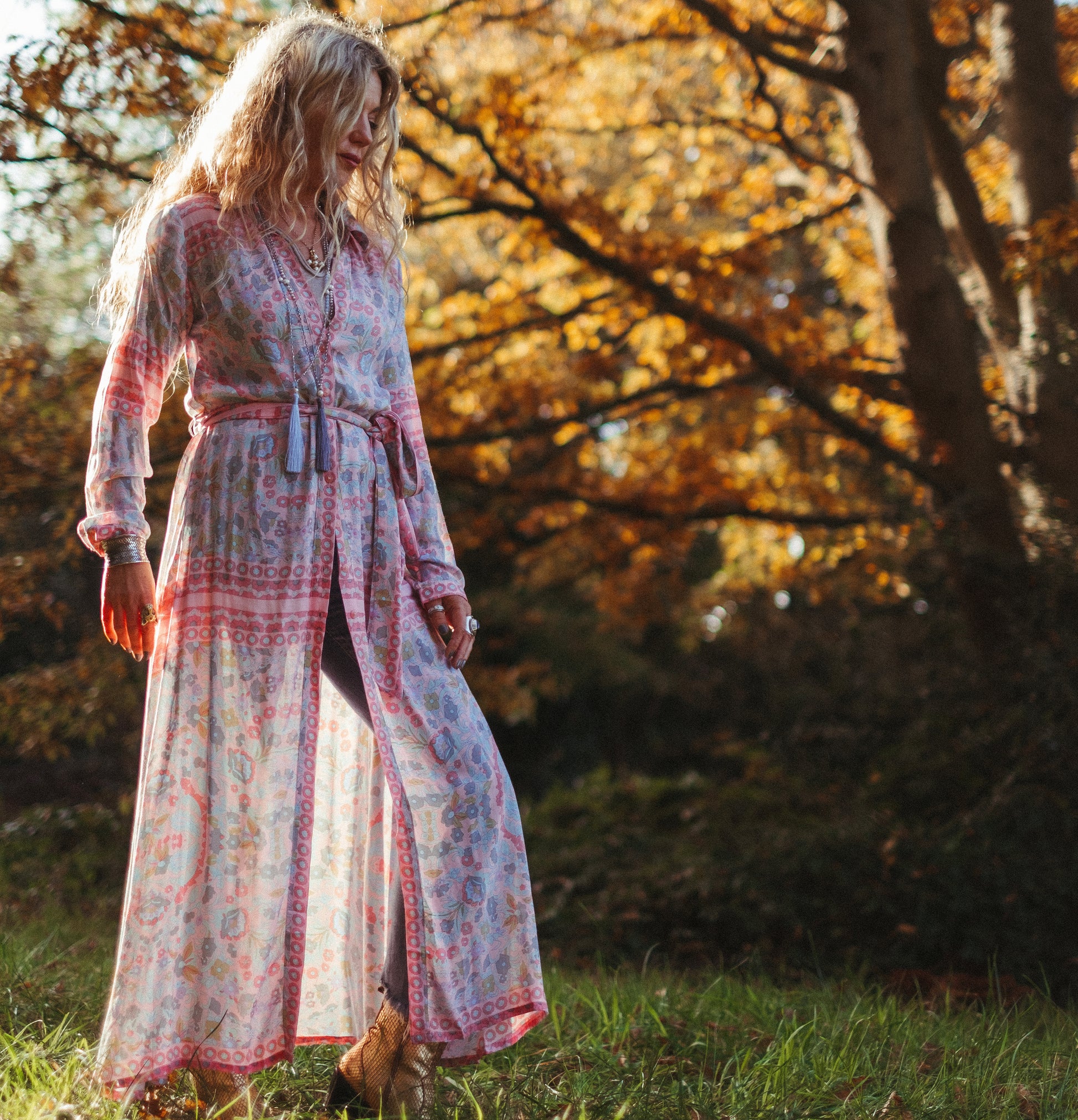 Our 70's California-inspired Long-Sleeved Chemise Dress is a versatile and flattering addition to any wardrobe. Made from ultra-soft rayon voile fabric with a colorful print, it offers comfort and style in one.