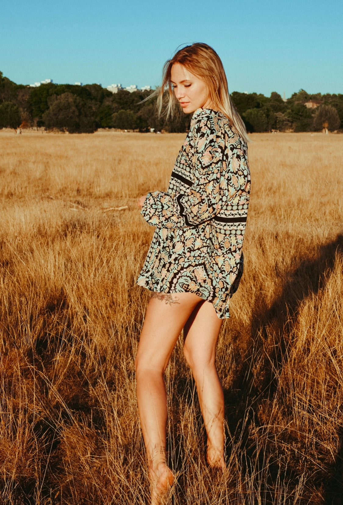 Crafted from luxuriously soft hand-screen printed rayon voile, this limited edition piece exudes a sense of bohemian elegance.