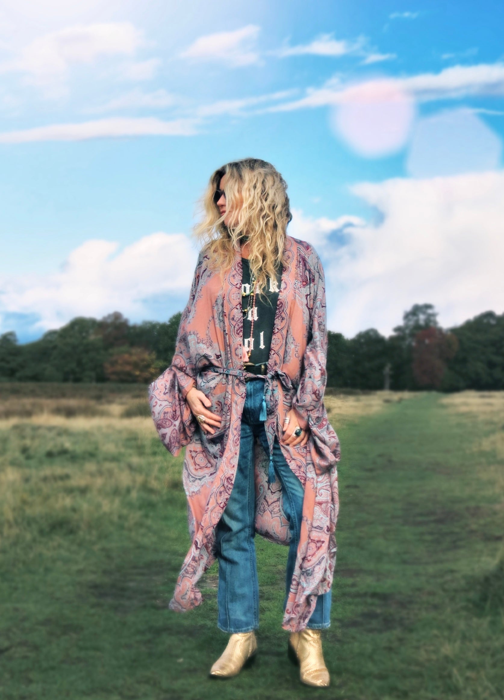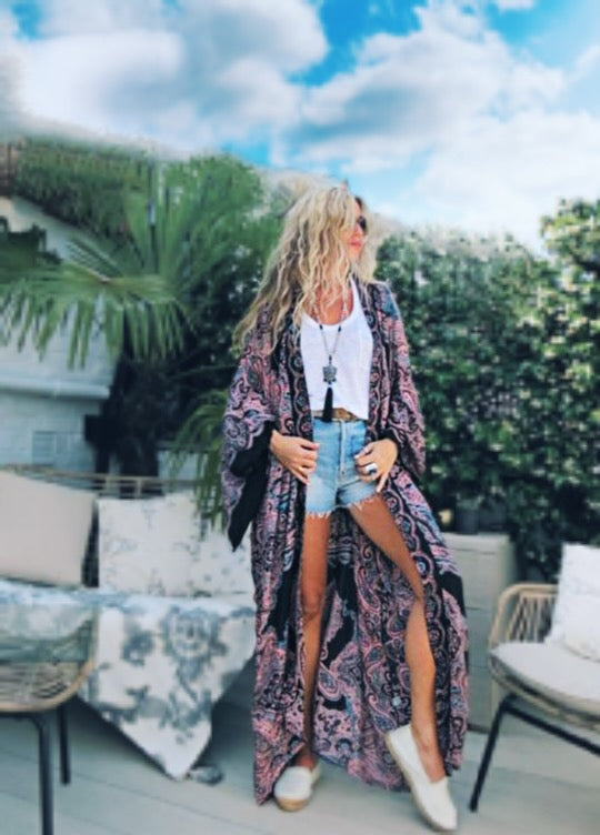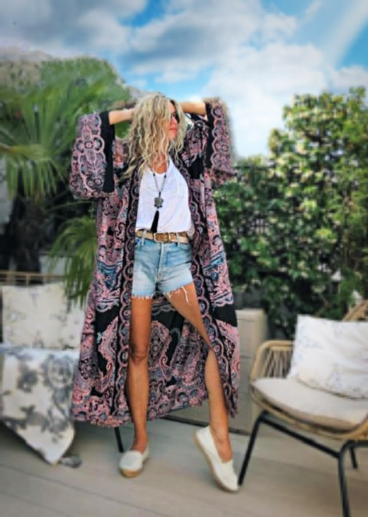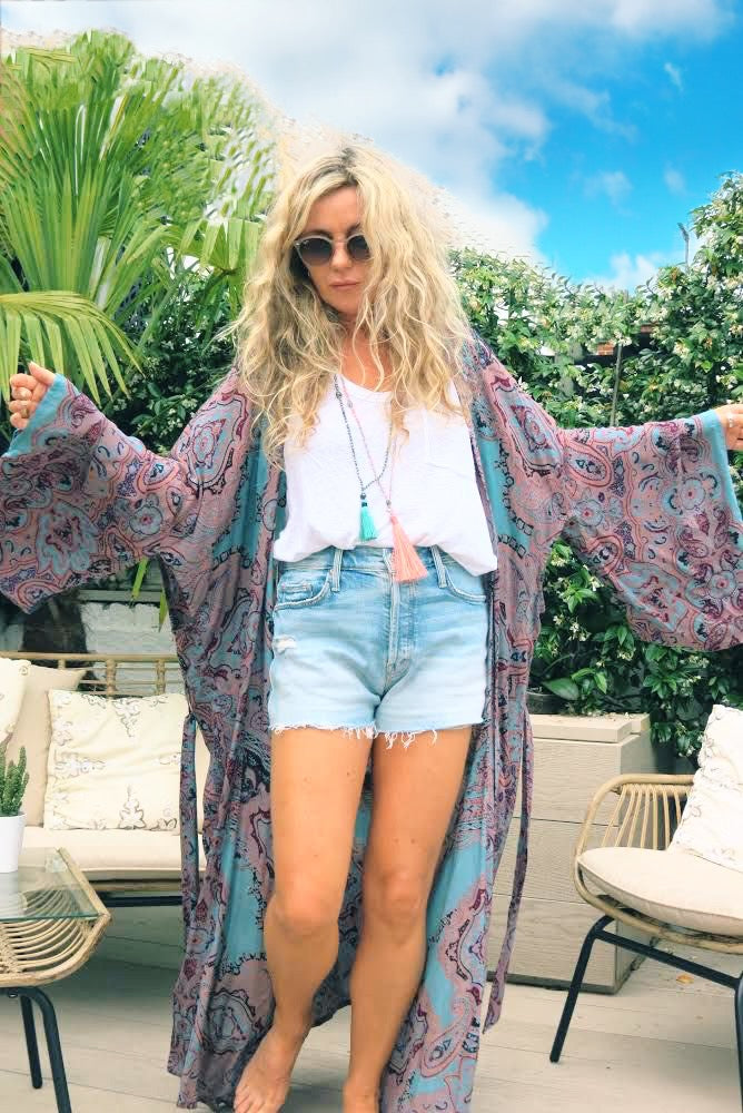 This statement robe is a nod to the beautiful and mystical and sun faded colours of vintage North African fabrics. Made in the softest, lightest, hand screen printed rayon voile fabric, this piece is an easy one size. It is a wonderful morning robe, bikini coverup and gives a vintage feel over jeans and trousers.