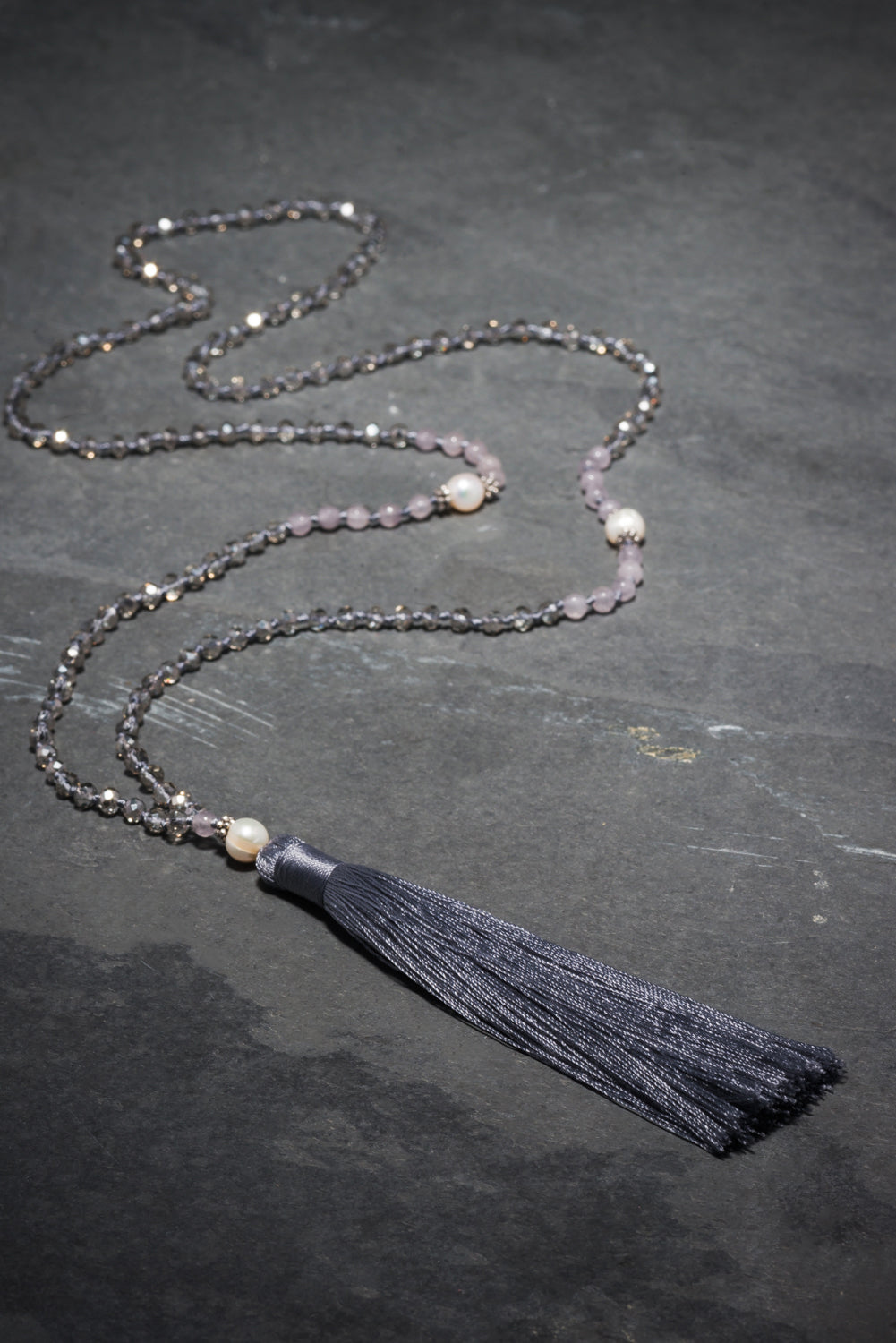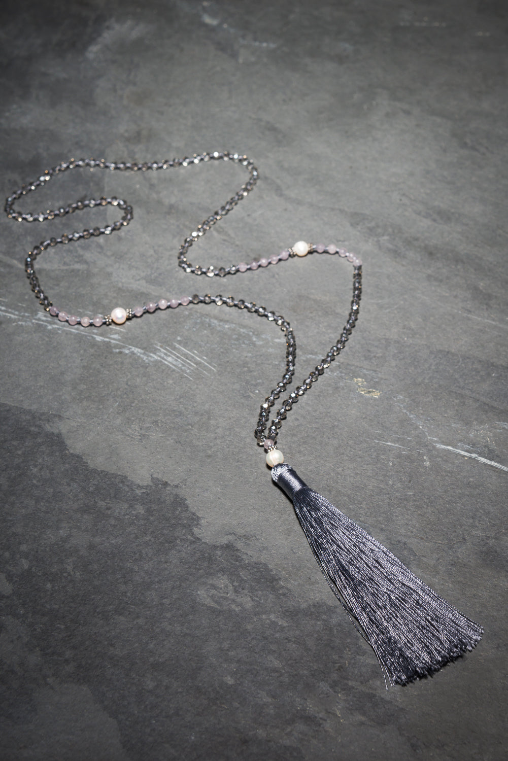 This is one of our classic go to necklaces that you will use over and over. Made up of clear crystals, soft grey agate and white large and small round fresh water pearls. It is finished with a soft grey tassel. Effortlessly elegant it adds a touch of neutral shimmer to your look.
