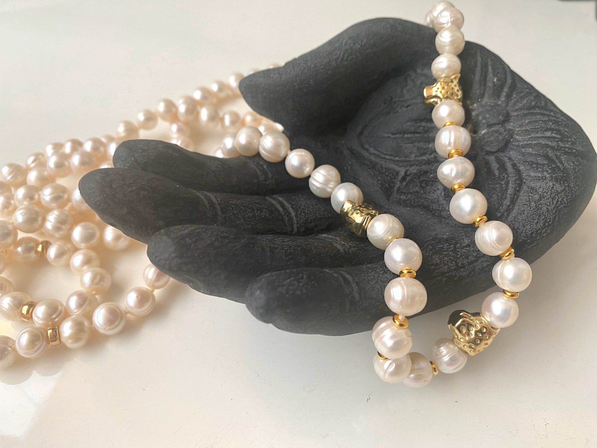 Hand knotted by our artisan in cream thread, it can be worn long as a single necklace (as a daytime look) or wrapped double where the gold ring section sits like a choker piece against the neck (evening Or more dressy day look). It is a classic piece to take you day to night through the seasons.