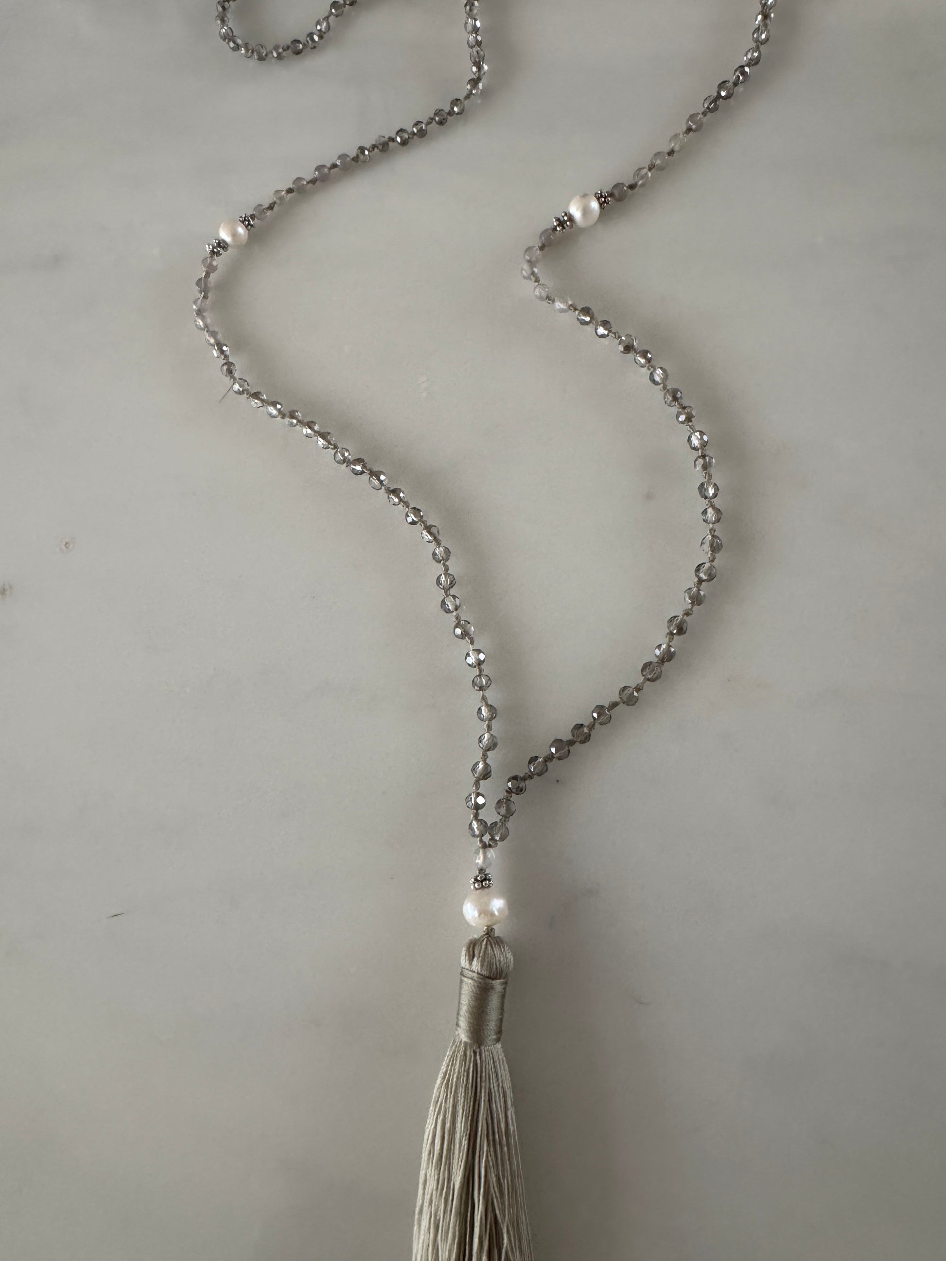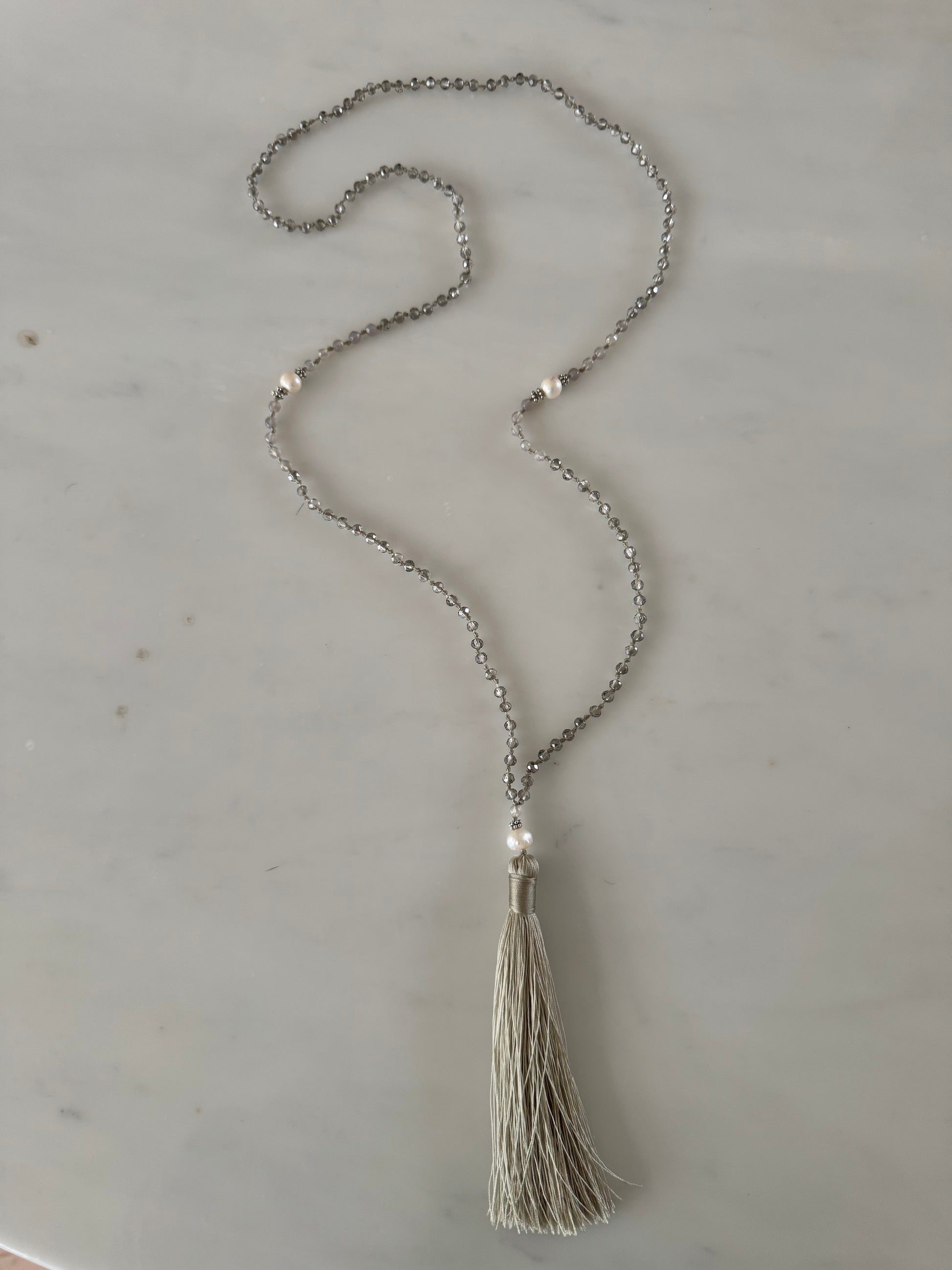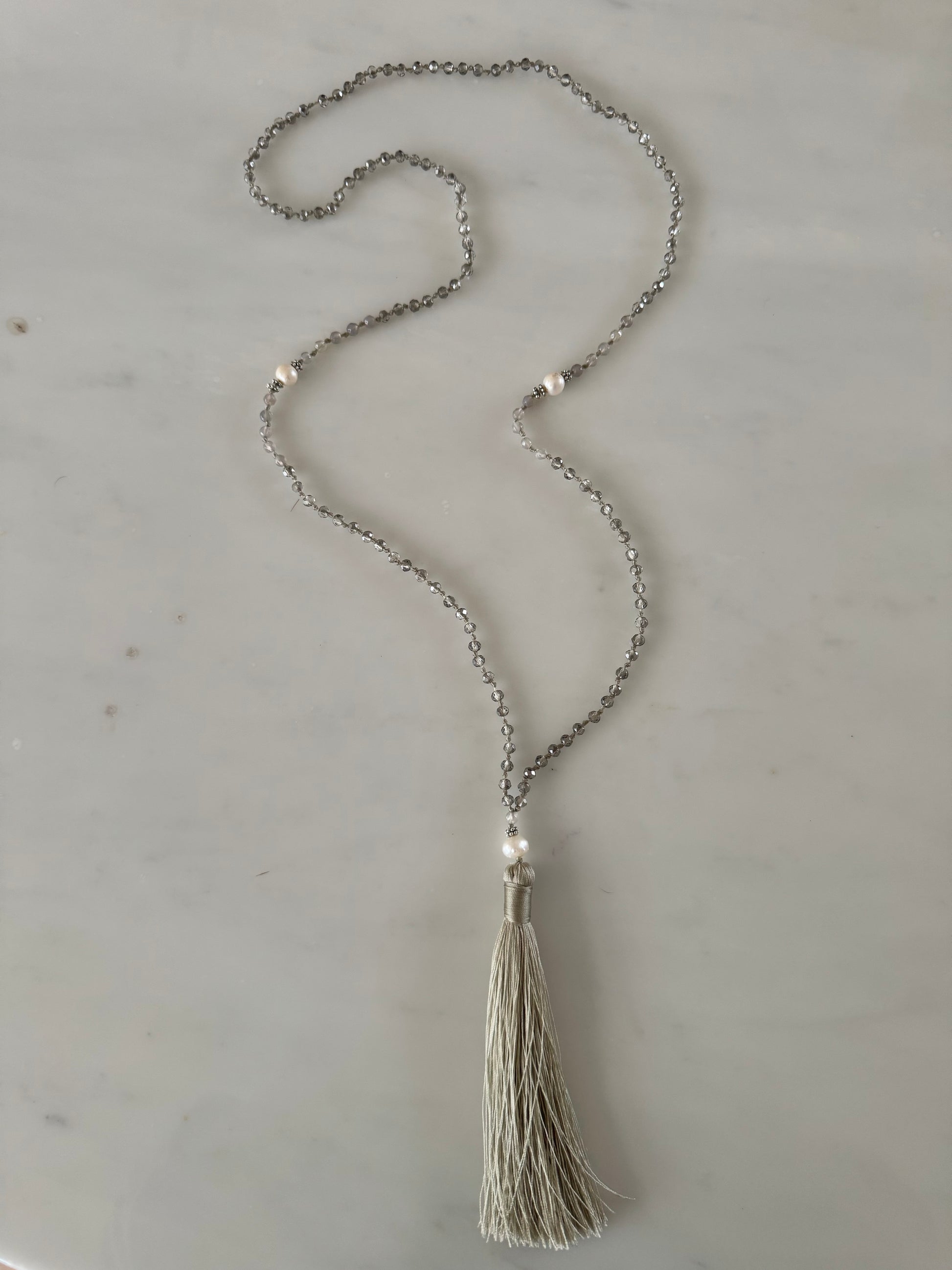 This is one of our classic go to necklaces that you will use over and over. Made up of clear crystals, soft bedge agate and large white fresh water pearls. It is finished with a soft beige tassel. Effortlessly elegant it adds a touch of neutral shimmer to your look.