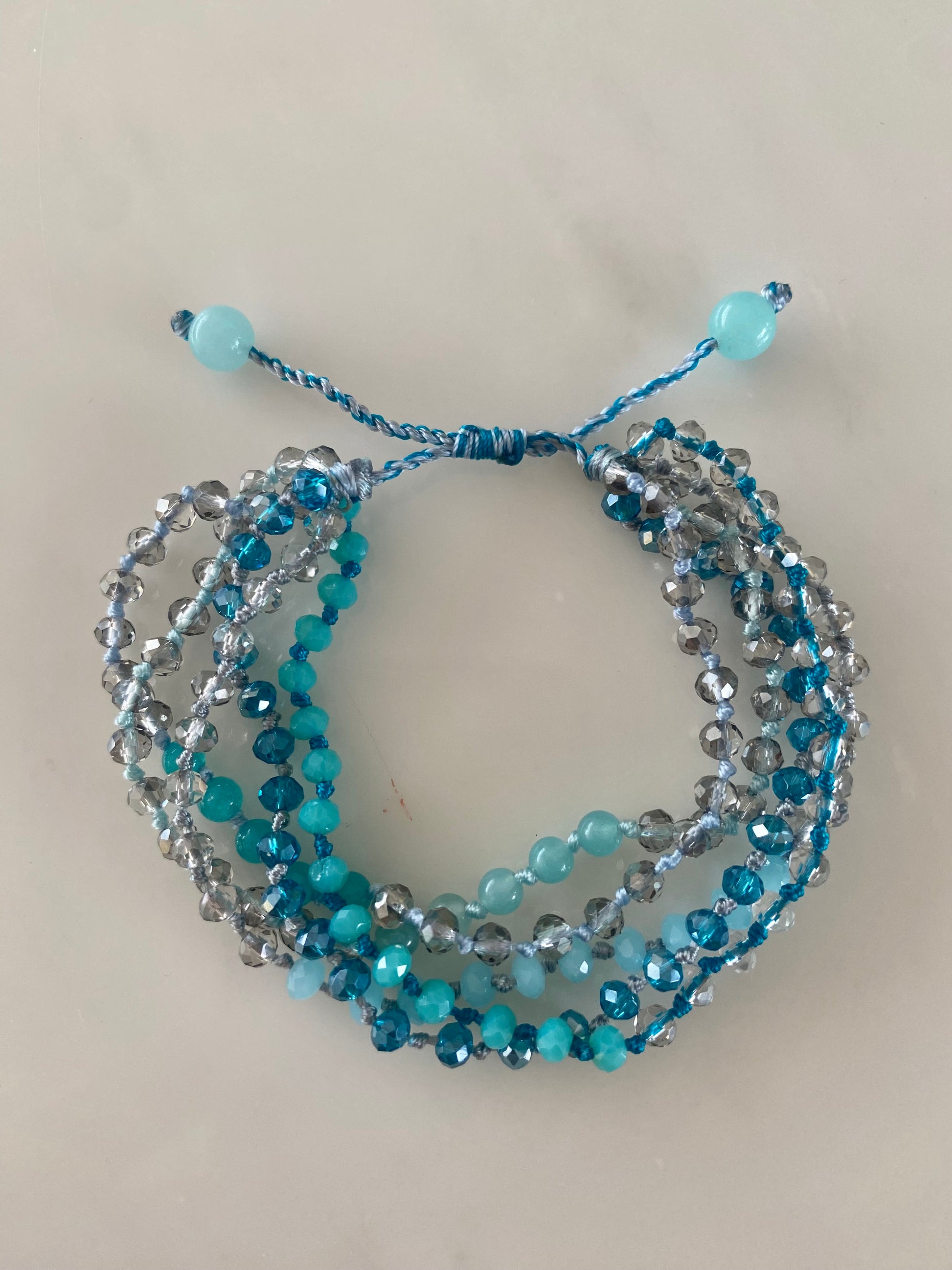 This 5 multi strand bracelet captures the colours of fresh cool sparking blues of ocean waves. It is the perfect mix of light blue opaque and darker blue transparent crystals together with almost turquoise abd soft blue transparent agate semi precious stones. A perfect holiday accompaniment and sets of a tan perfectly.