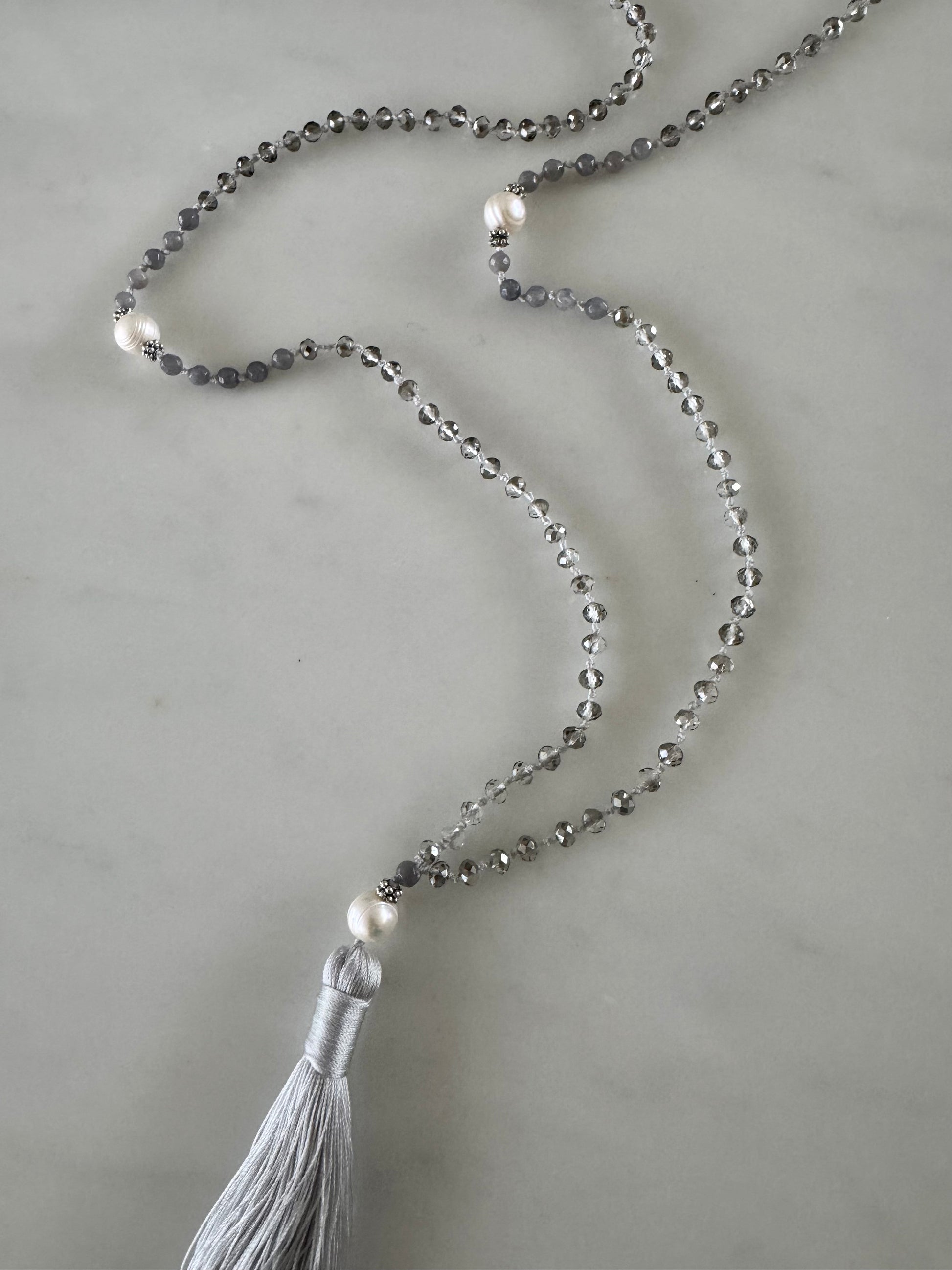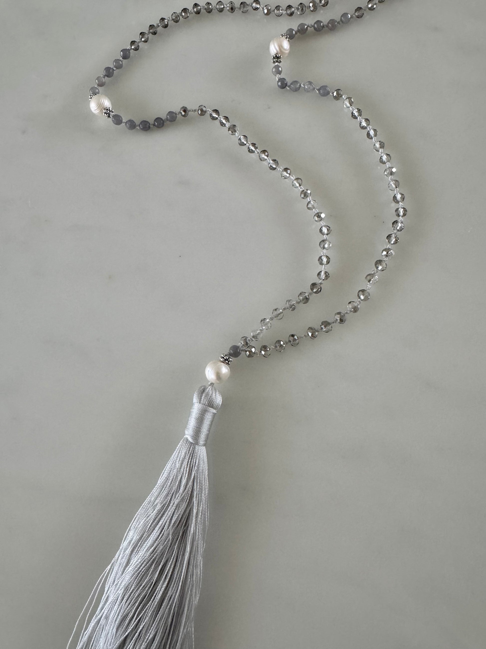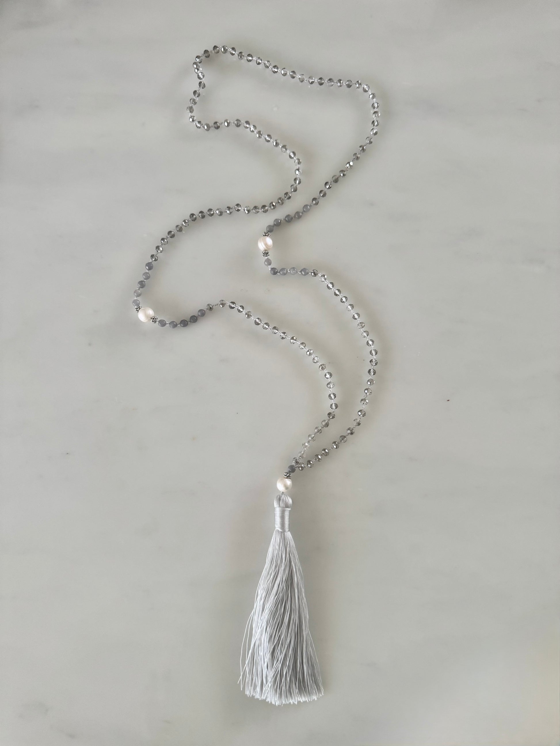 This is one of our classic go to necklaces that you will use over and over. Made up of clear crystals, soft grey agate and white large and small round fresh water pearls. It is finished with a soft grey tassel. Effortlessly elegant it adds a touch of neutral shimmer to your look.