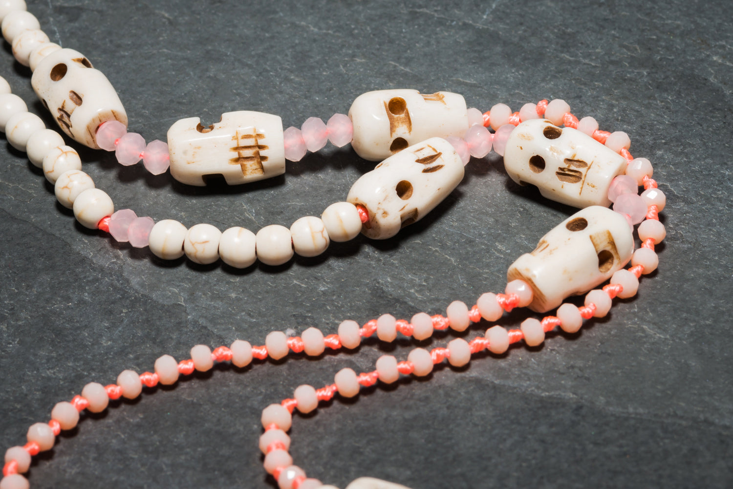 This fabulous piece is hand knotted with fine opaque crystals and ceramic beads in hot coral thread. There are hand carved ethically sourced cow bone skulls used in prayer beads from India at it's centre and the gentle taupe tassel is wrapped in coral thread.