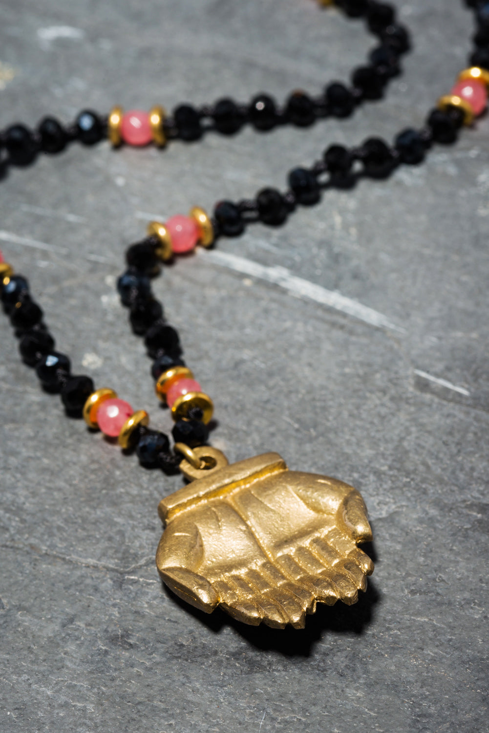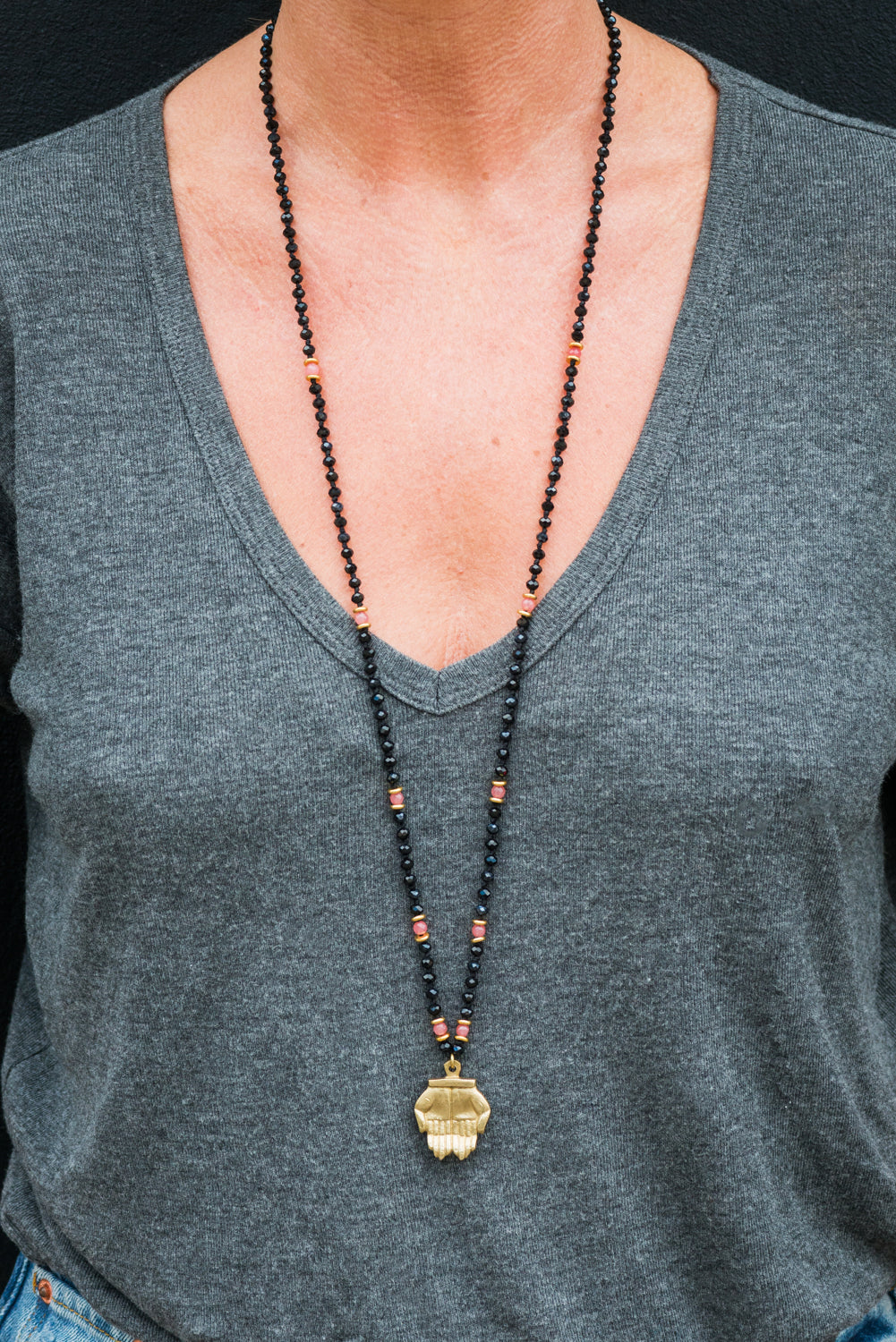 This beautiful, one off version of our Buddha hands pendant in prayer. Hand knotted in dark grey thread. Black and graphite crystals are hand knotted with warm coral agates and inter-dispersed with golden brass discs. The pendant is hand cast in sand and wax by our Maasai artisan from recycled padlocks.