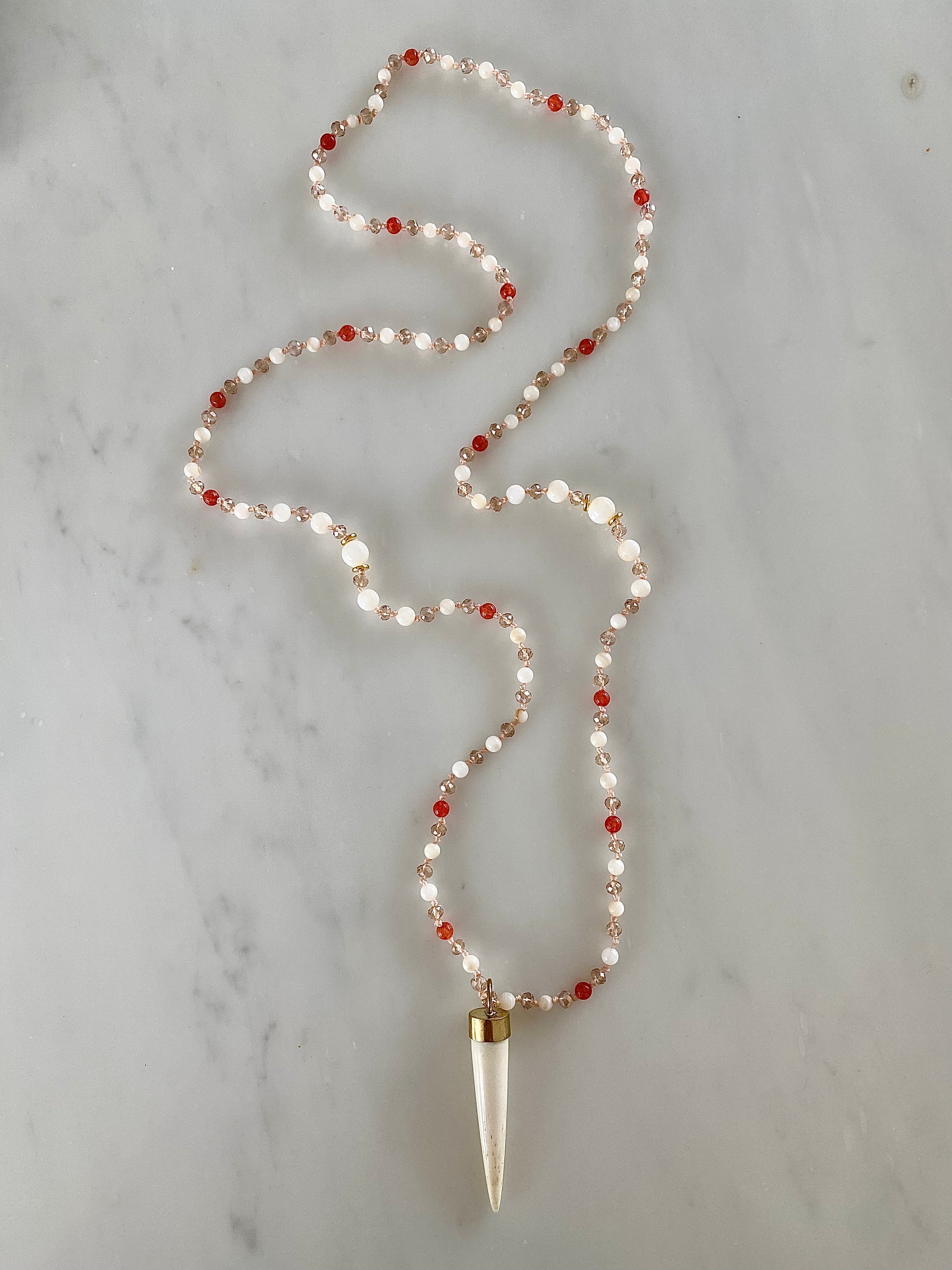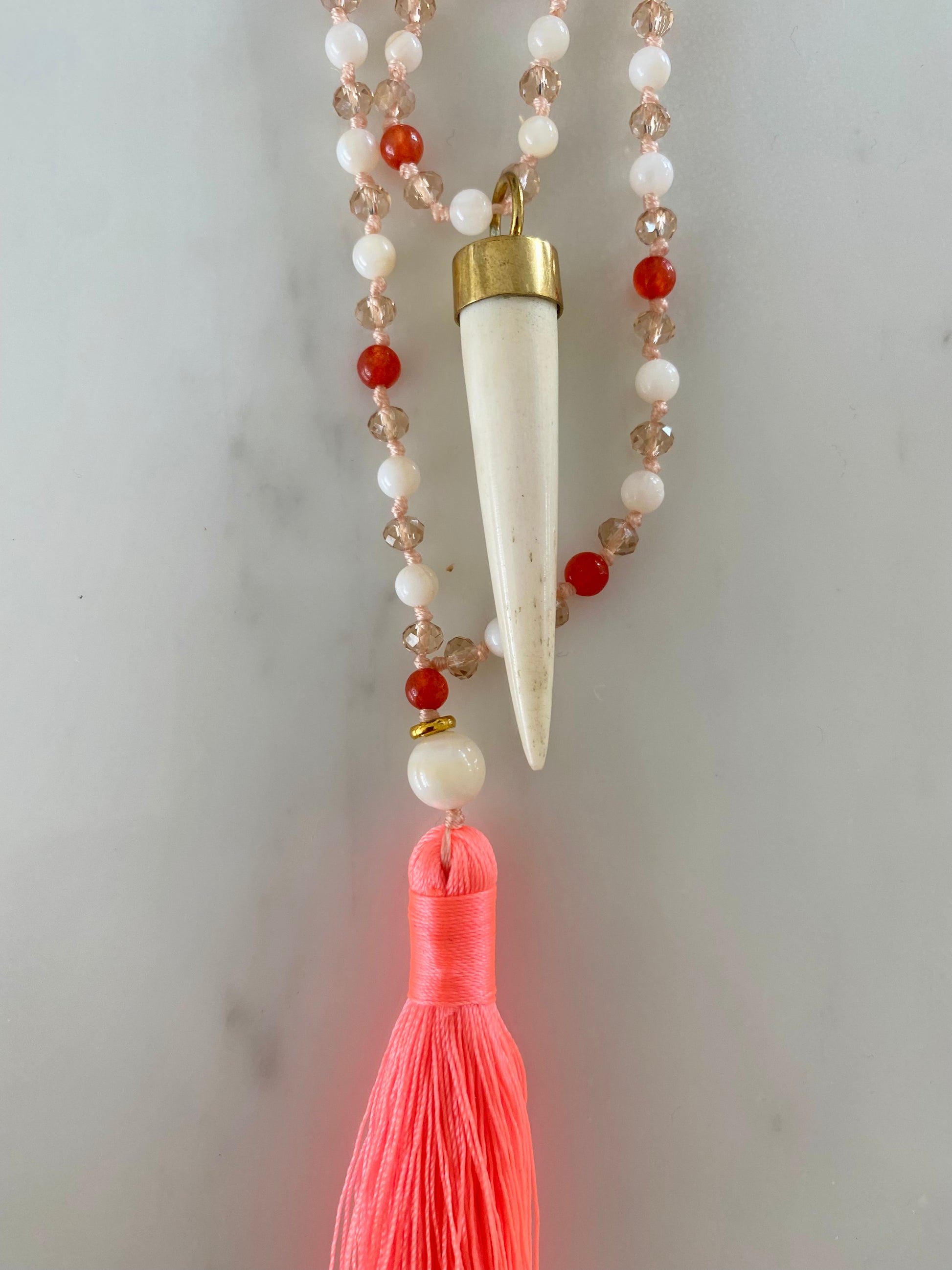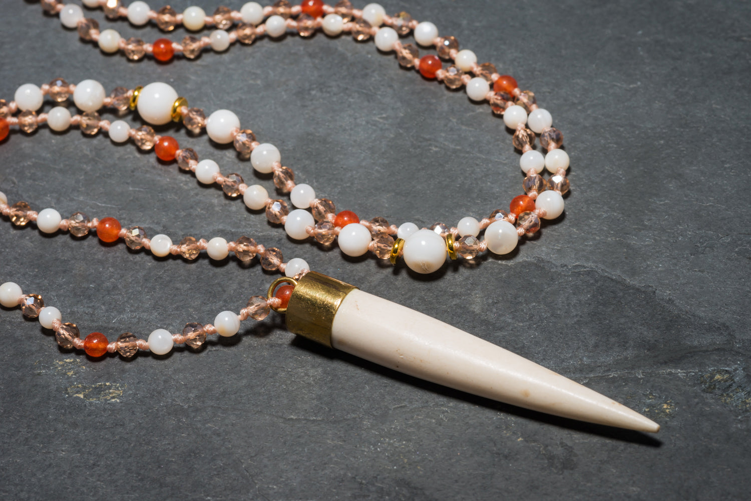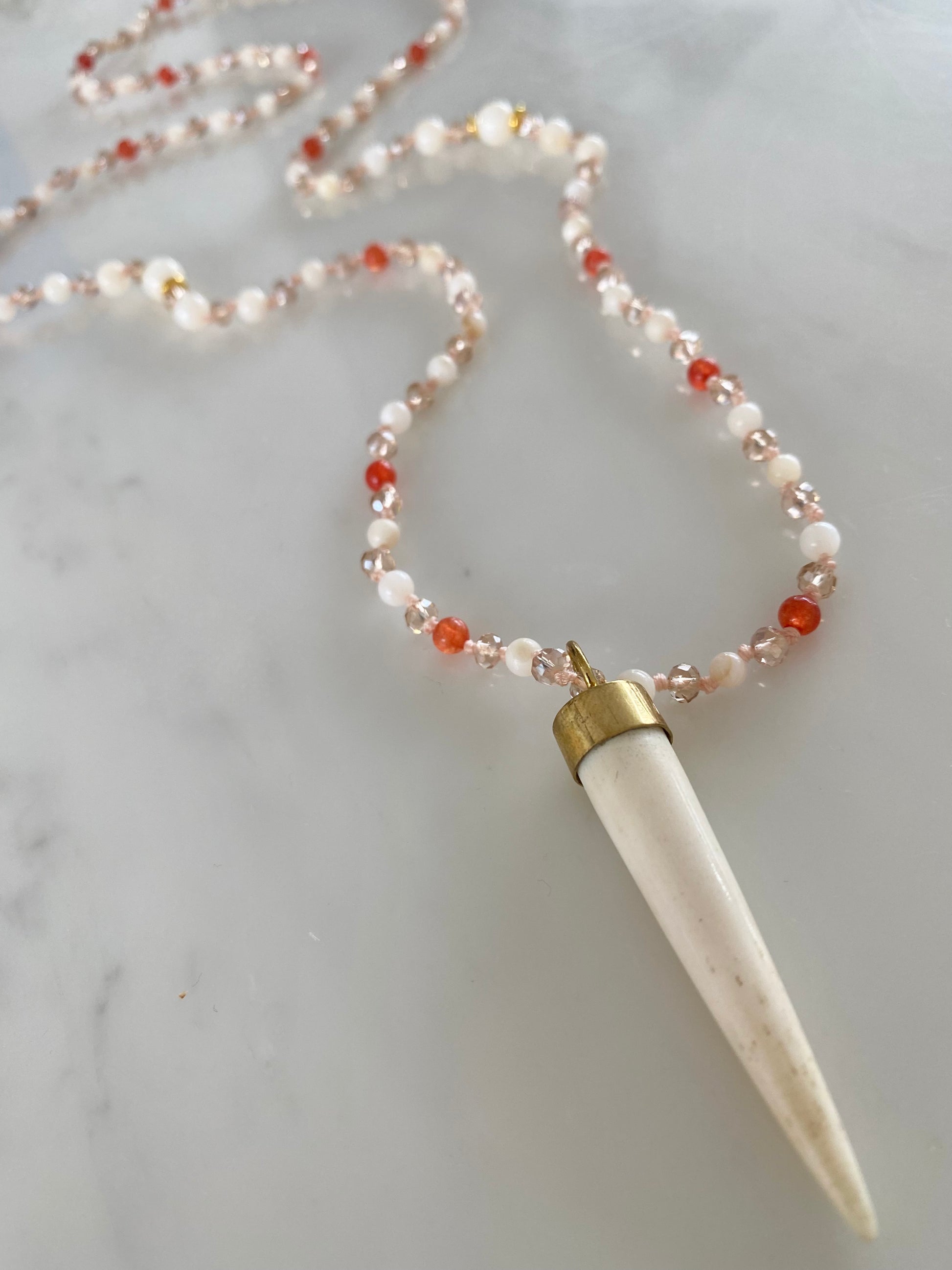 A beautiful Yang energy artisan made tusk necklace. Smooth creamy shell beads are hand knotted with deep coral semi precious agates, champagne crystals and accents of gold. Finished with a white hand carved horn tusk set in hand cast brass.
