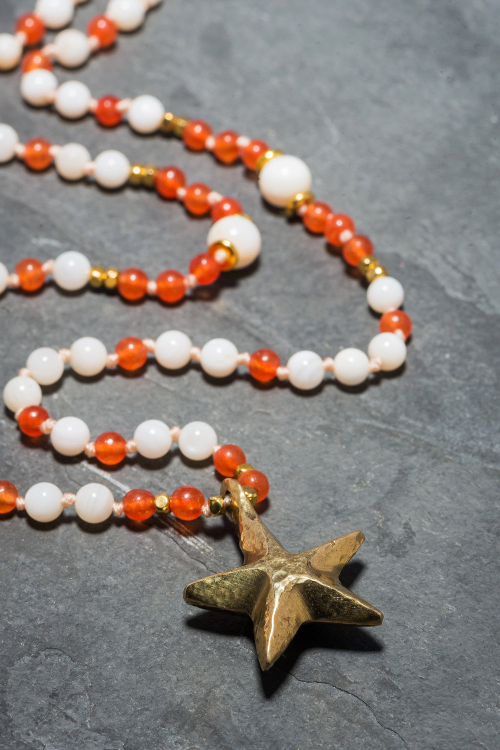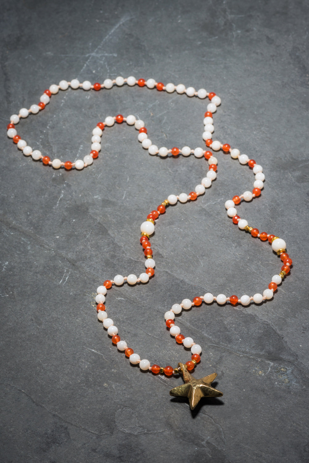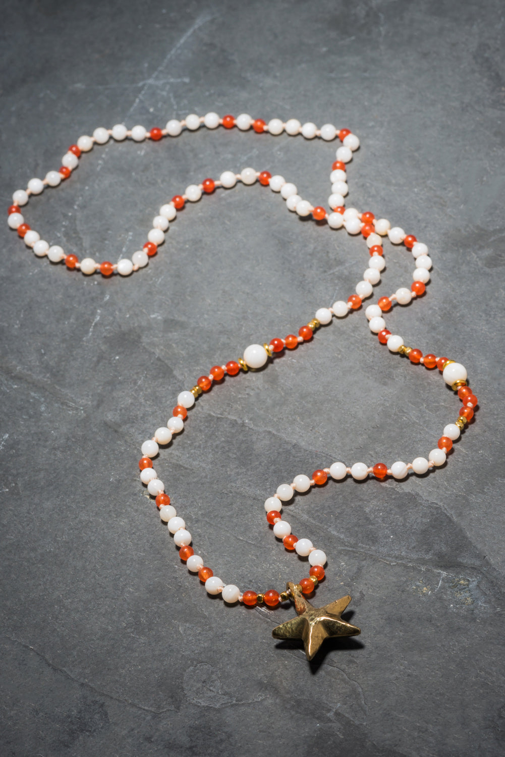 Hand knotted in soft apricot thread with smooth shell beads and deep coral agate, semi precious stones. Golden touches give this beach a sunshine beach and coral beach feel.
