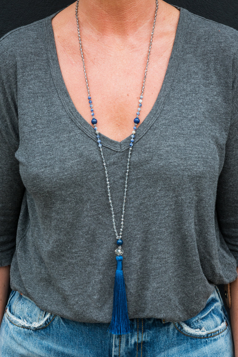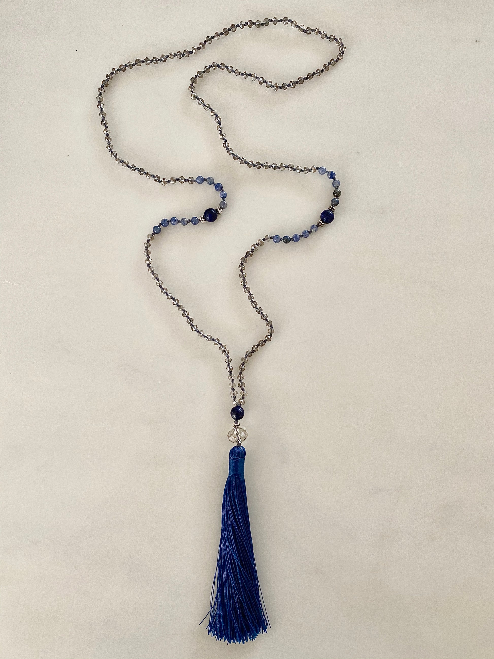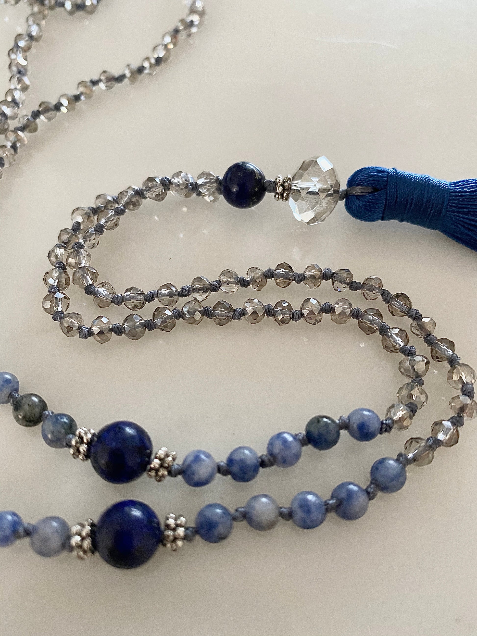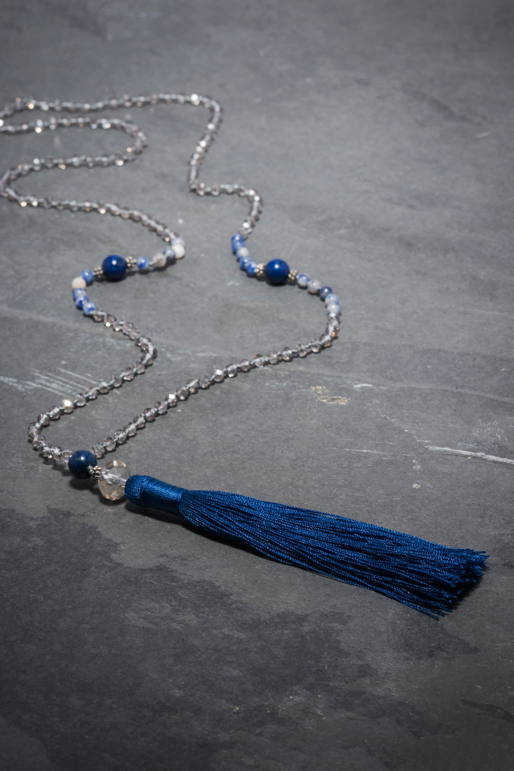 Comprised of transparent crystals knotted together with soft navy thread. At it's centre are lapis lazuli semi precious stones. It is finished with a large lapis lazuli and a large sparkling crystal before the navy tassel.