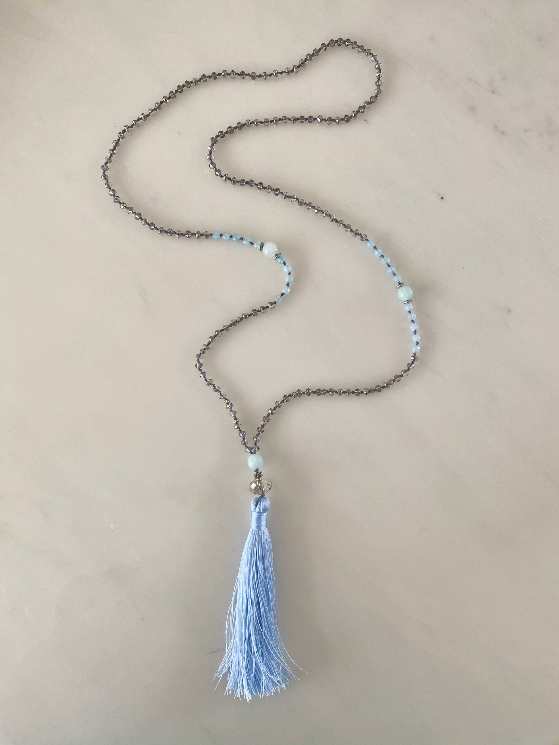 Comprised of transparent crystals knotted together with grey thread. At it's centre are pale blue agate semi precious stones smaller soft blue agates. It is finished with a soft blue agate and a large sparkling crystal before a pale blue tassel.