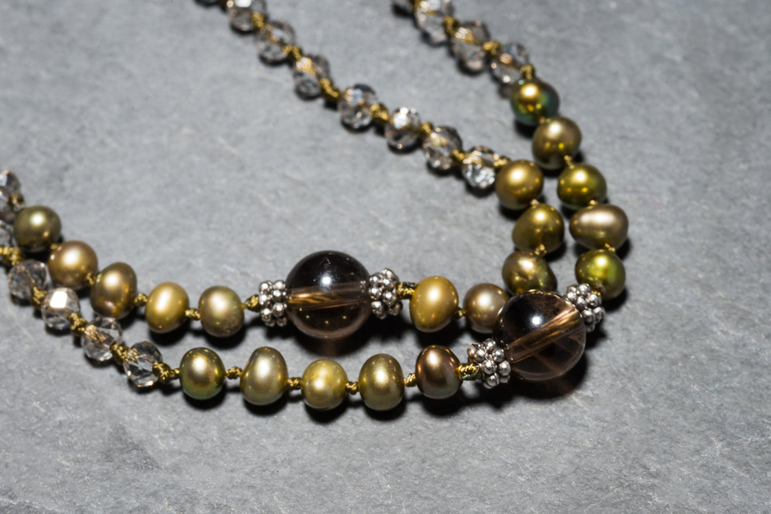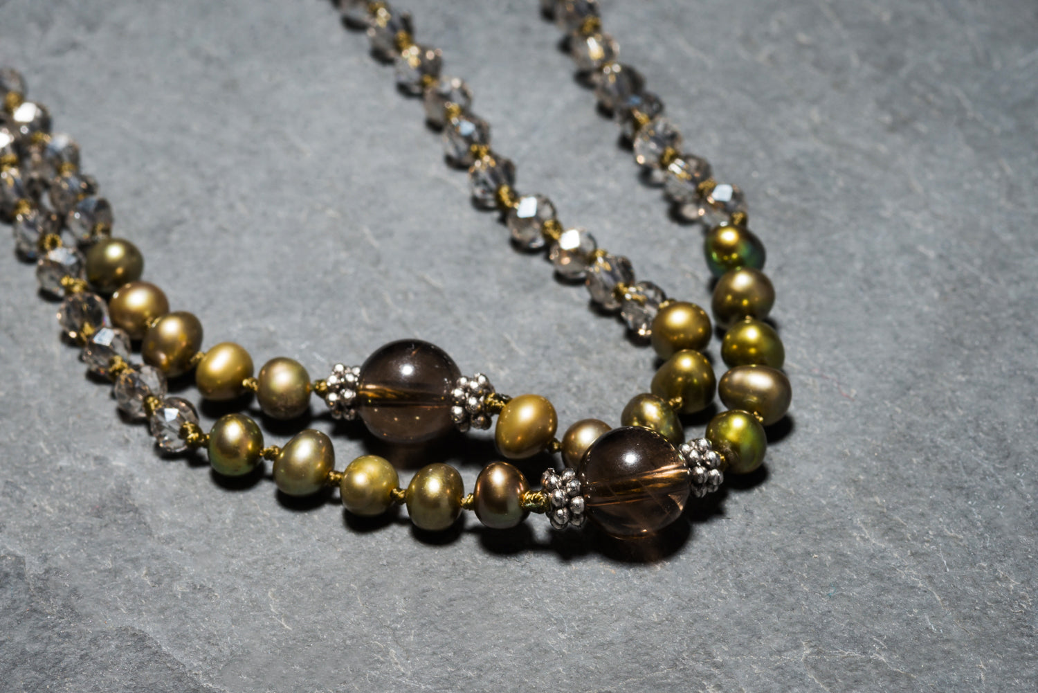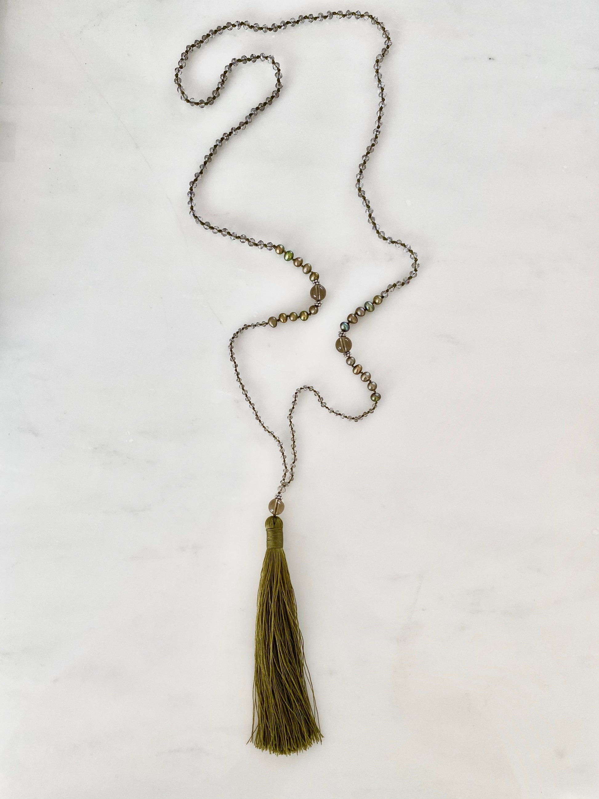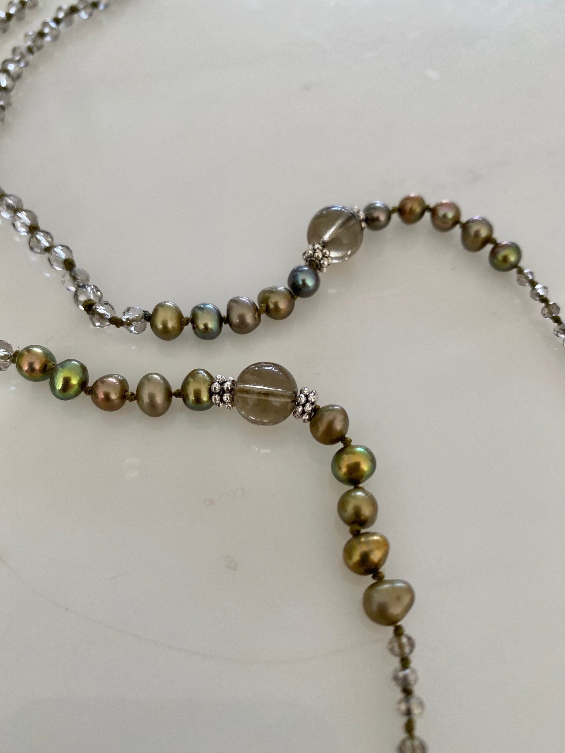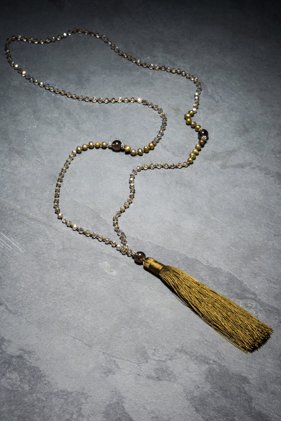 This easy to wear khaki necklace has a gentle, timeless beauty. Inspired by sunlight on the beautiful eagle creek falls, it shimmers gently while the beautiful khaki pearls gently glow. Made up of light clear grey sparkling crystals knotted in khaki green thread. Clear smokey topaz semi precious stones sit next to the beautiful glowing khaki green pearls. The lower section is made of finer crystals with another smokey topaz sitting before the khaki tassel.