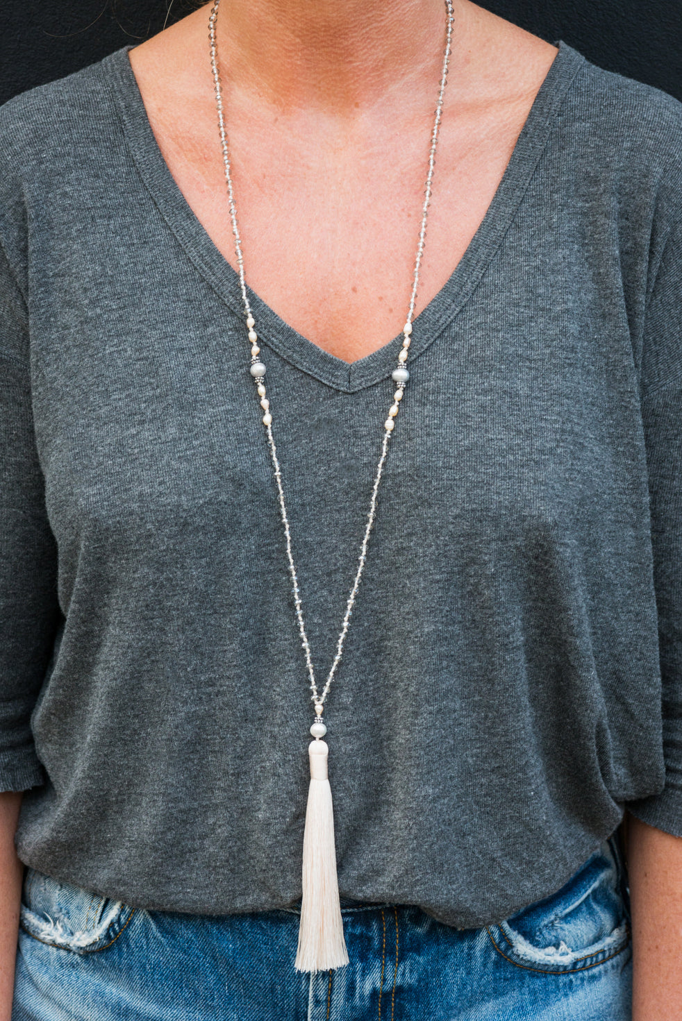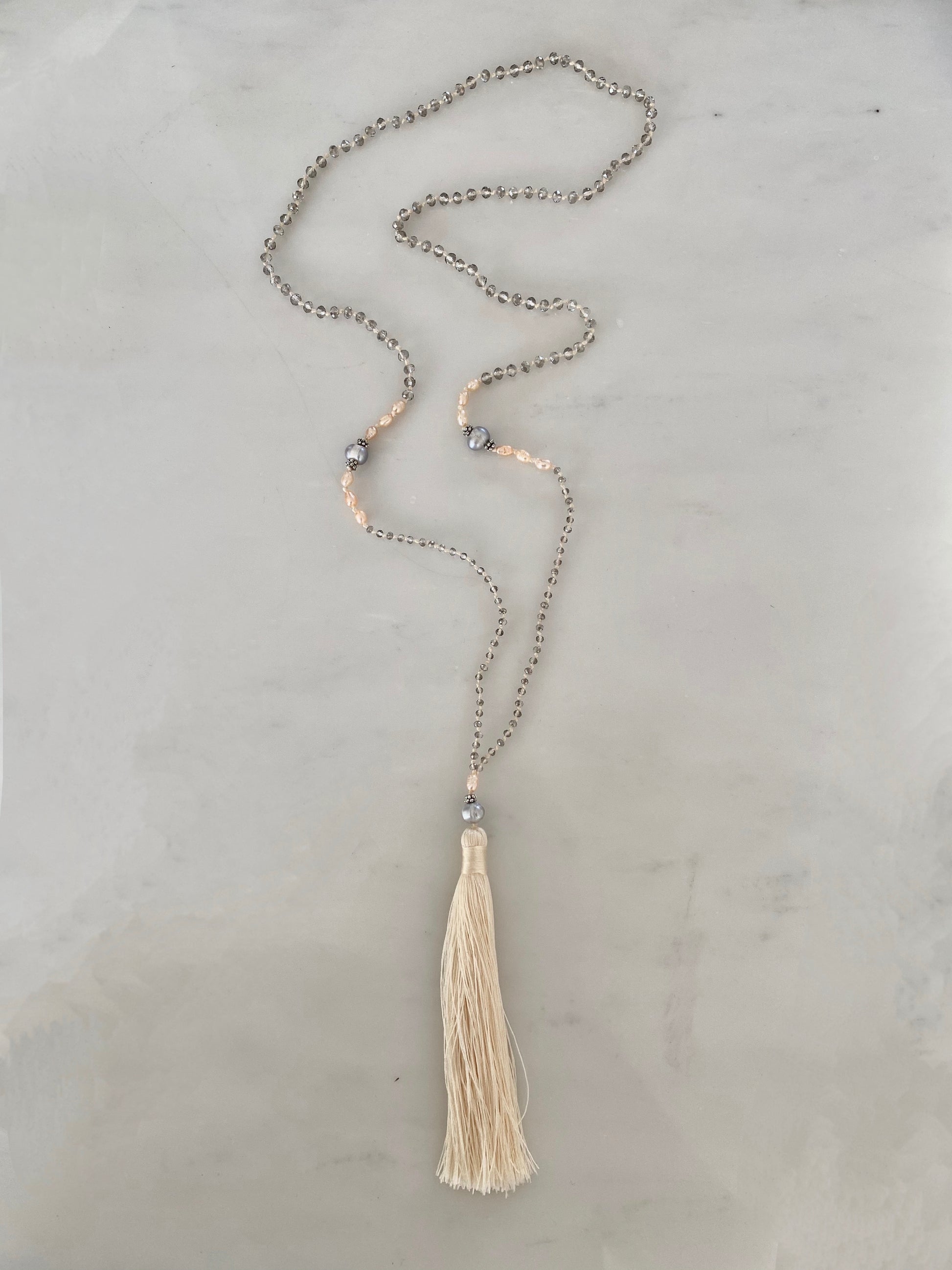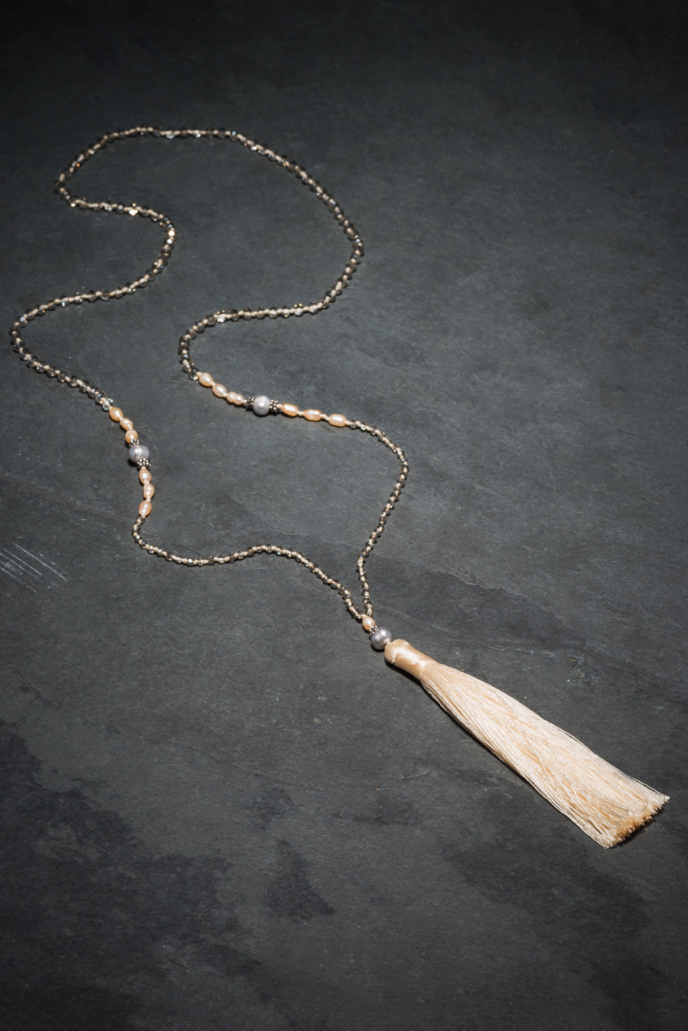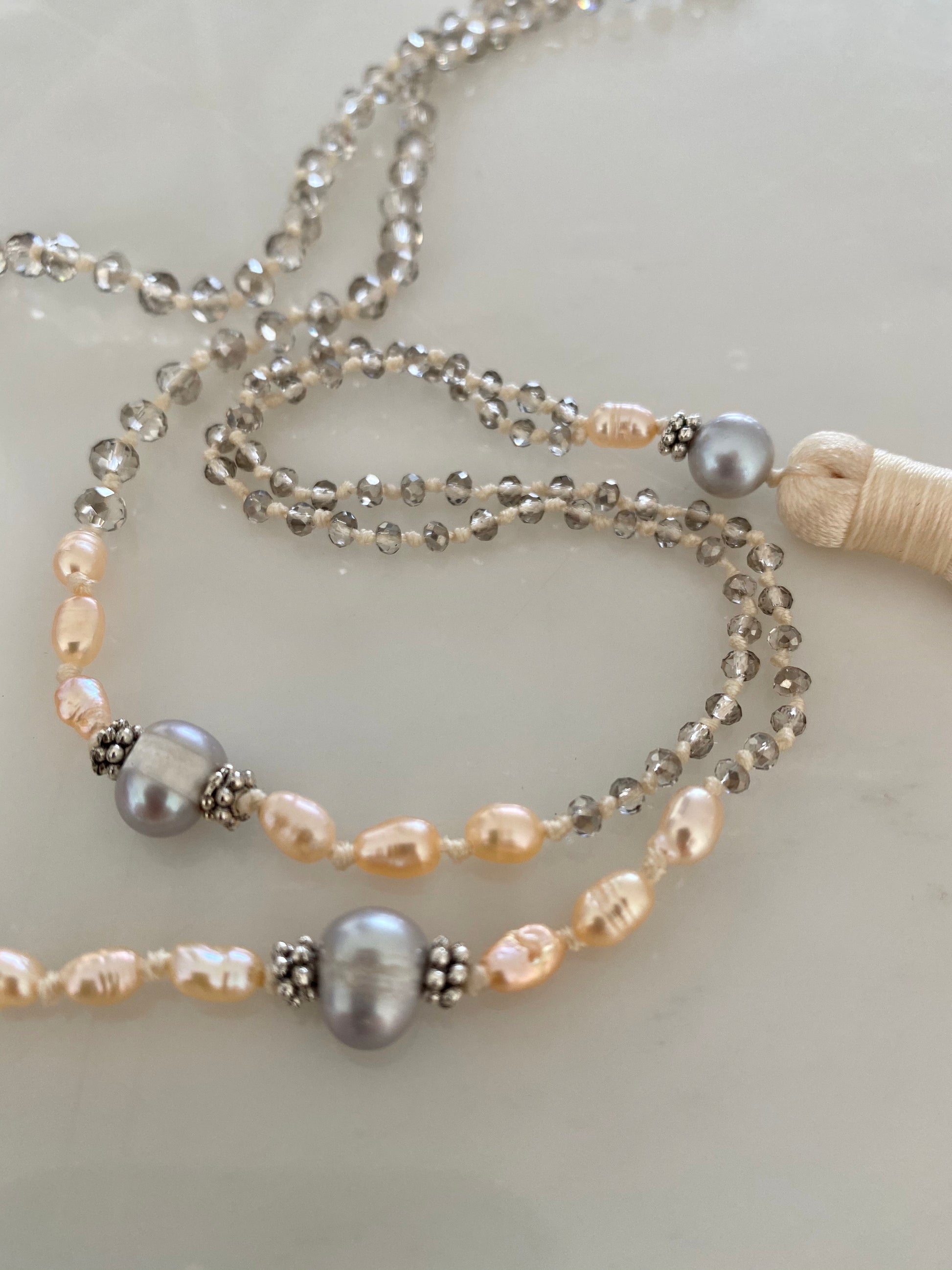 This necklace is reminiscent of early morning sunlight with its light breaking through soft clouds. A combination of shimmering light grey crystals with gentle apricot seed pearls and larger soft grey centres pearls. It is knotted in a light cream thread with more pearls sitting before a cream tassel. Easy to wear and layer with most anything. A grey cashmere to a slinky silly evening top.