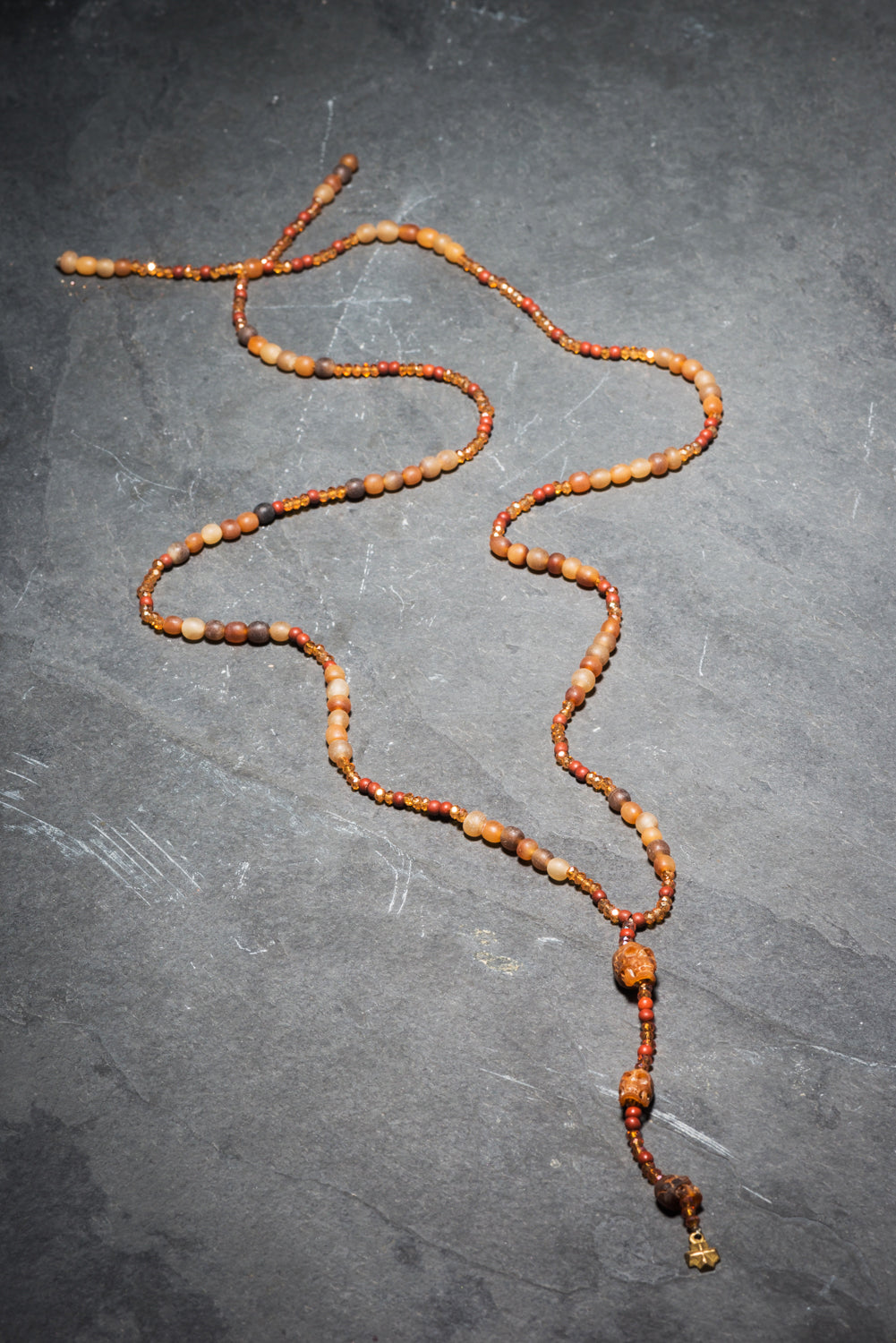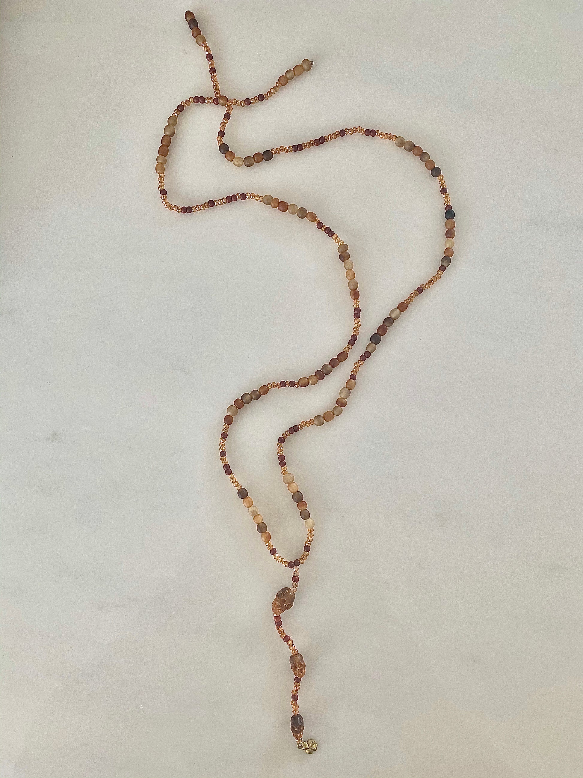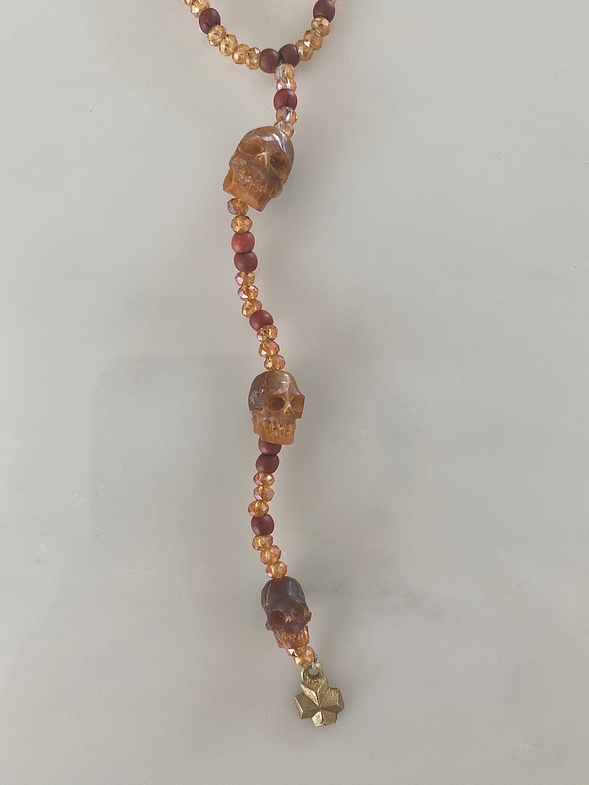 This beautifully handcrafted necklace, embodies a timeless rock and roll, boho vibe. Hand crafted from ethically sourced horn beads, shimmering bronze crystals, and luxurious glowing amber accents, this piece exudes an innate sense of cool. Featuring three meticulously carved skulls, each possessing its own distinctive charm. Finished perfectly with our signature brass navigation symbol logo tag, lending an air of authenticity. The perfect everyday necklace to wear and layer with tassels and other necklaces for a unique wanderlust driven vibe.