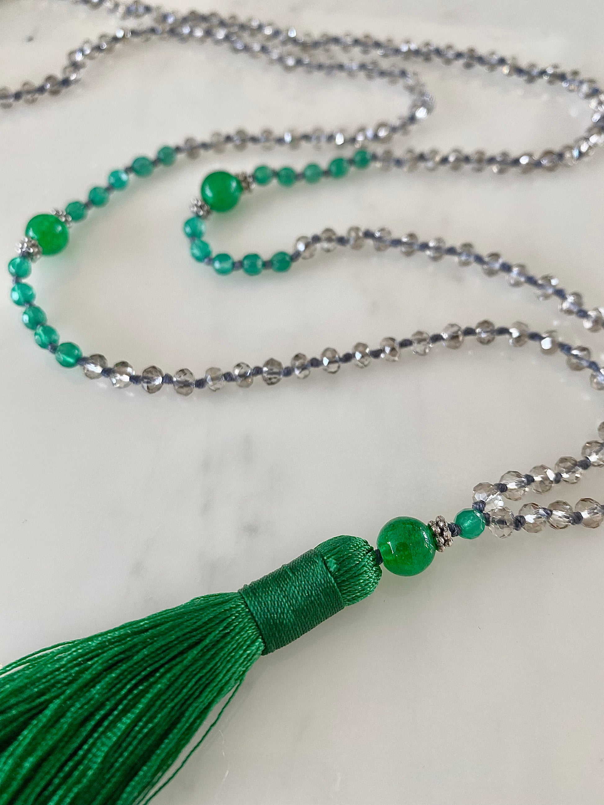 This Beautiful emerald necklace is made up of clear light grey crystals, hand knotted dark grey thread. At it's centre sit large round glowing emerald agates, surrounded with smaller, faceted emerald agate semi precious stones. A further large and small emerald agate sit before the hand made tassel of full emerald. A beautiful splash of rich colour for any time of year.| Approx 56cm in length to end of tassel