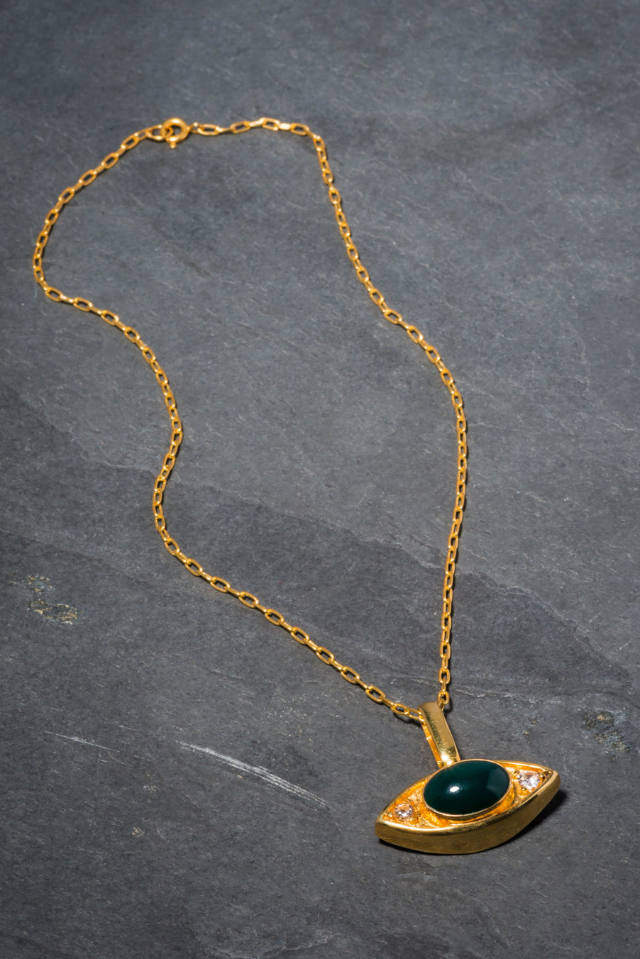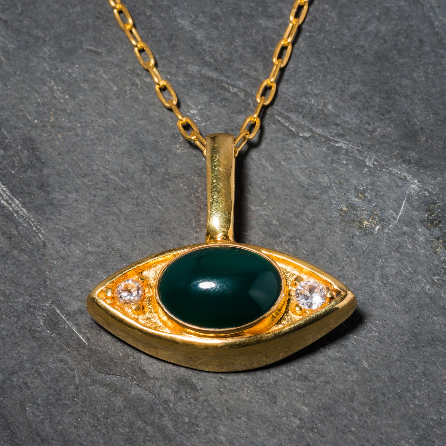 This beautiful statement eye pendant is a one-off. Hand made by our artisan in 925 silver, gold vermeil plated with crystals and deep green agate semi-precious Eye stone.