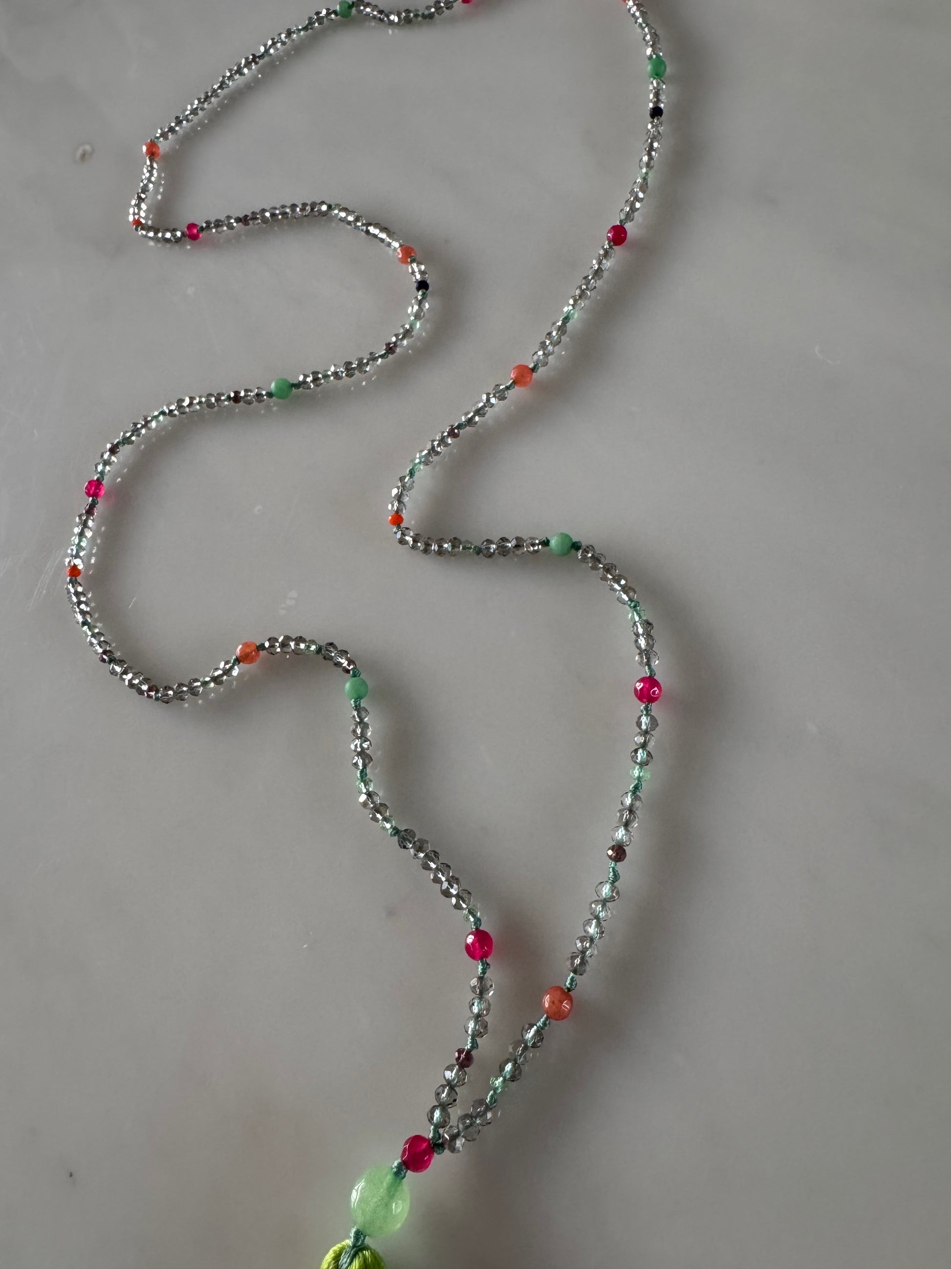 This beautiful new necklace has a rainfall feel to it‘s design, with a scattered mix of greel, pink, orange and blue semi precious stones with crystals All hand knotted and finished with a hand made, burgeoning green tassel.