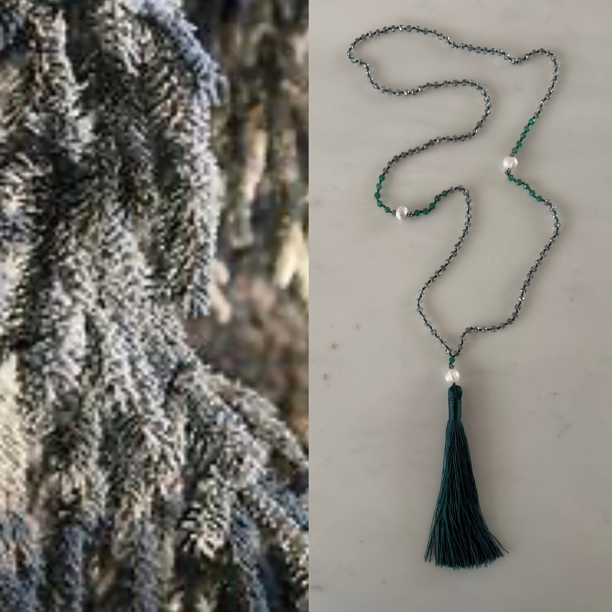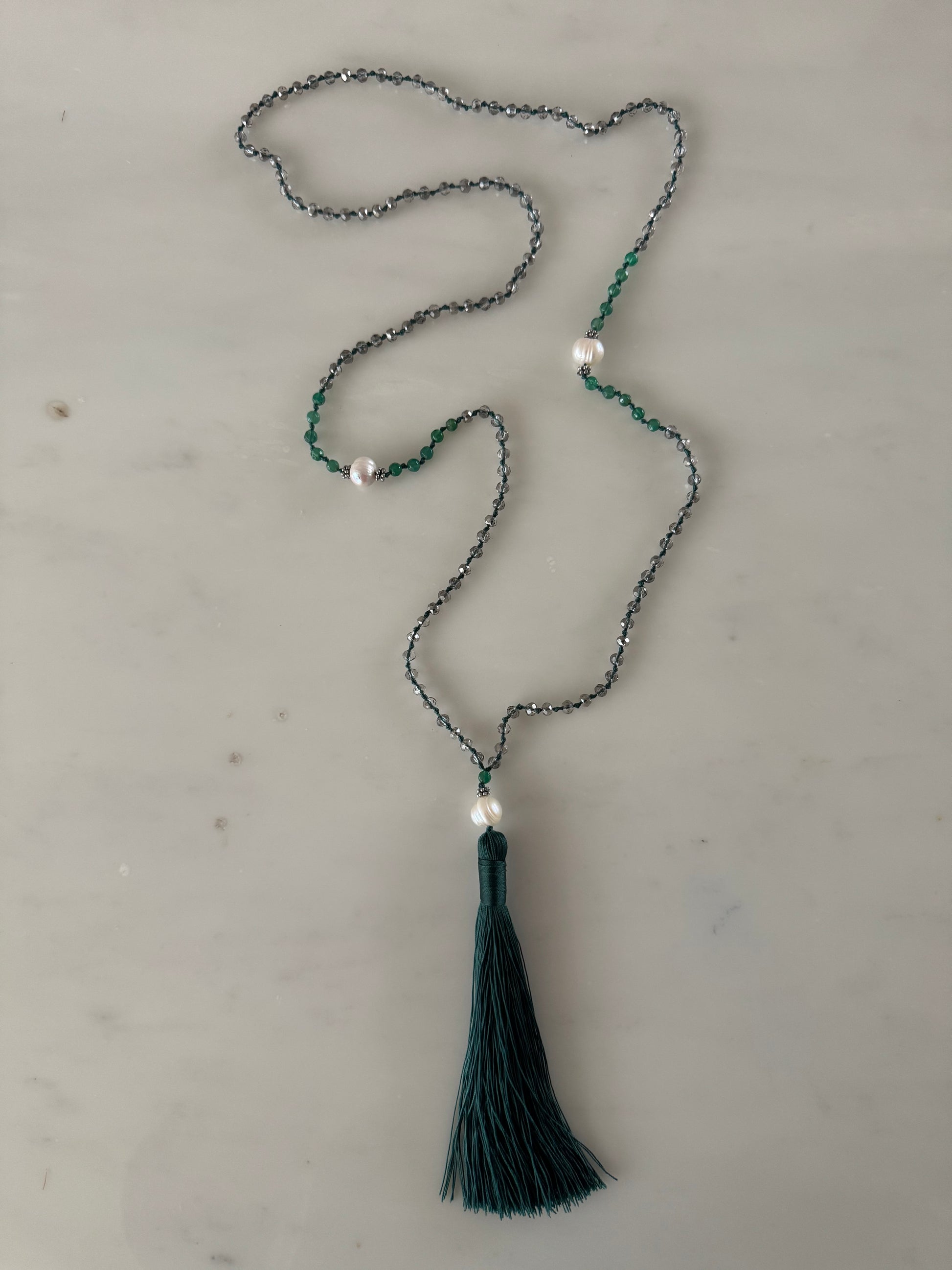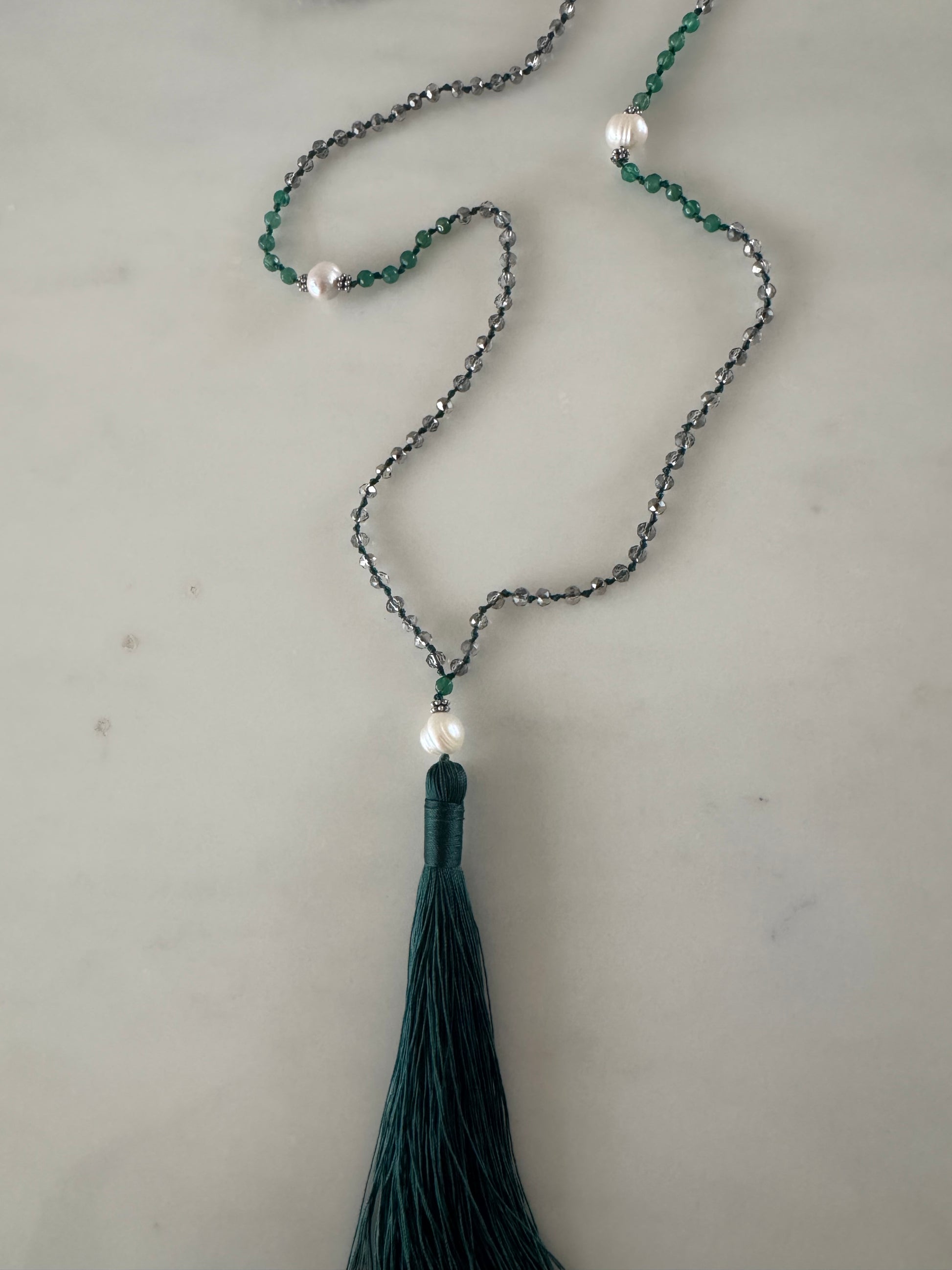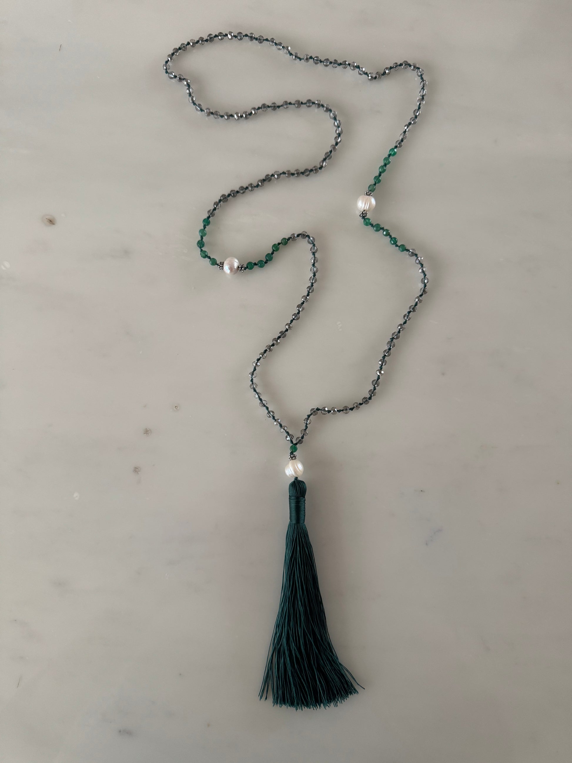 This is one of our classic go to necklace styles that you will use over and over. In a chic dark green it is hand woven with clear grey crystals, deep green agate and glowing white fresh water pearls. It is finished with a derp green tassel. Effortlessly elegant it adds a touch of chic shimmer to your look.