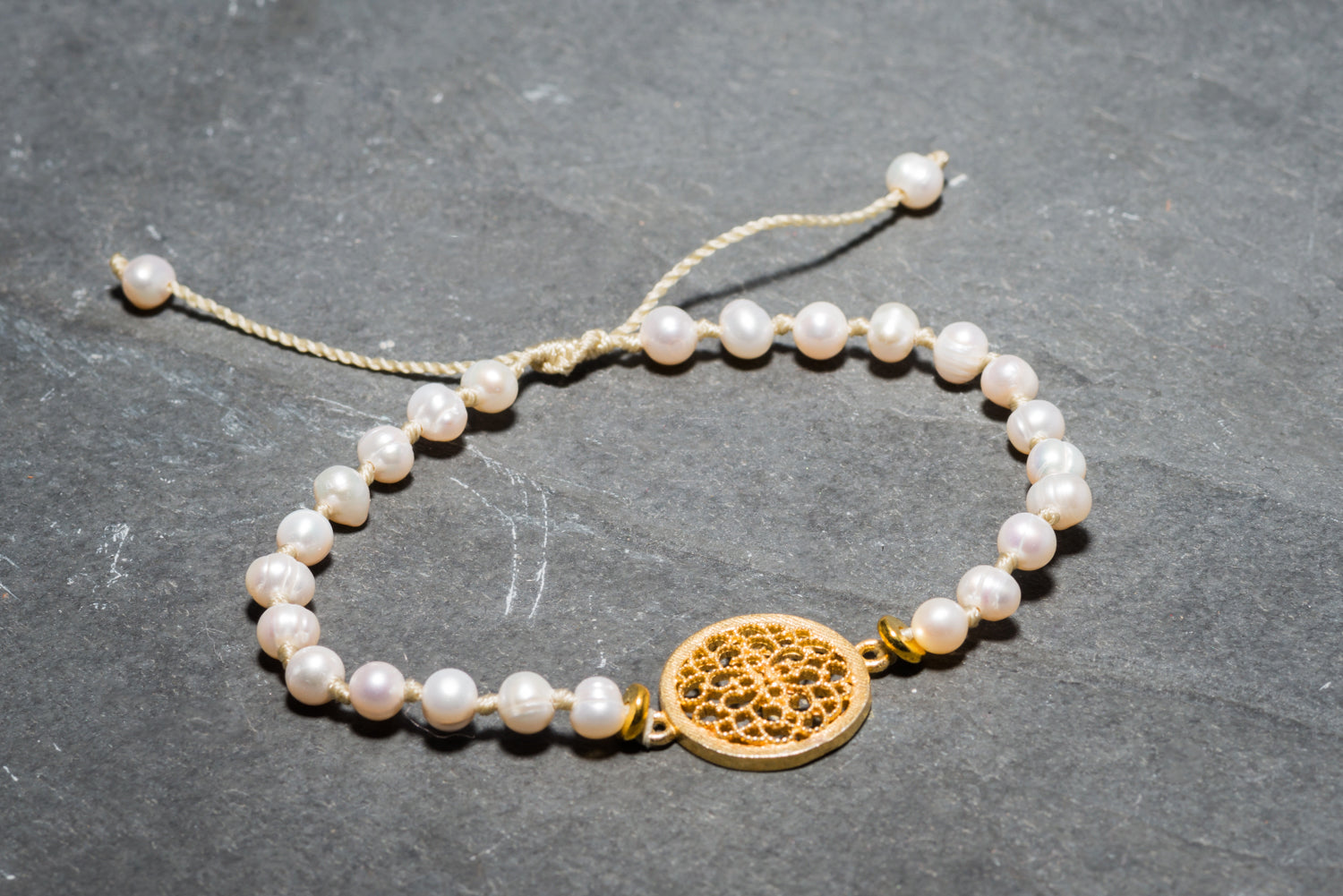 This simple and stunning bracelet is made from large white freshwater pearls, with a 925 silver vermeil, gold plated, filigree mandala, set beside golden rings.