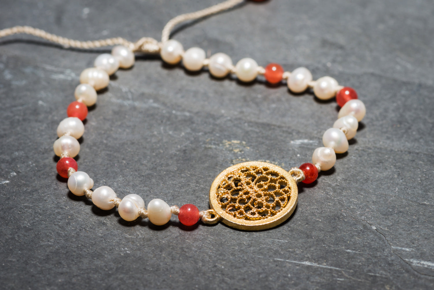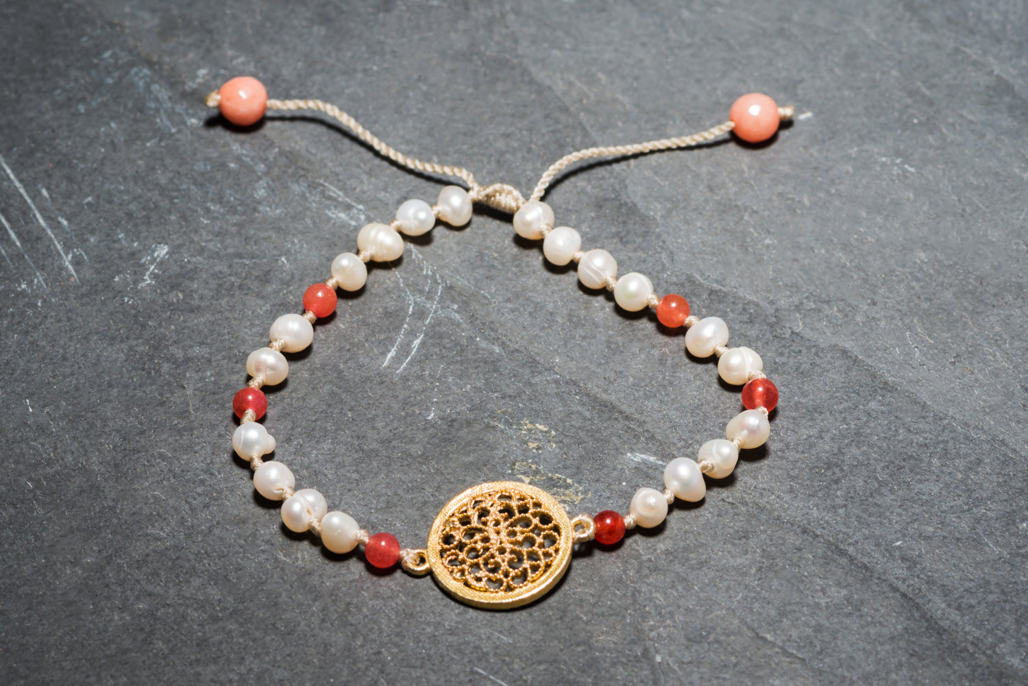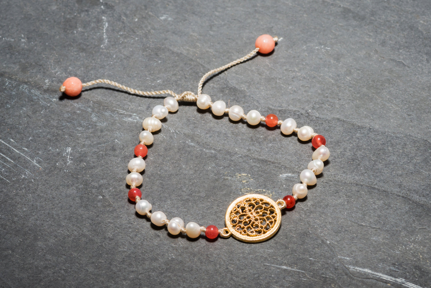 GOLD MANDALA PEARL + CORAL BRACELET