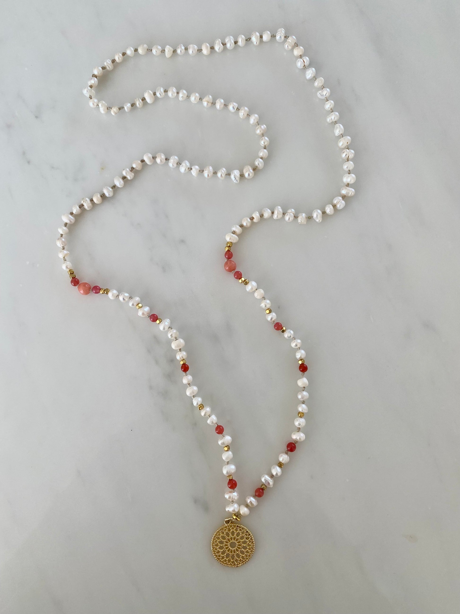 GOLD MANDALA PEARL + CORAL NECKLACE