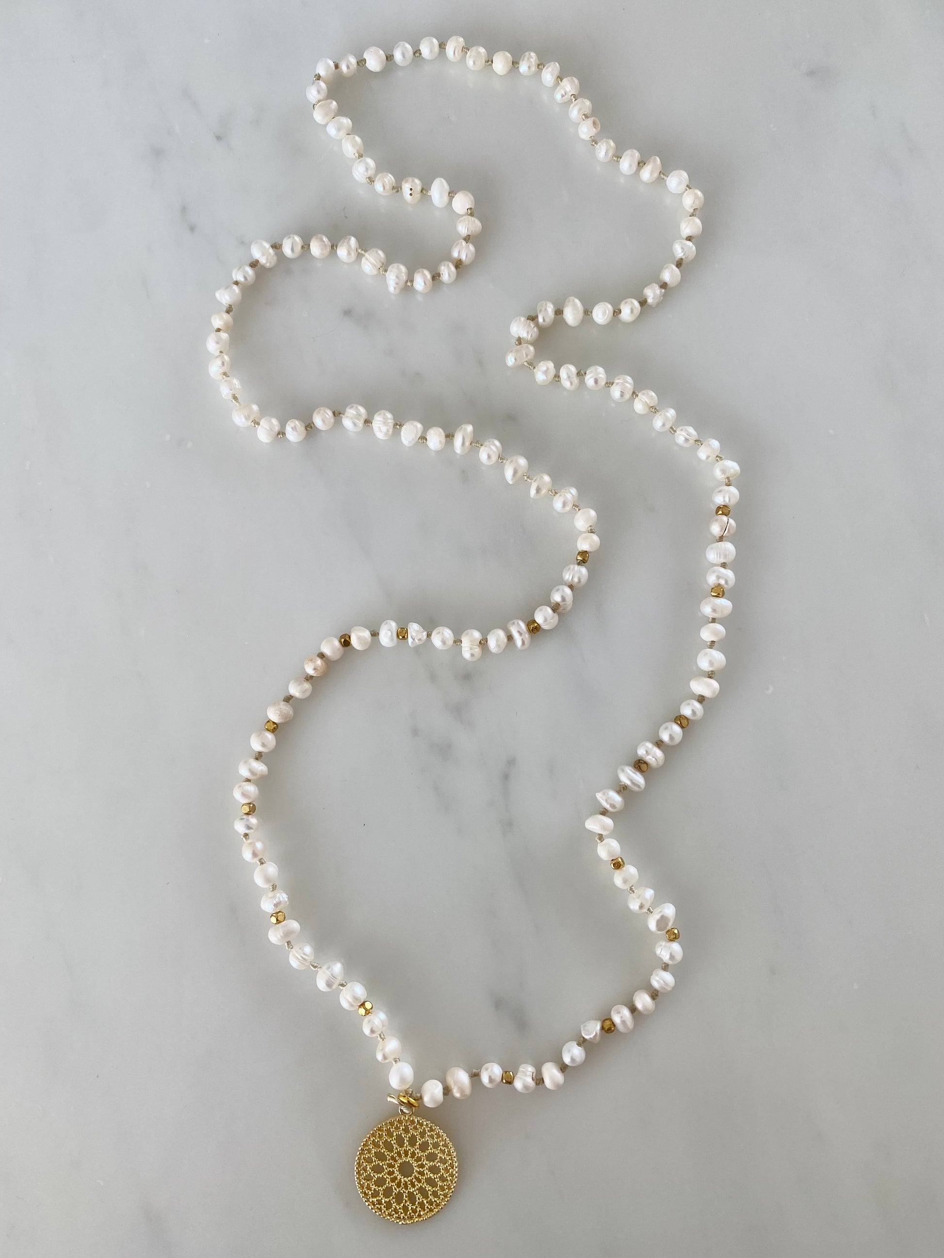 This simple and stunning necklace is made from rustic white freshwater pearls, inter dispersed with golden accents, all hand knotted in taupe thread. At the end is a 925 silver vermeil, gold plated, filigree mandala.