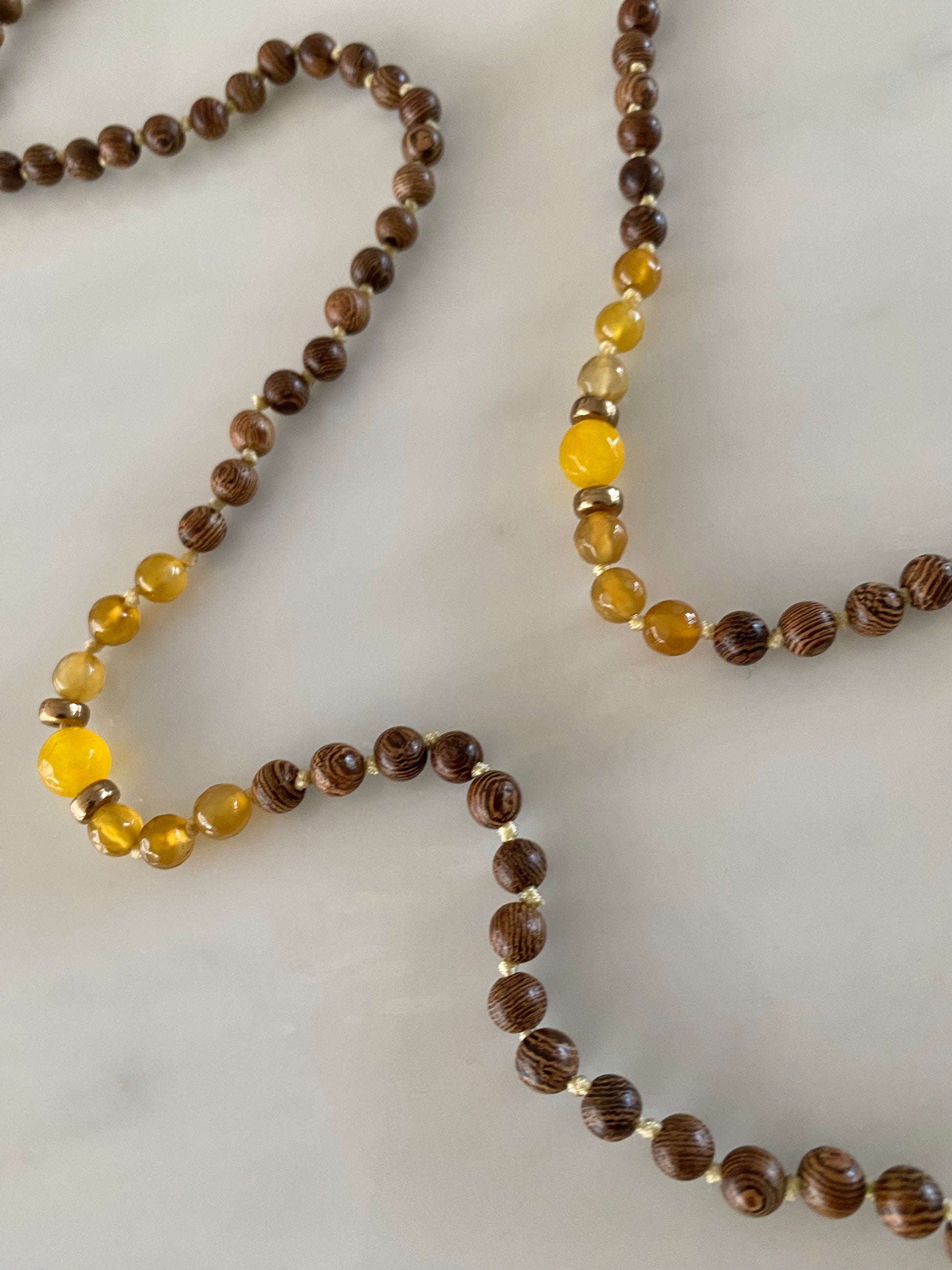This is an extremely chic and elegant necklace. A glow of sunlight Jasper is set against beautiful smooth rich wood beads and finished with an almost antique looking soft yellow silk tassel.