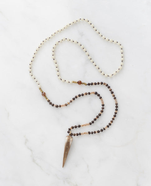 Named after a Kenyan tribe this pendant is made up of hand blown glass beads, wood beads, fine beige crystals. The centre beads are carnelian and the pendent is a shaped more delicate horn pendant inset with brass dots.