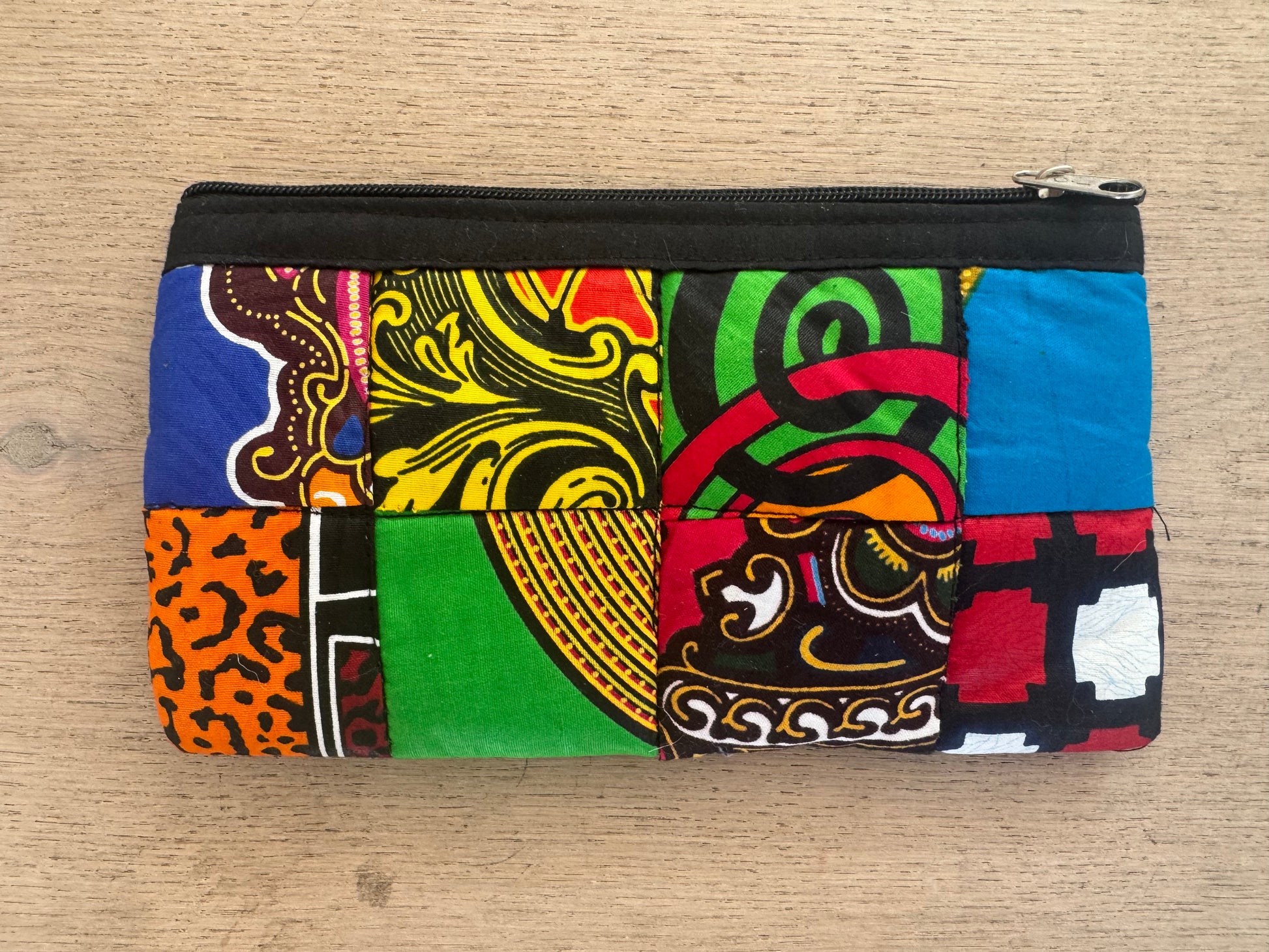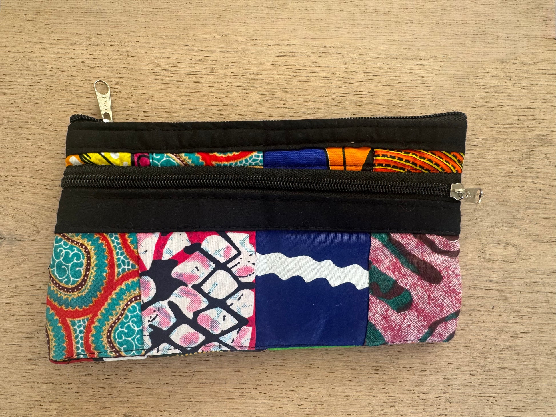 A bright and beautiful padded pouch hand made from traditional kitenge fabrics. The perfect solution to keep your jewels safe while travelling, A zip close and another front section with zip and a simple black interior.