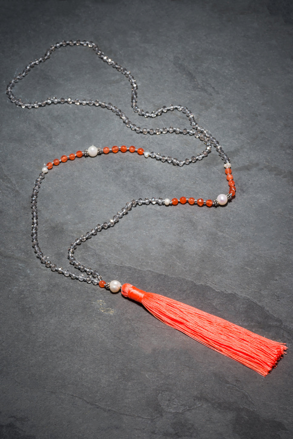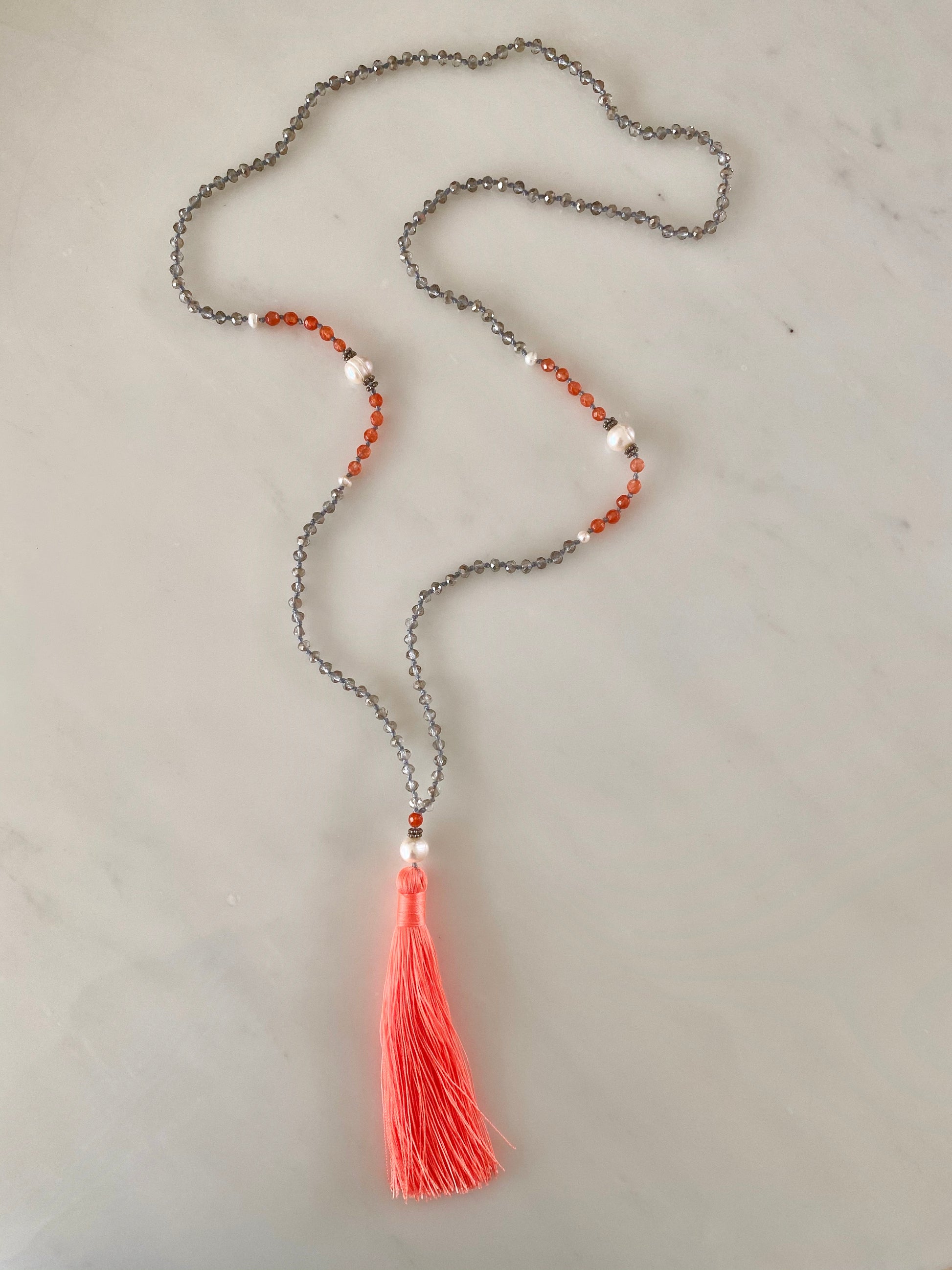 This is the new hot coral version of one of our classic go to necklaces. Made up of clear crystals hand knotted in soft grey, it has soft coral agate and white large and small round fresh water pearls. Finished with a hot coral tassel. The perfect summer piece!