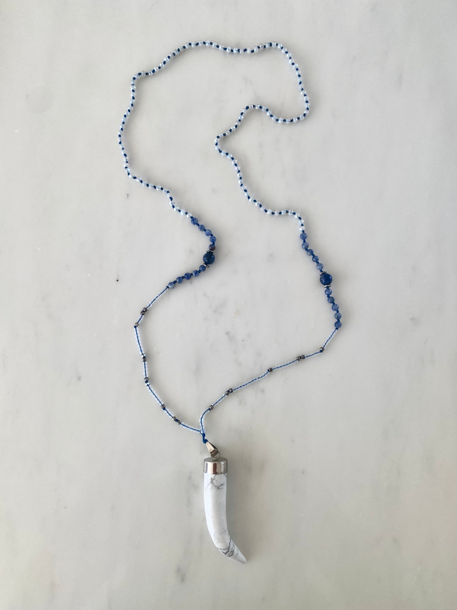 This weighty Tusk Pendant is perfect for summer travels. Made of white veined howlite with central lapis lazuli semi precious stones against silvery discs. Fine opaque crystals are interspersed with silvery cubic beads in the lower section. Rich blue lapis lazuli semi precious stones sit as it's centre above which opaque sparkling crystals sit. It has a satisfyingly weighty feel, wear alone or layer with tassel.