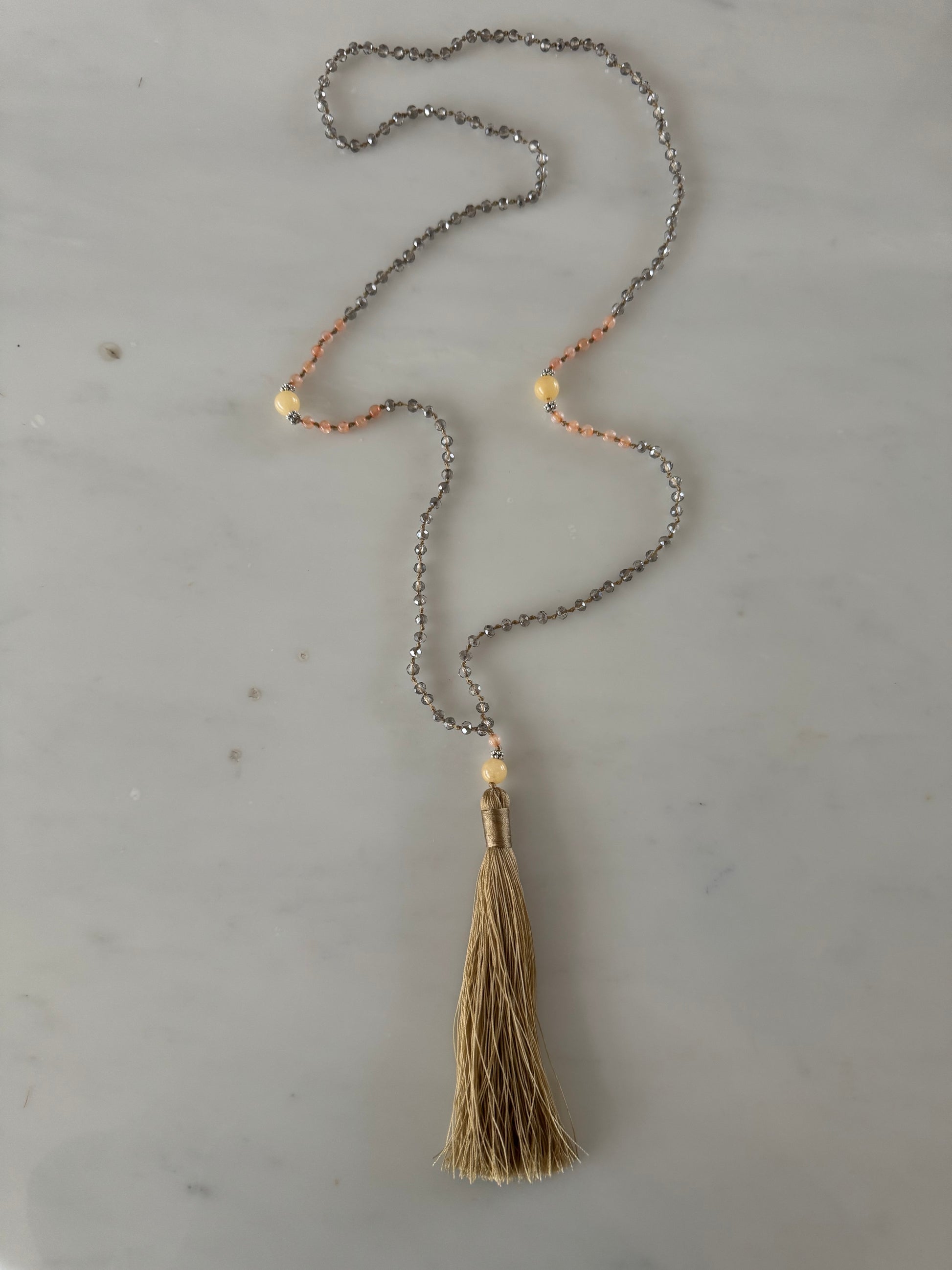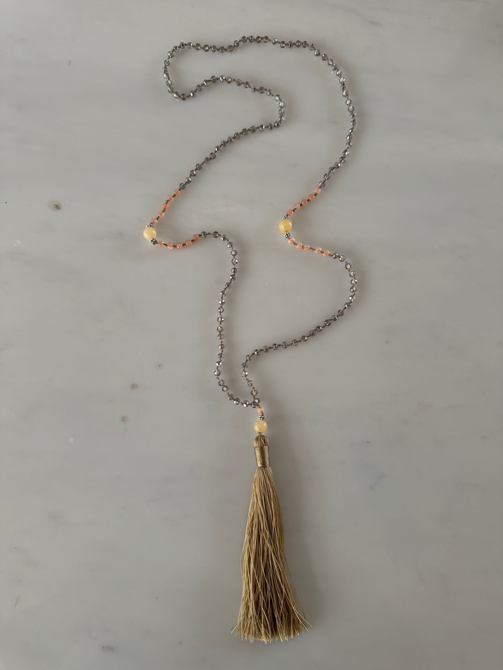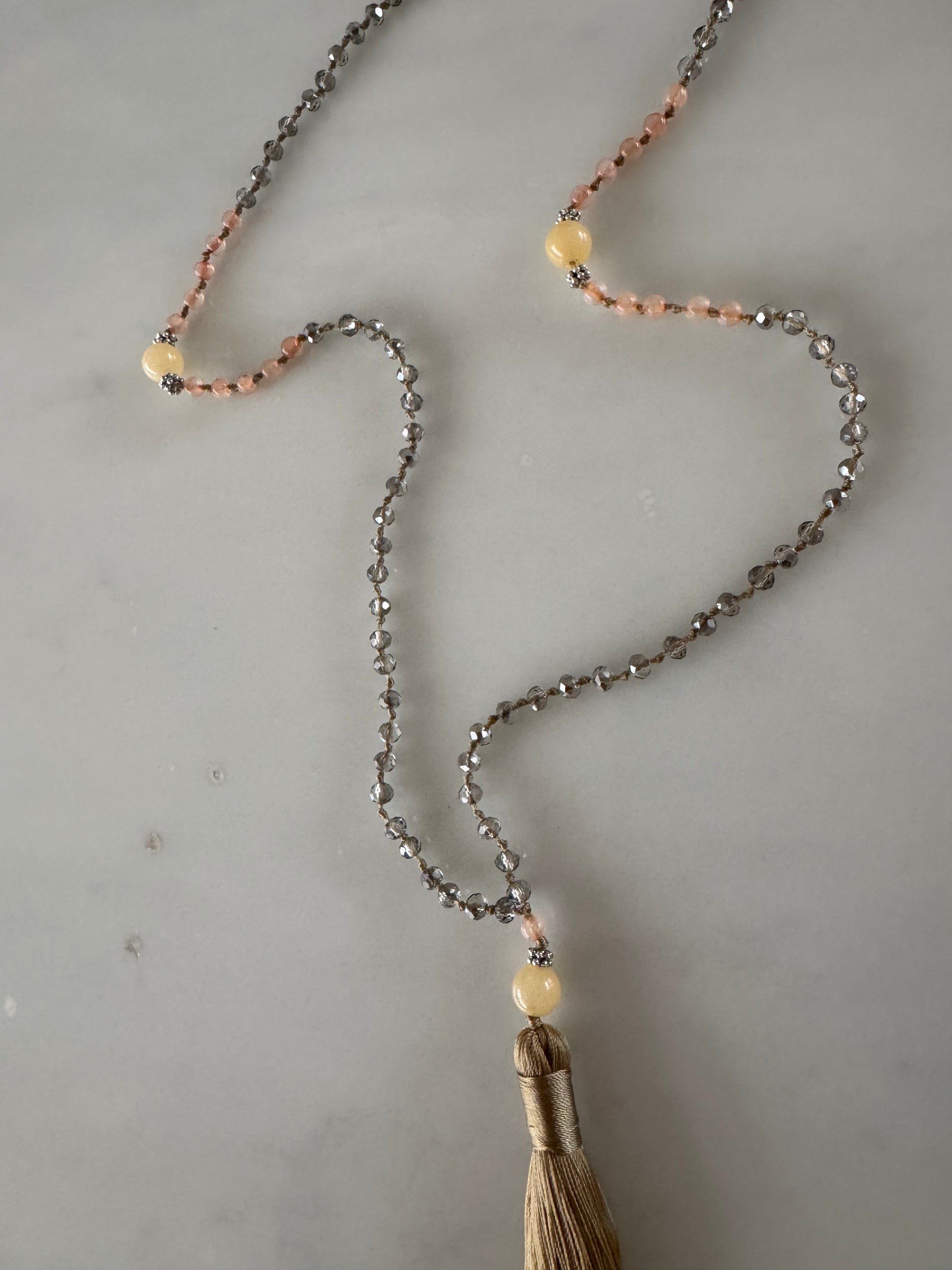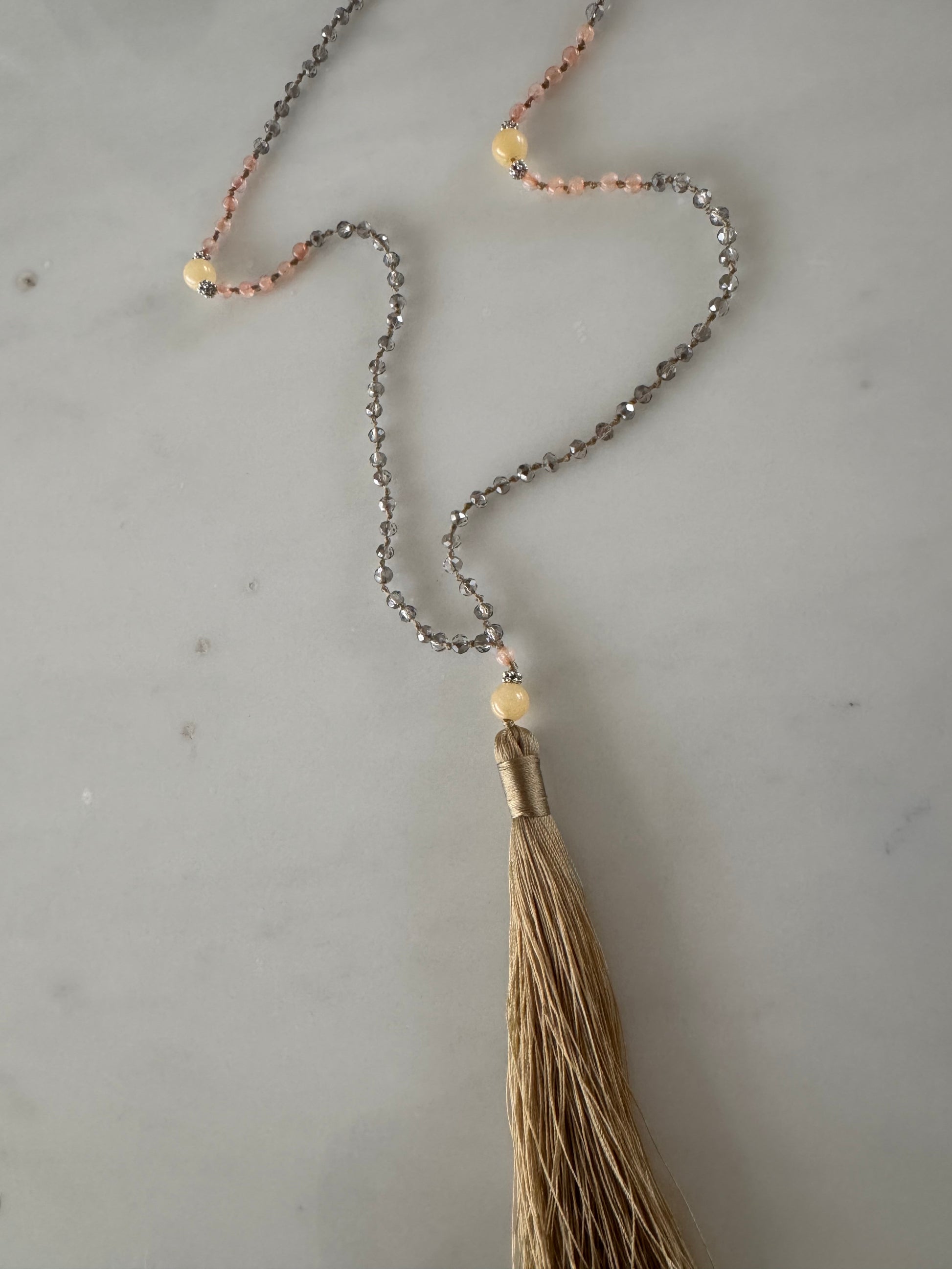 A sandy and warm neutral necklace. A combination of shimmering light transparent grey coloured crystals hand knotted in warm sandy thread. At its centre sit smooth, light beige agate surrounded by smaller faceted pinky beige agates. Two further large and small agates sit before a simple sand tone tassel.