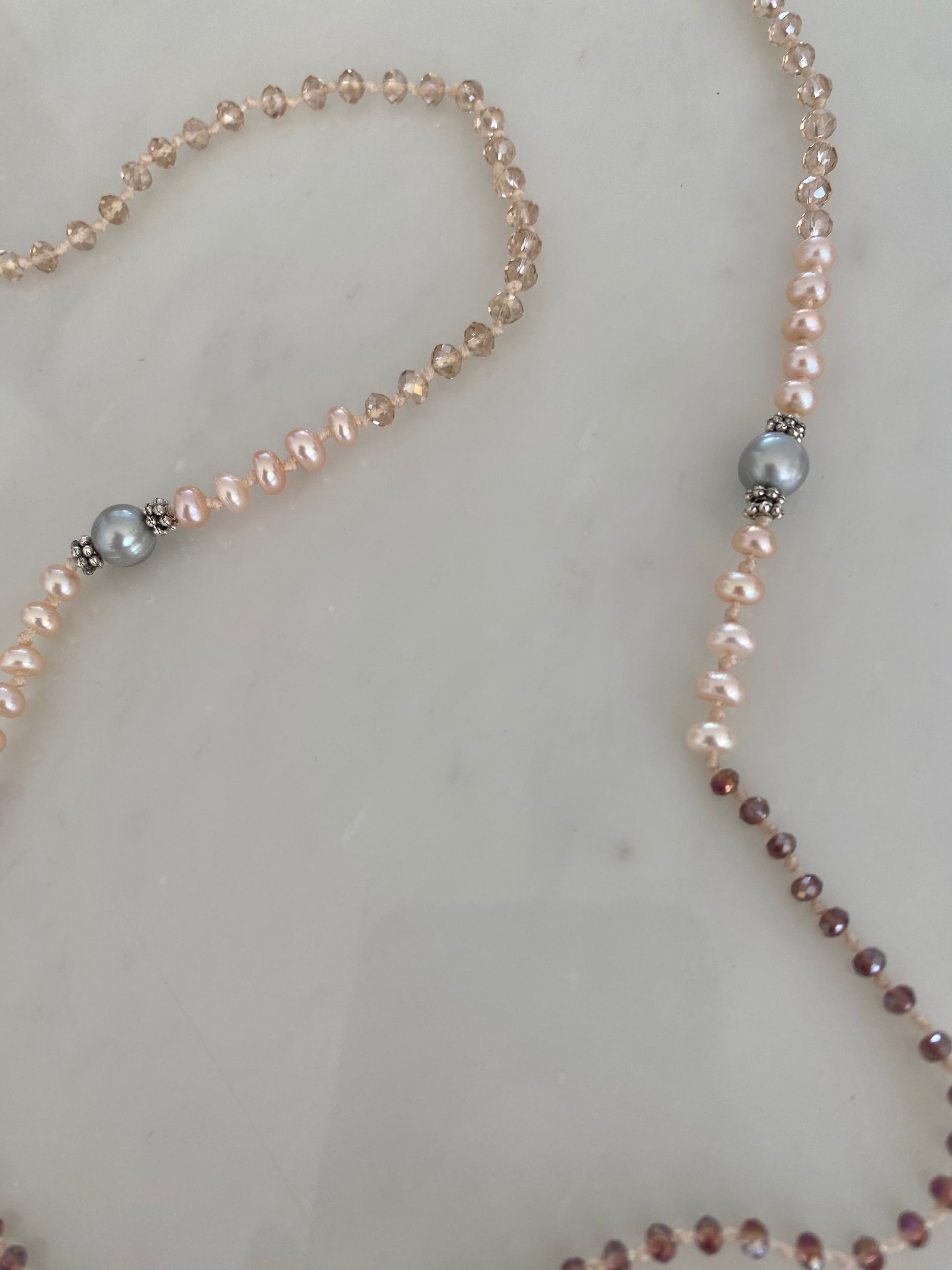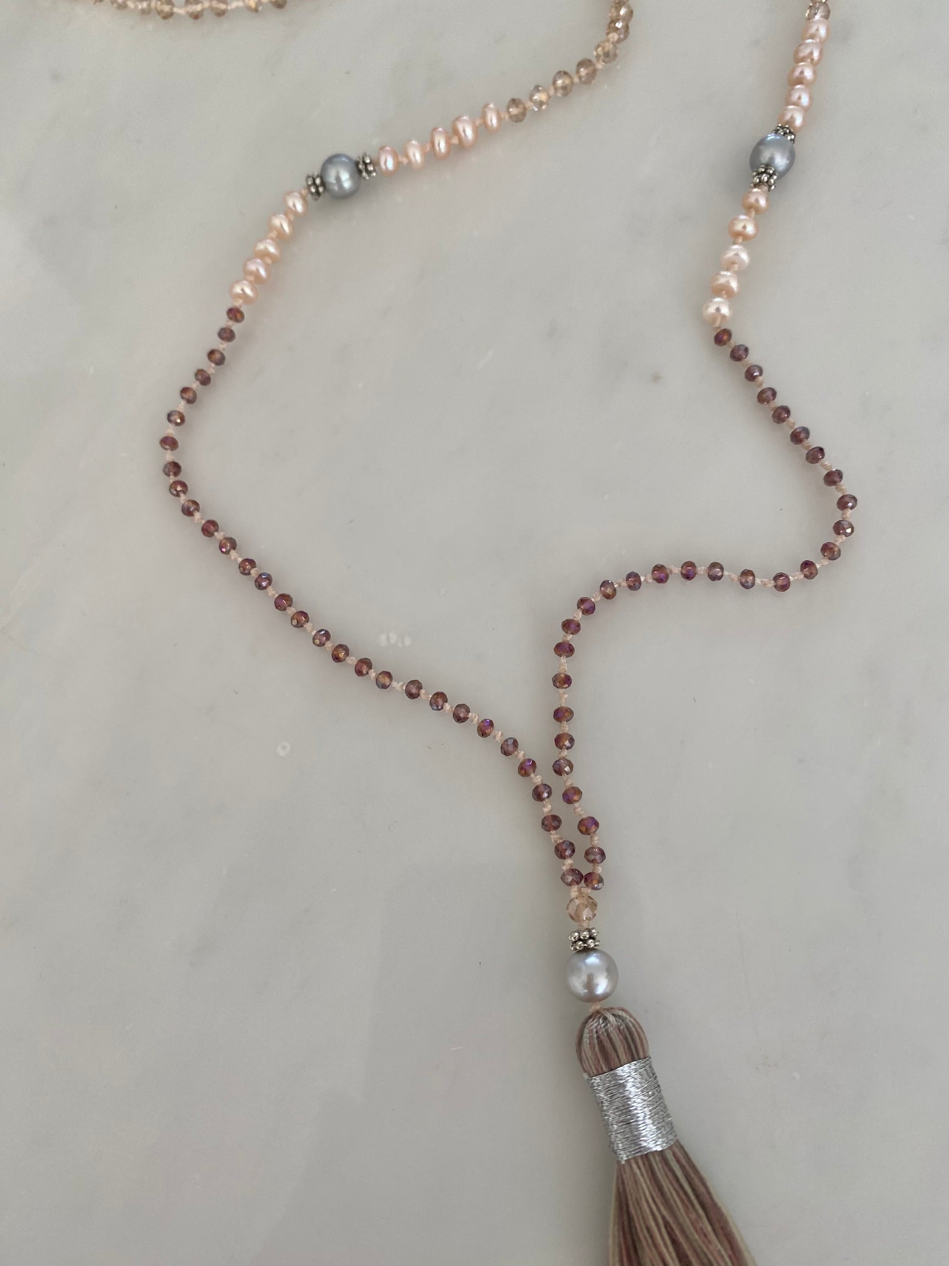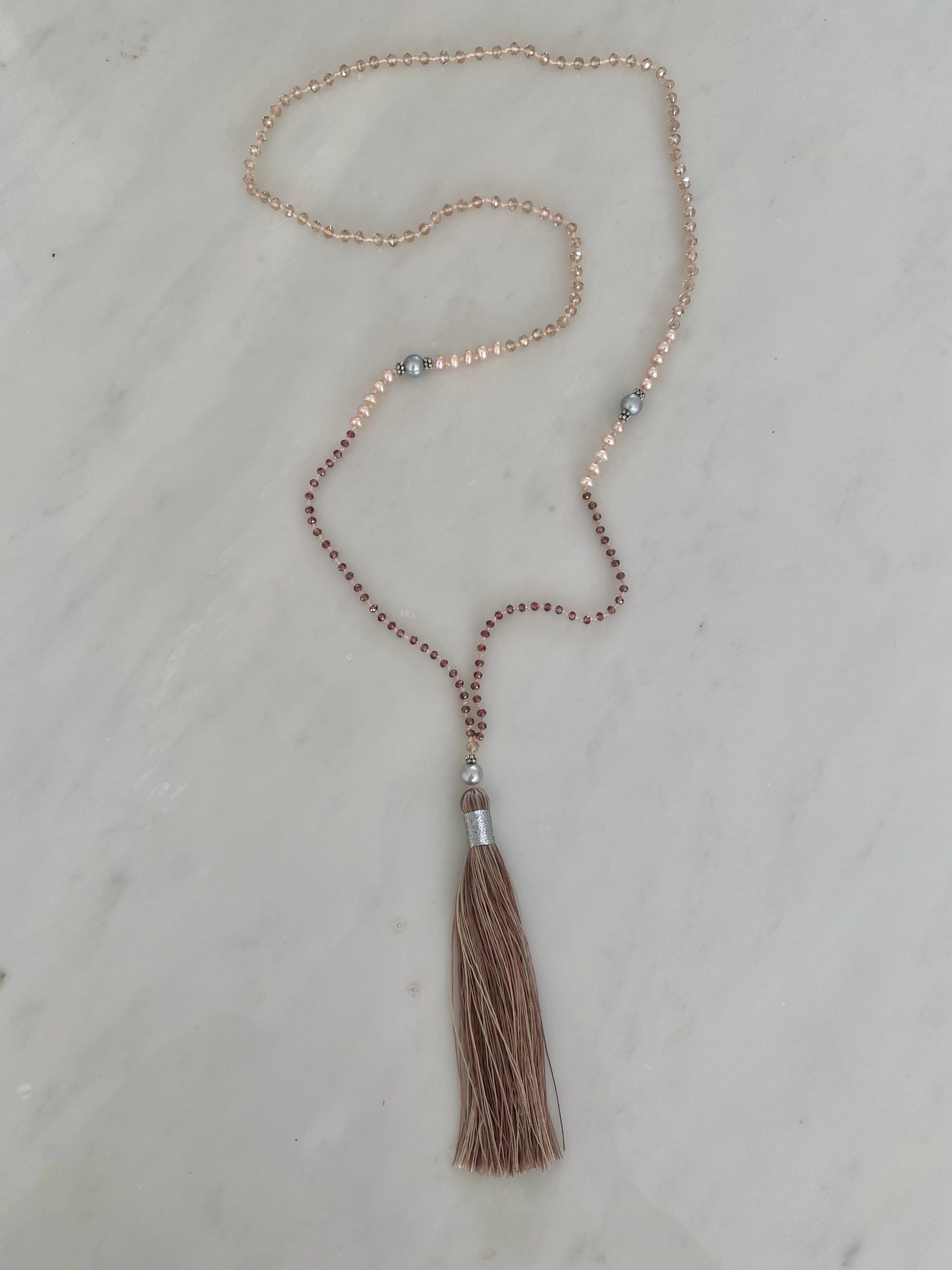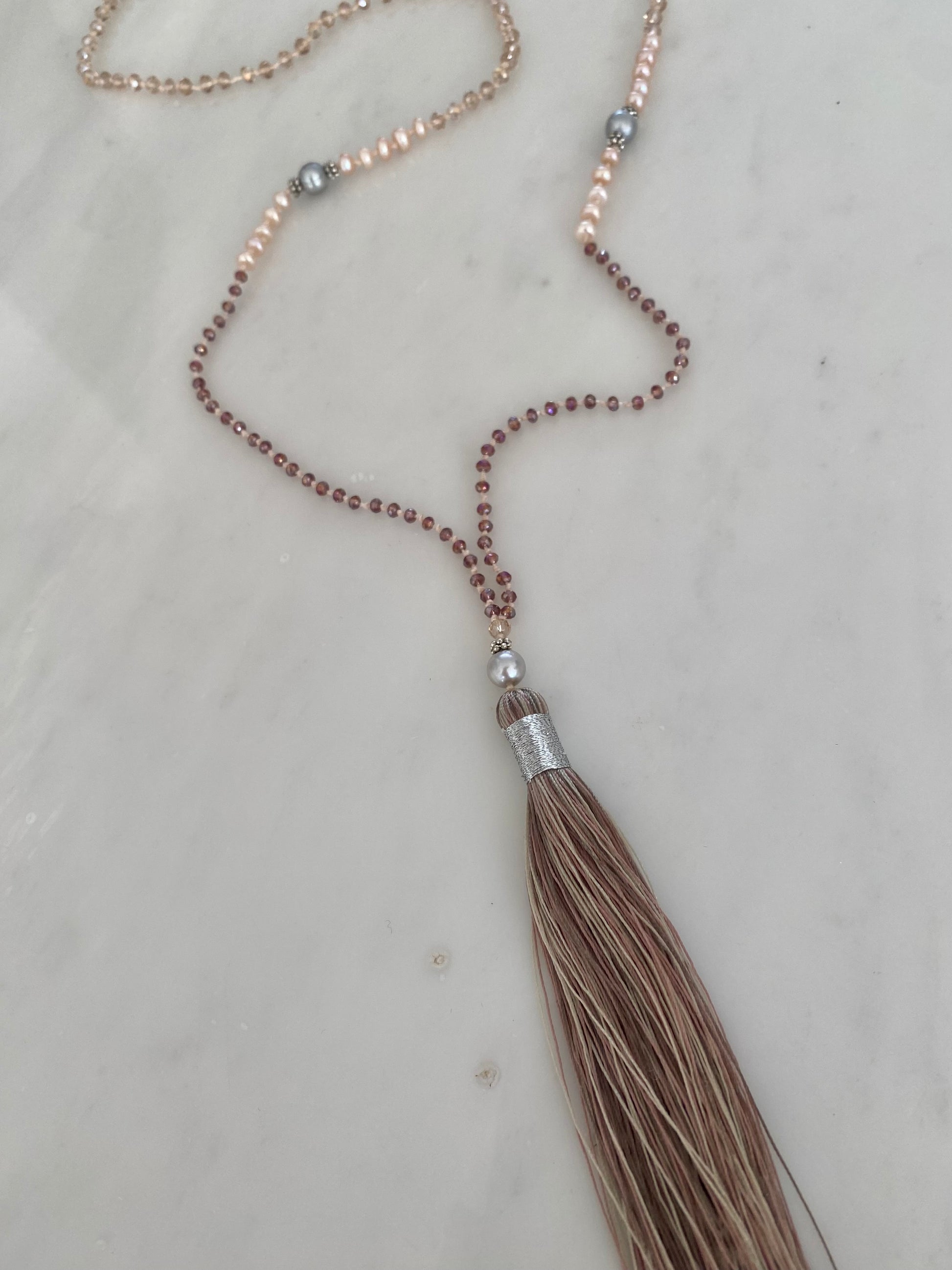 This gentle tassel necklace is made up of warm peach and violet crystals, soft peach-pink small pearls and larger glowing grey pearls. Finished with a sophisticated blended tassel with nude, cream and taupe wrapped in silver.