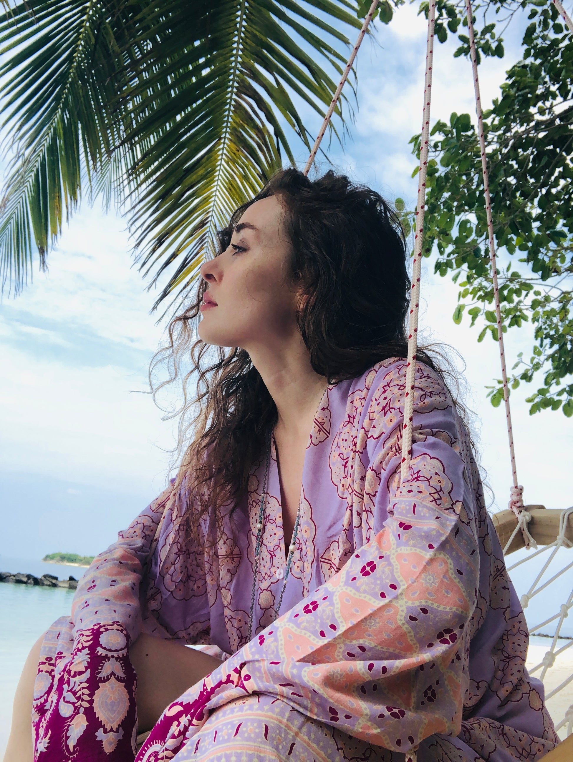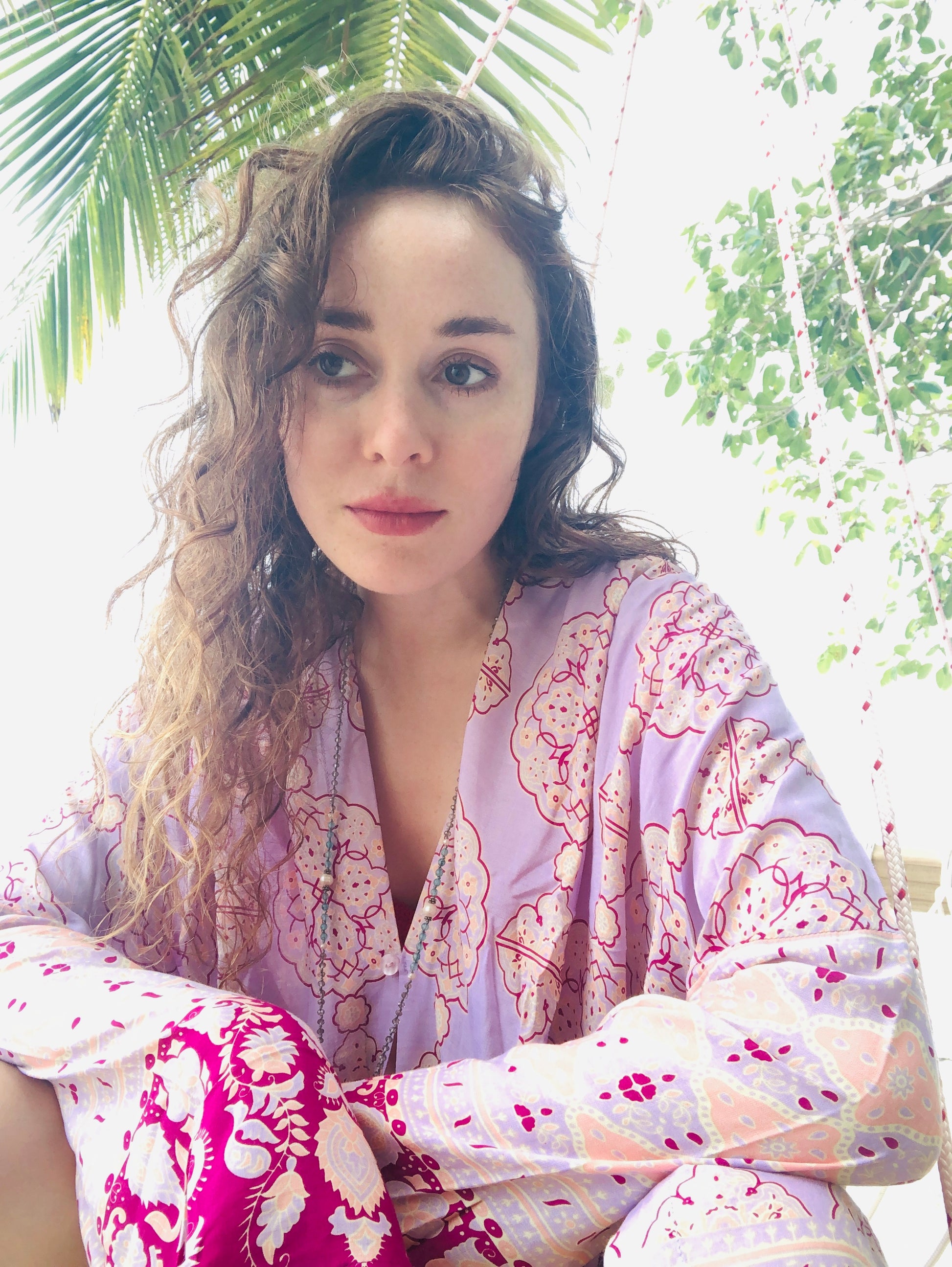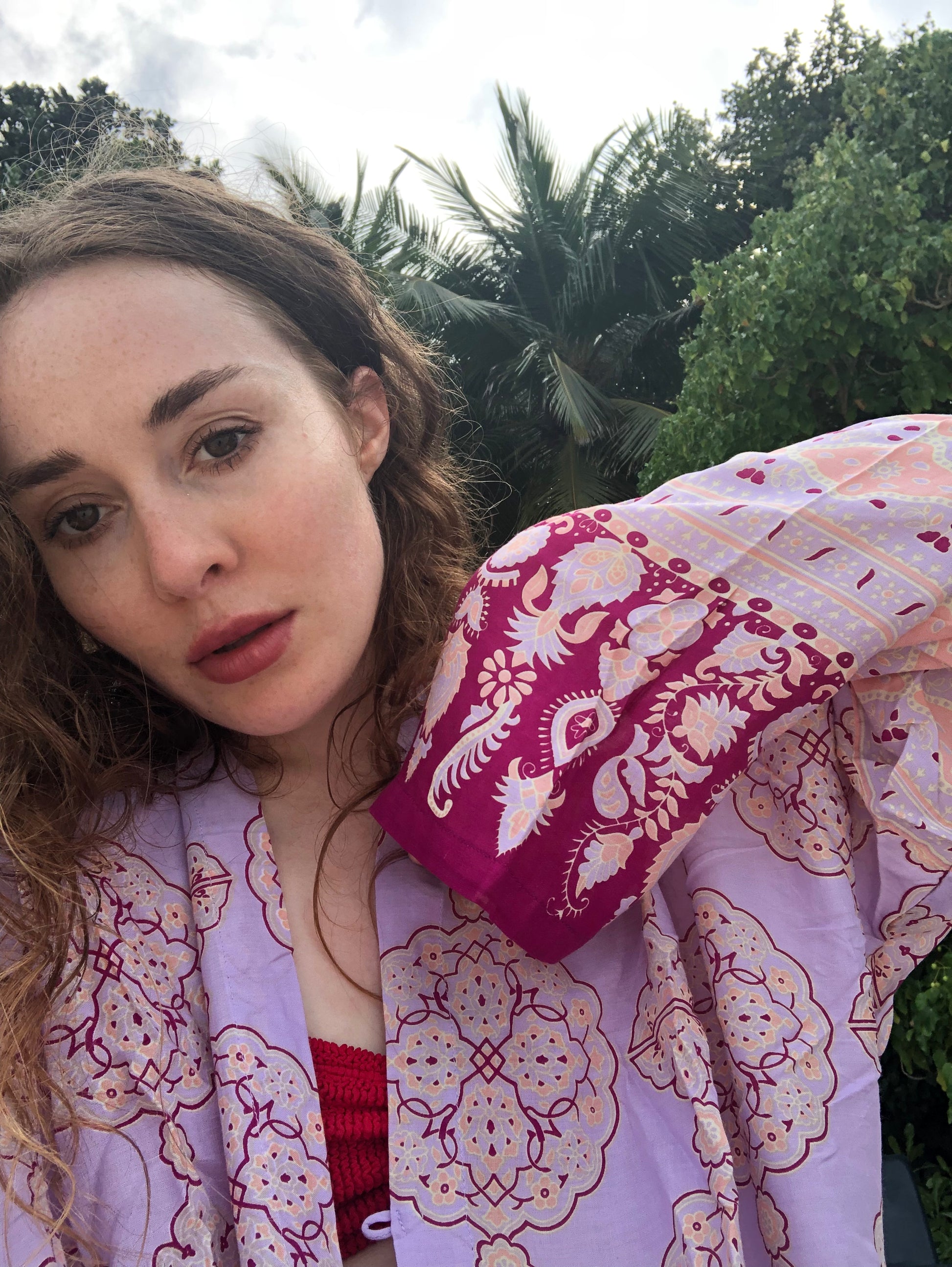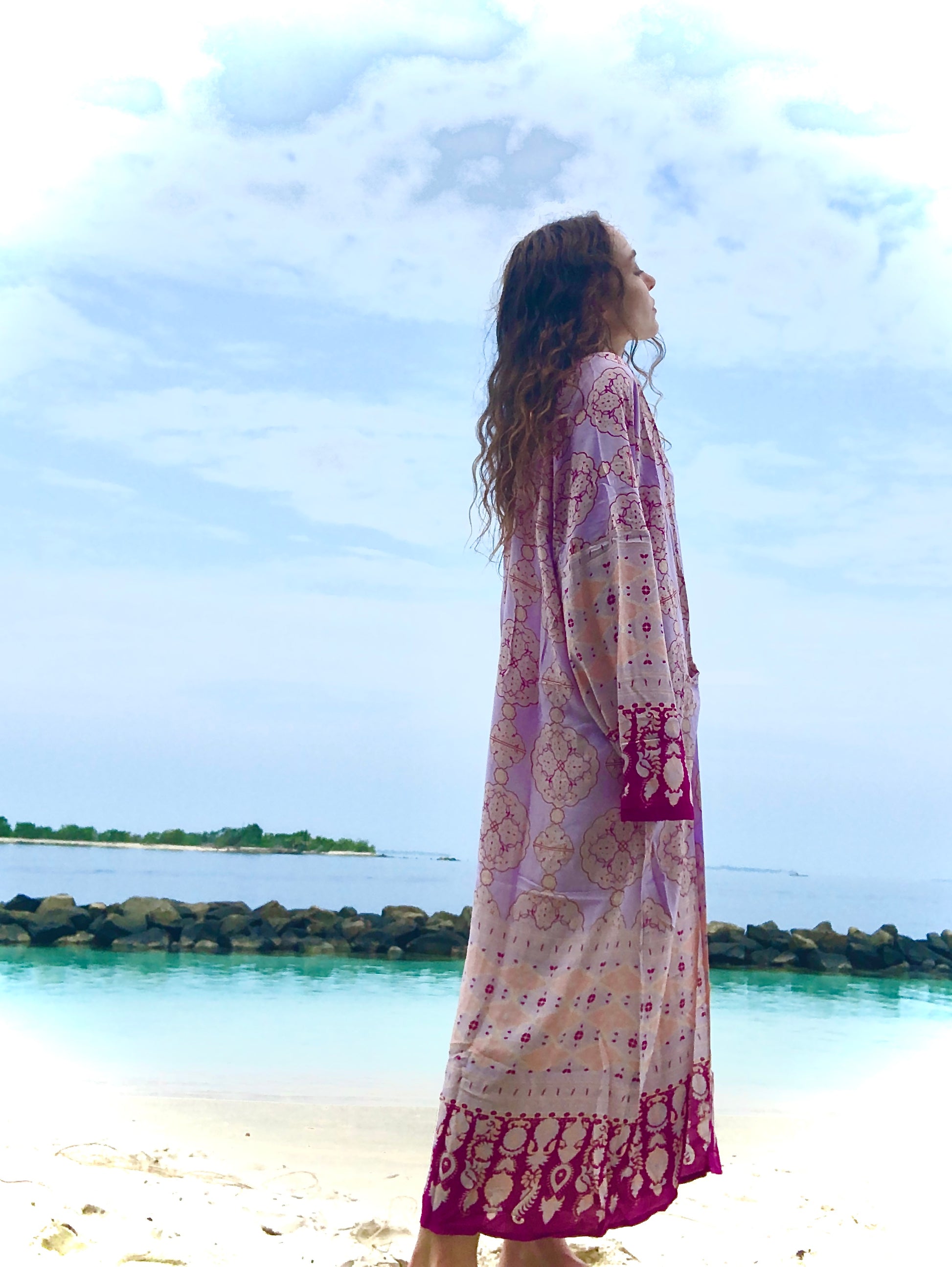A fabulous and useful piece in our Journey through India Collection. This beautiful and versatile kimono in the lightest and softest natural rayon voile fabric which feels wonderful against the skin. It has an easy feel with deep front pockets and is great for travelling. It's your morning robe, your bikini coverup and you can also dress it over heels and jeans or shorts for a cool summer evening look.