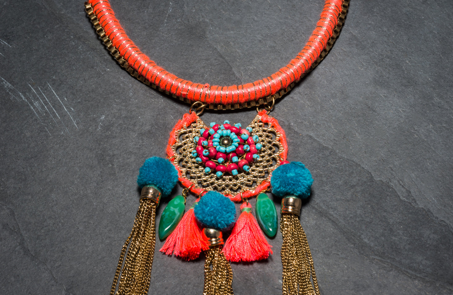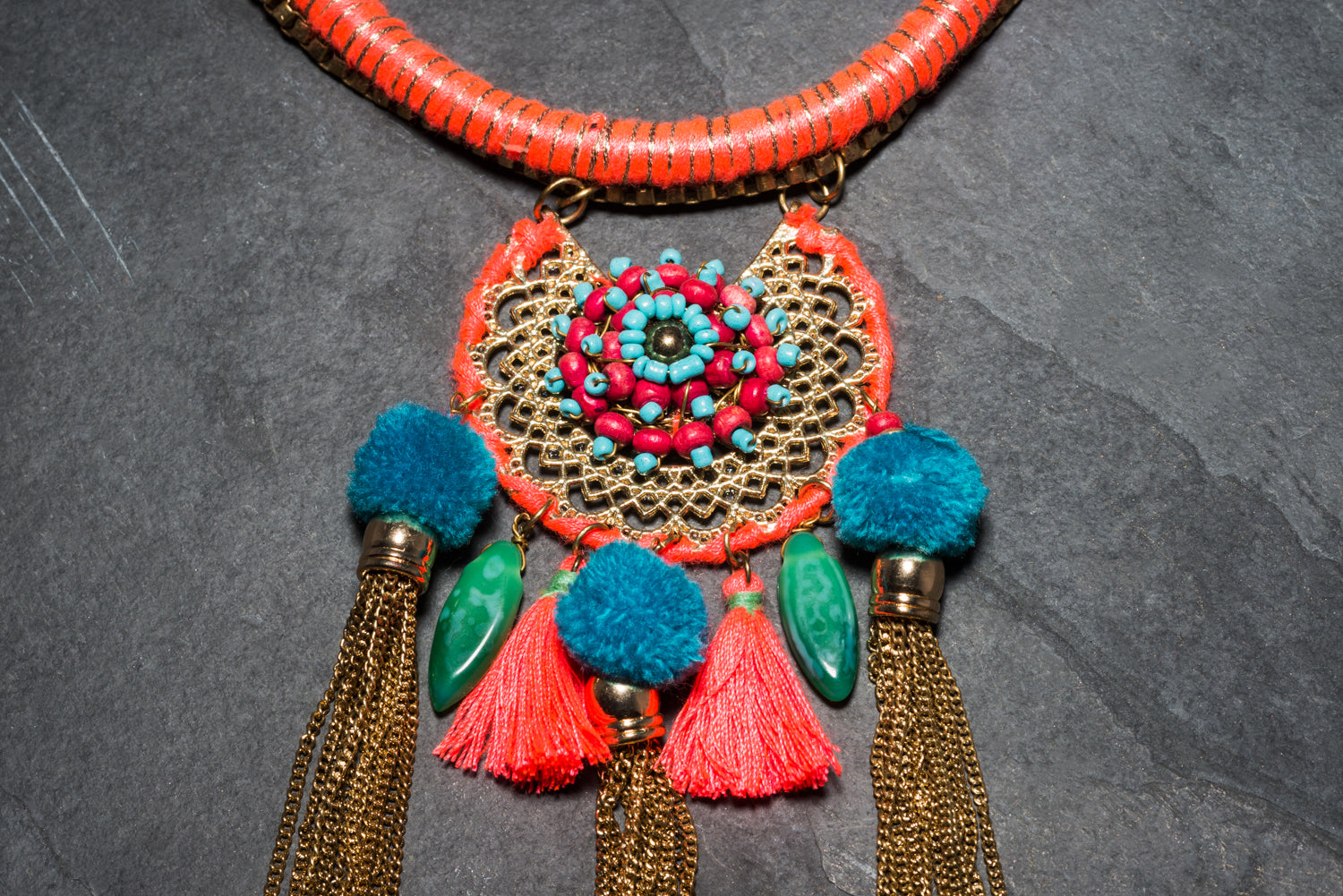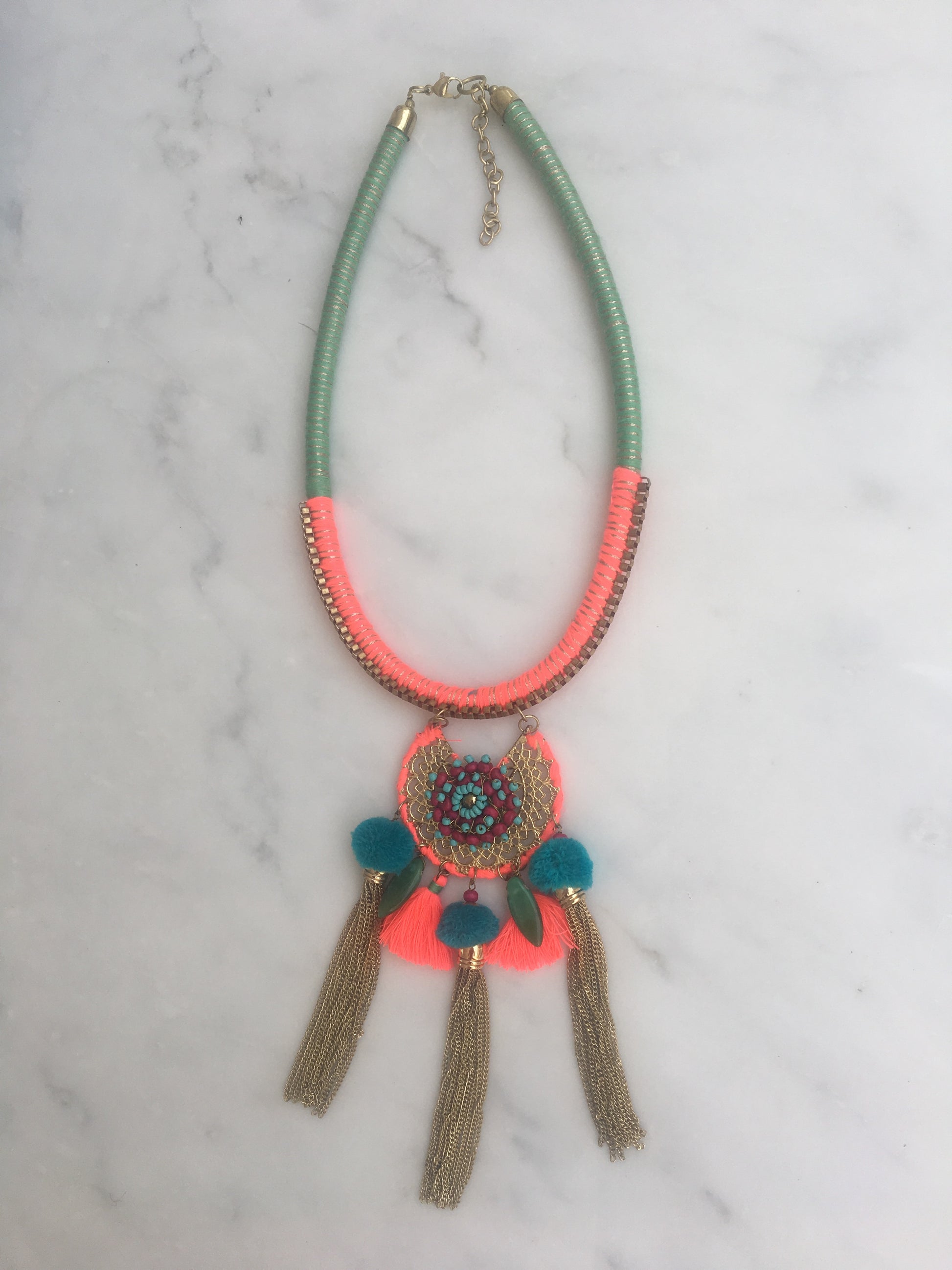 This fabulous statement necklace of, corals, aqua, pink and green, it is made of gold plated brass. Comfortable threaded necklace part of light aqua-green and coral and below is a filigree dream catcher with turquoise and pinks beads, below sit deep aqua pom pom, coral tassels, green semi precious stones and fine gold plated chains. The long extension chain means it can be worn high as a colar or much lower on the chest. Amazing with a dress or just add to a simple top and black trousers for a wow look, it will become your summer statement piece.