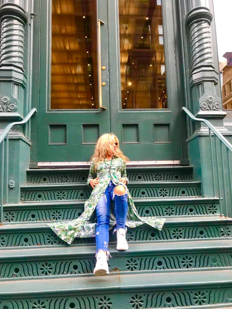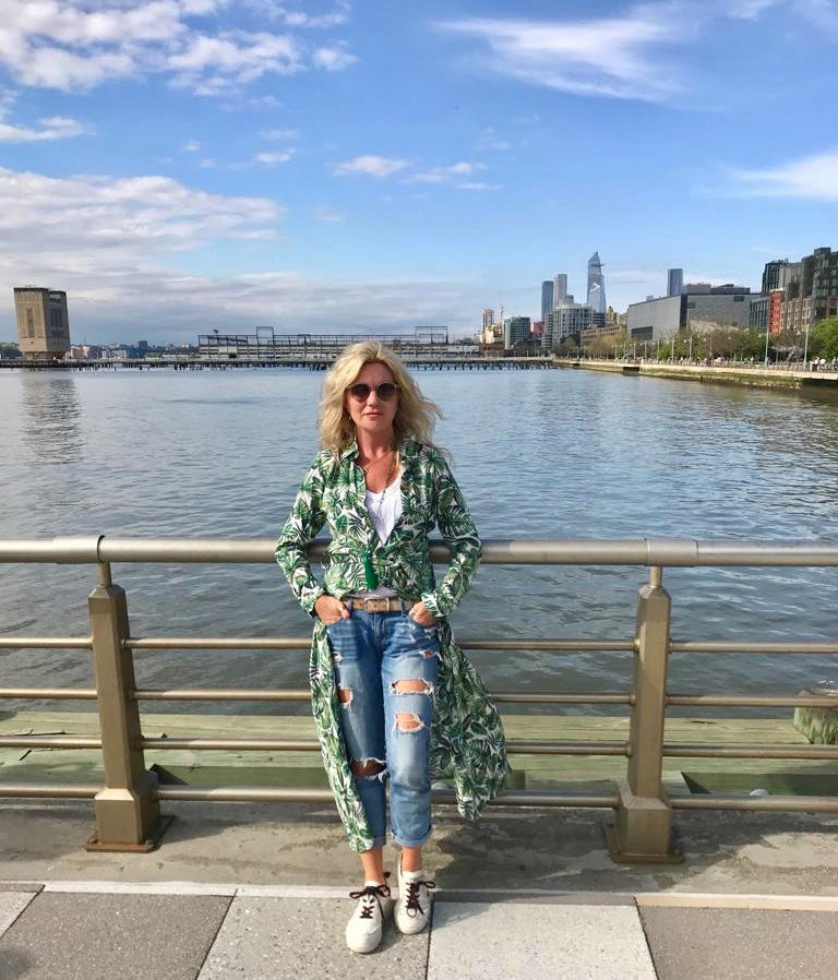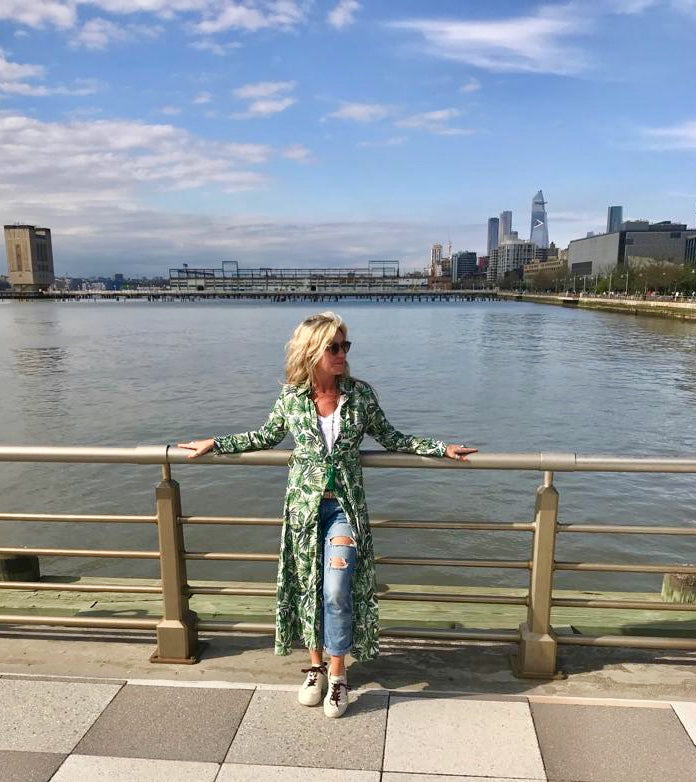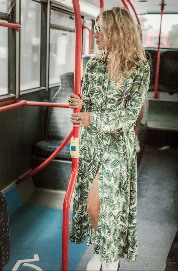 It is buttoned all down the front so you can wear it undone at the bottom over jeans and trousers, you can wear it totally unbuttoned like a long overcoat or you can wear it totally buttoned up alone as a very flattering summer dress. It has an easy wide tie belt in the same fabric, to pull it in at the waist.