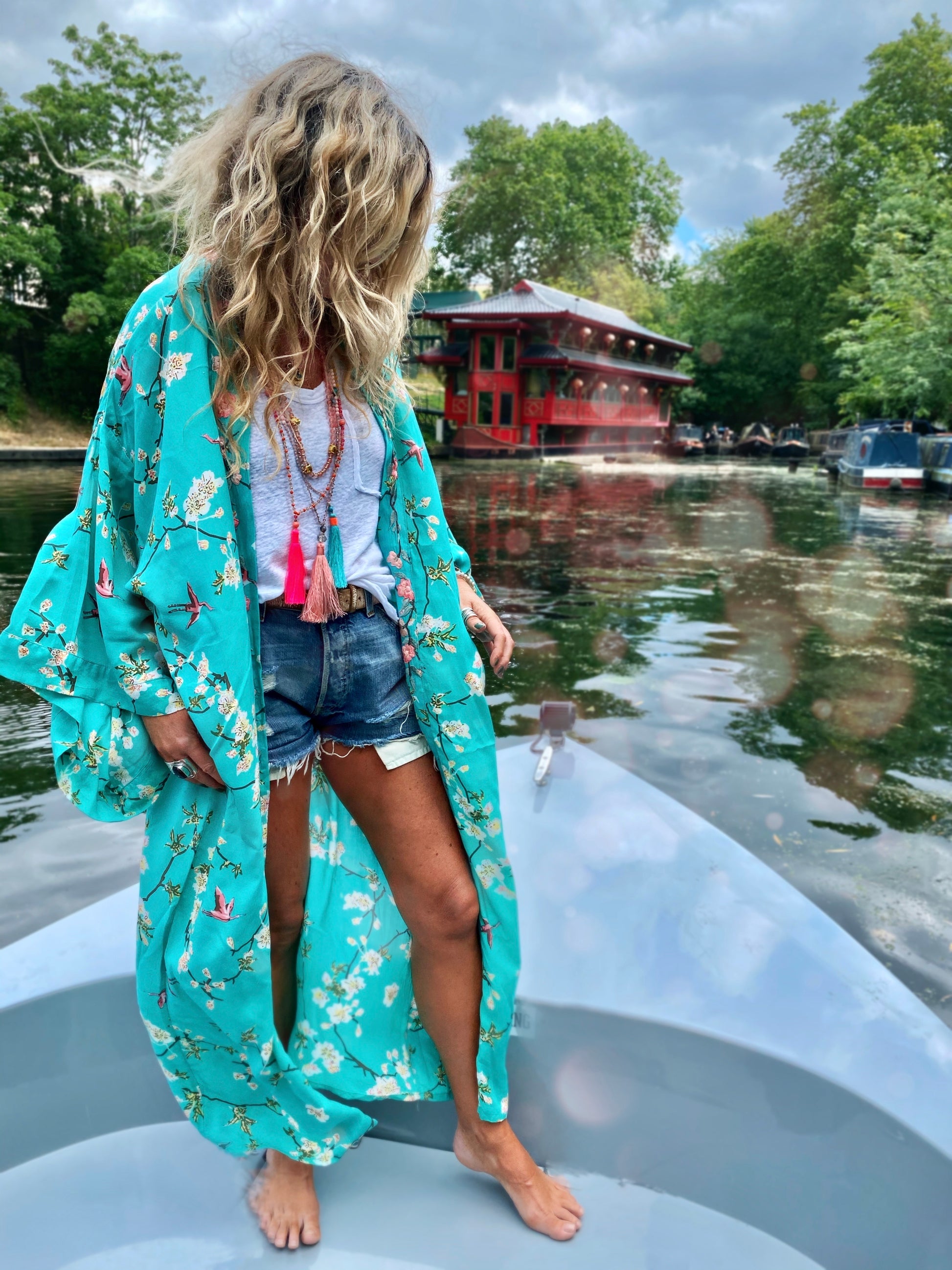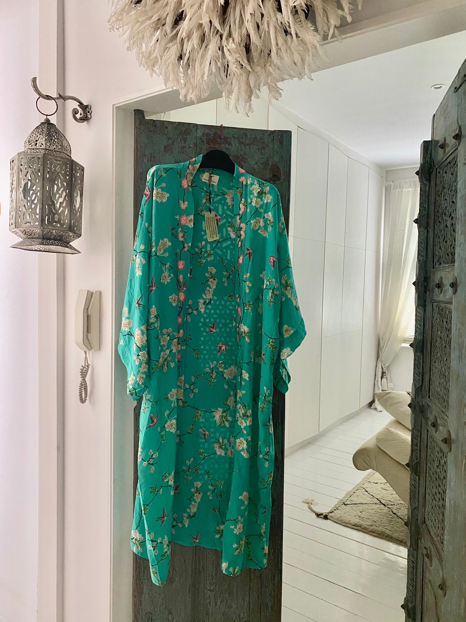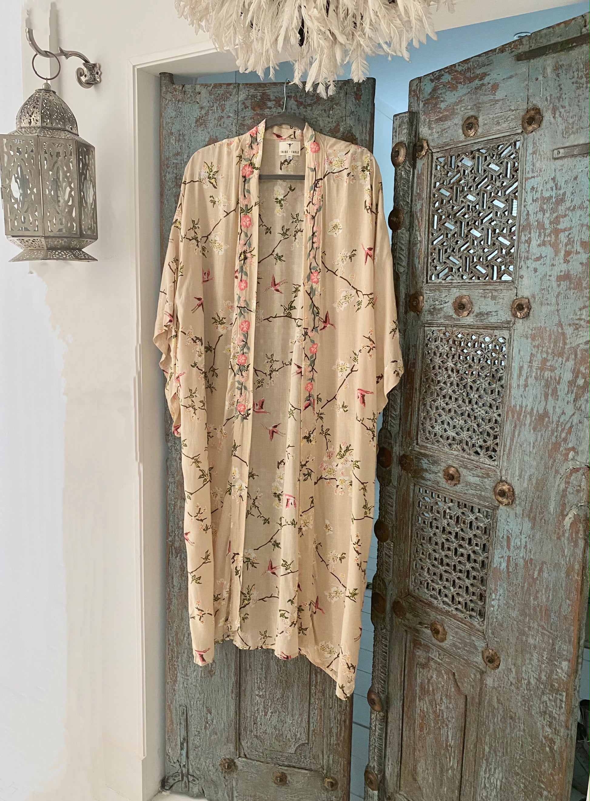 This beautiful and versatile kimono has an elegant kimono style squared sleeve. It is made in the lightest and softest 6 times screen printed, small batch, natural rayon voile fabric, it feels wonderful against the skin. Charmingly embellished with floral multi coloured embroidery on the front edge for added detail.