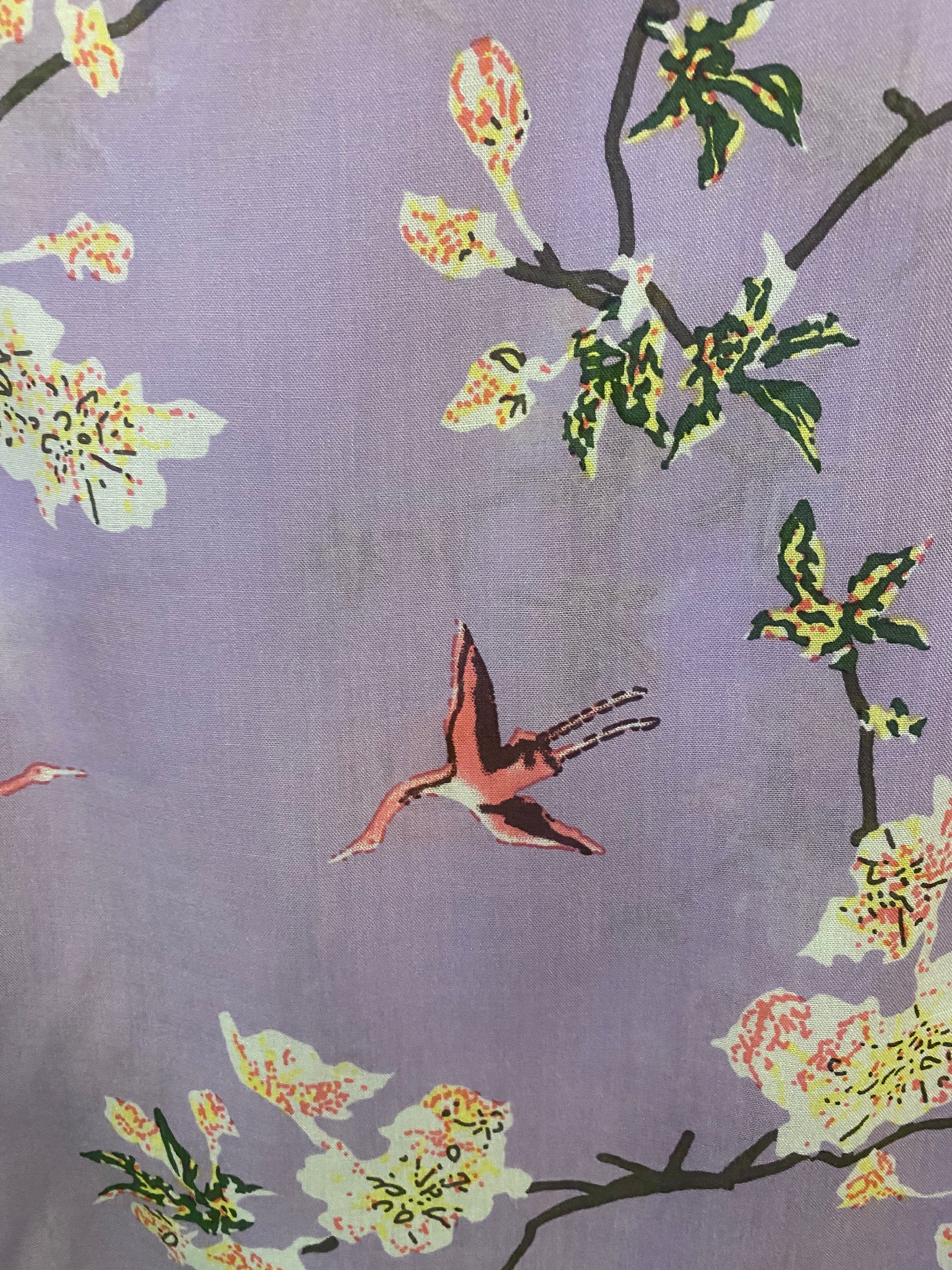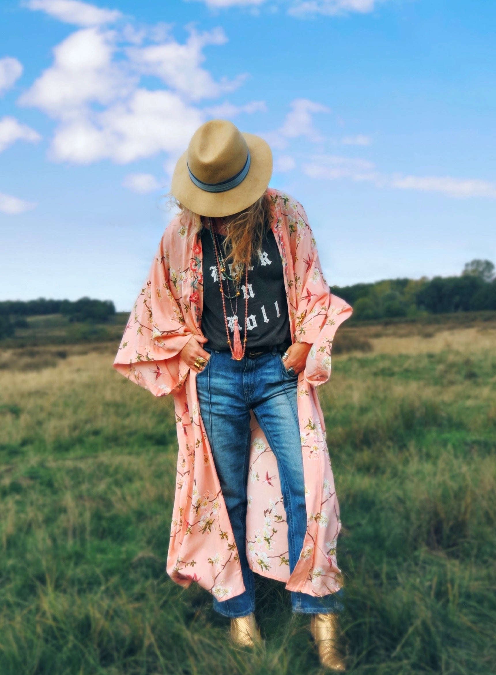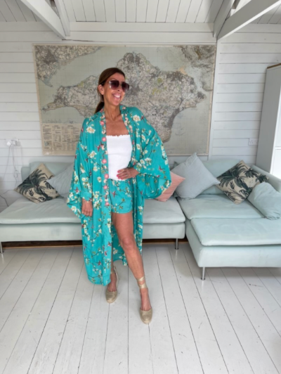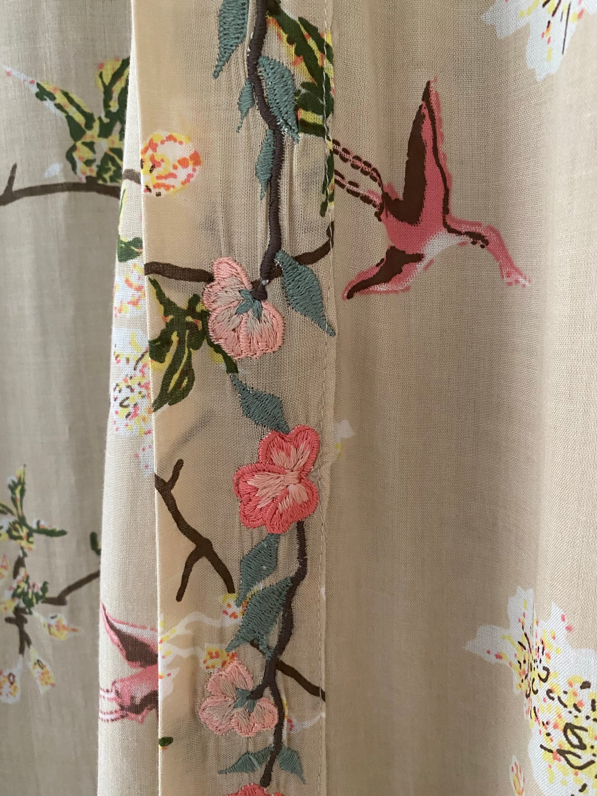 This beautiful and versatile kimono has an elegant kimono style squared sleeve. It is made in the lightest and softest 6 times screen printed, small batch, natural rayon voile fabric, it feels wonderful against the skin. Charmingly embellished with floral multi coloured embroidery on the front edge for added detail.