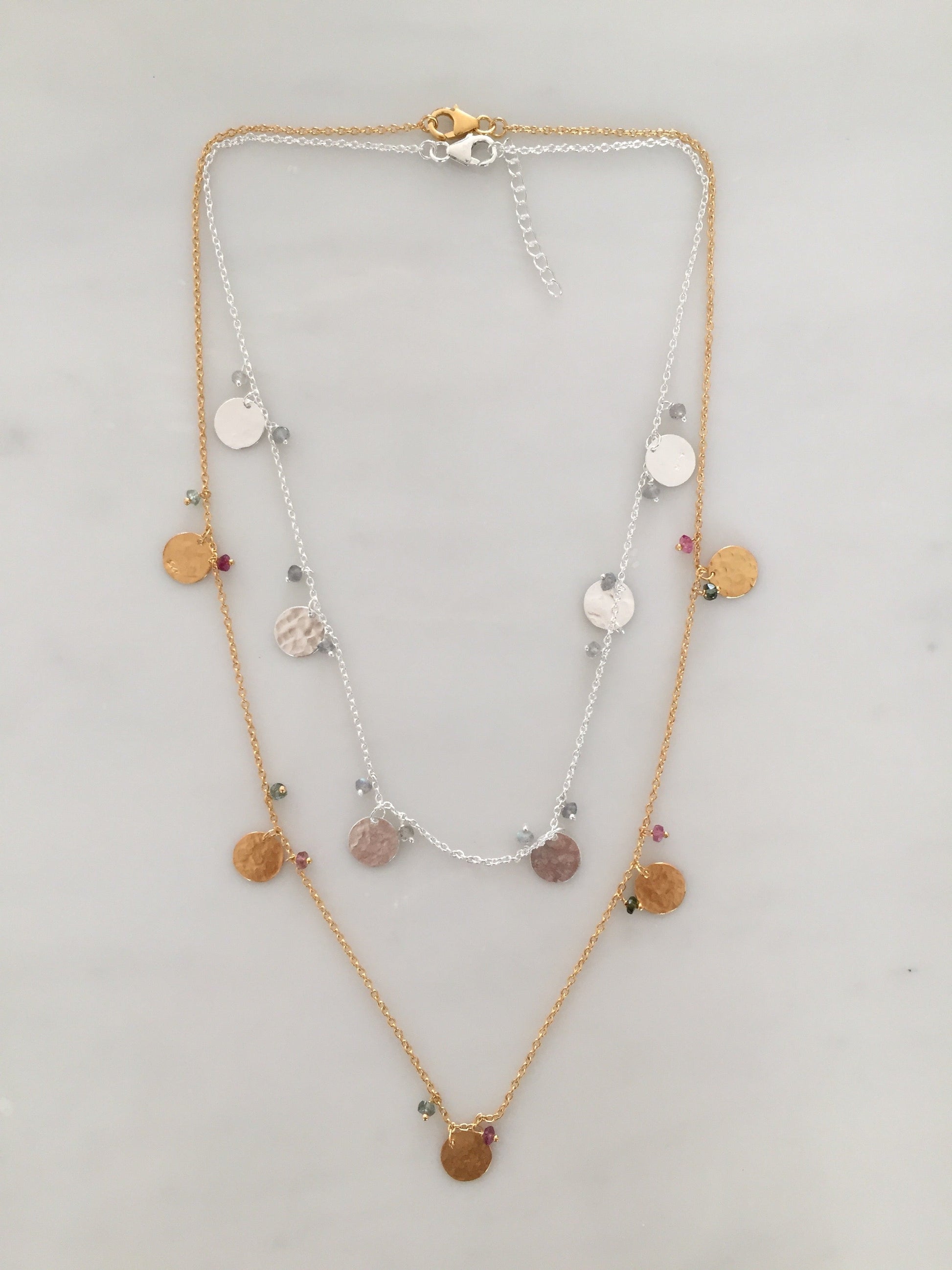 This is the longer of our two discs necklaces which can be layered together, have fun mixing the gold with the silver!
