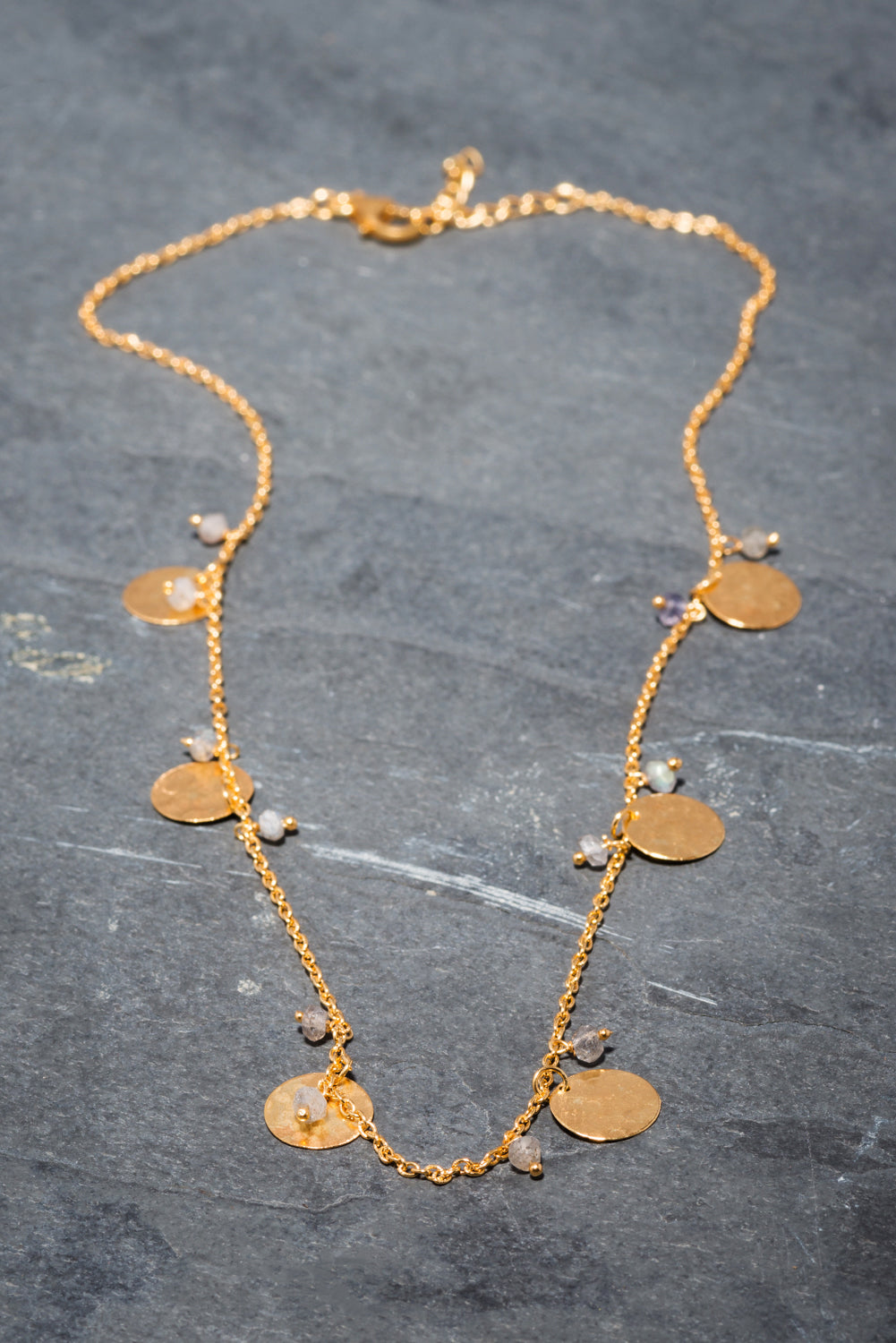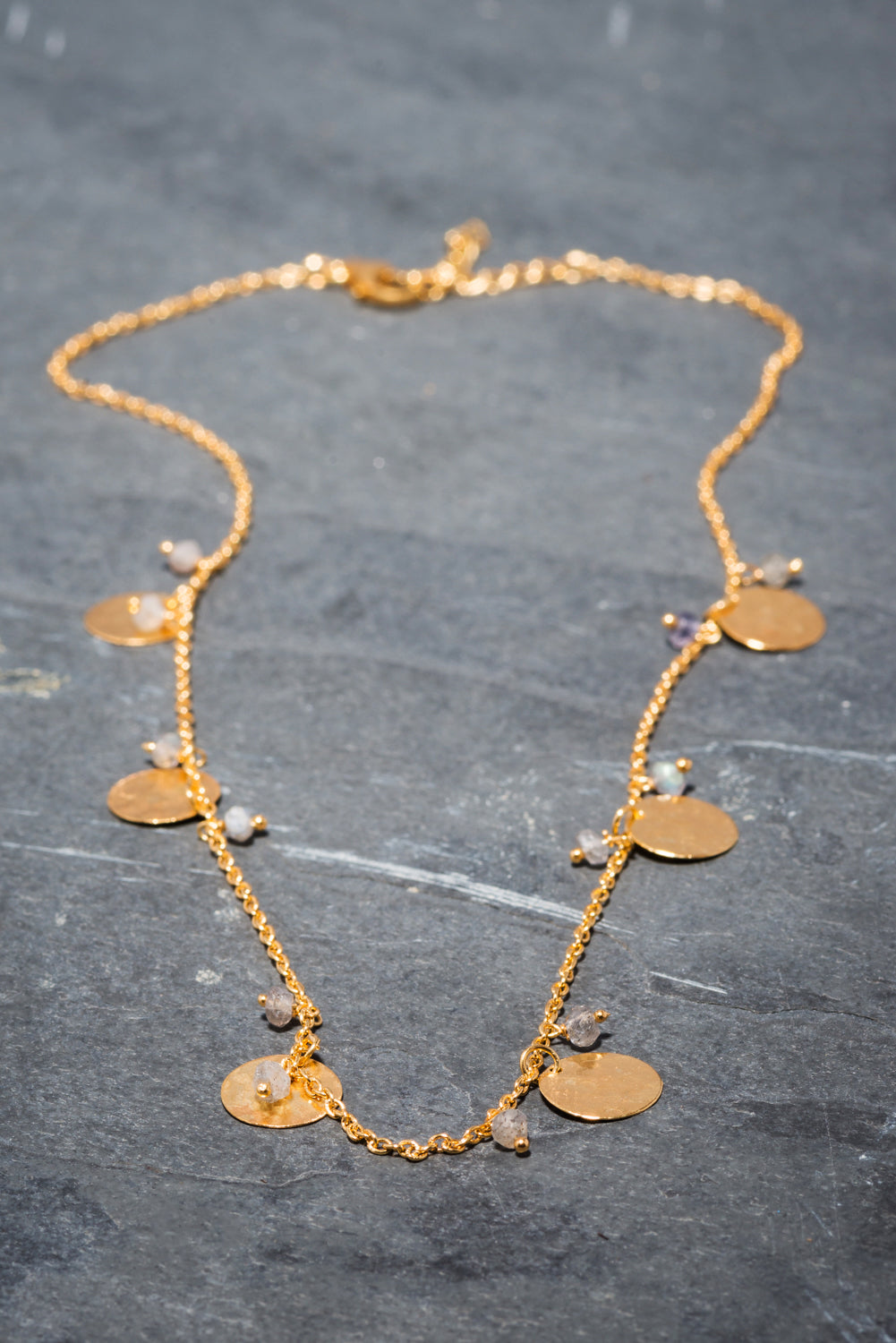 This beautiful and fine necklace is indispersed labradorite semi precious stones and scattered with six small discs which catch the light. It is made of 925 silver, plated in 2 microns of gold.