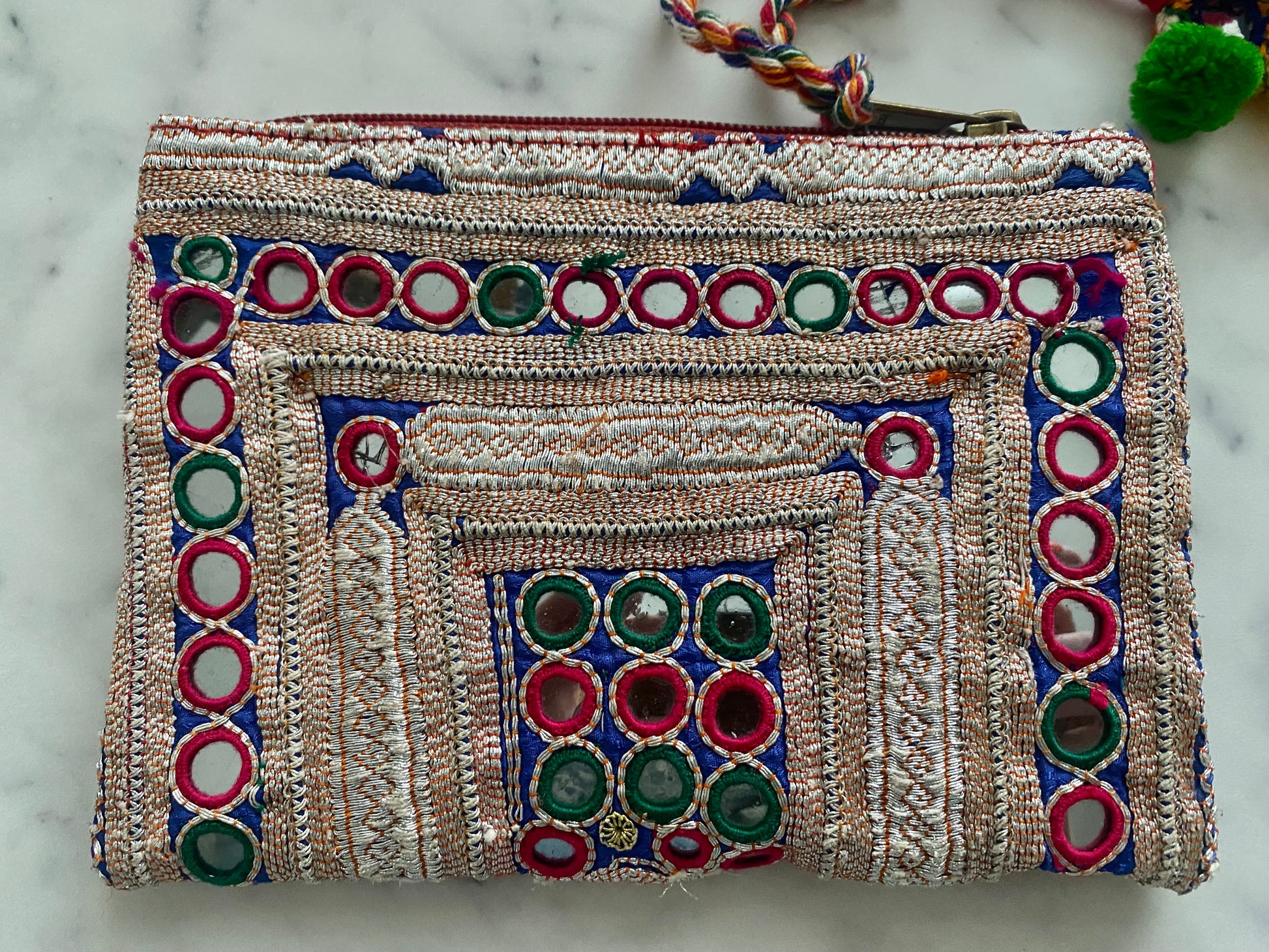 This beautiful one off silver bag is made from pieces of fabric from Vintage Banarasi Brocade Saris and decorated with vintage coins, mirrors, beading and jewellery pieces. Each bag is totally unique and is artisans handmade in India.