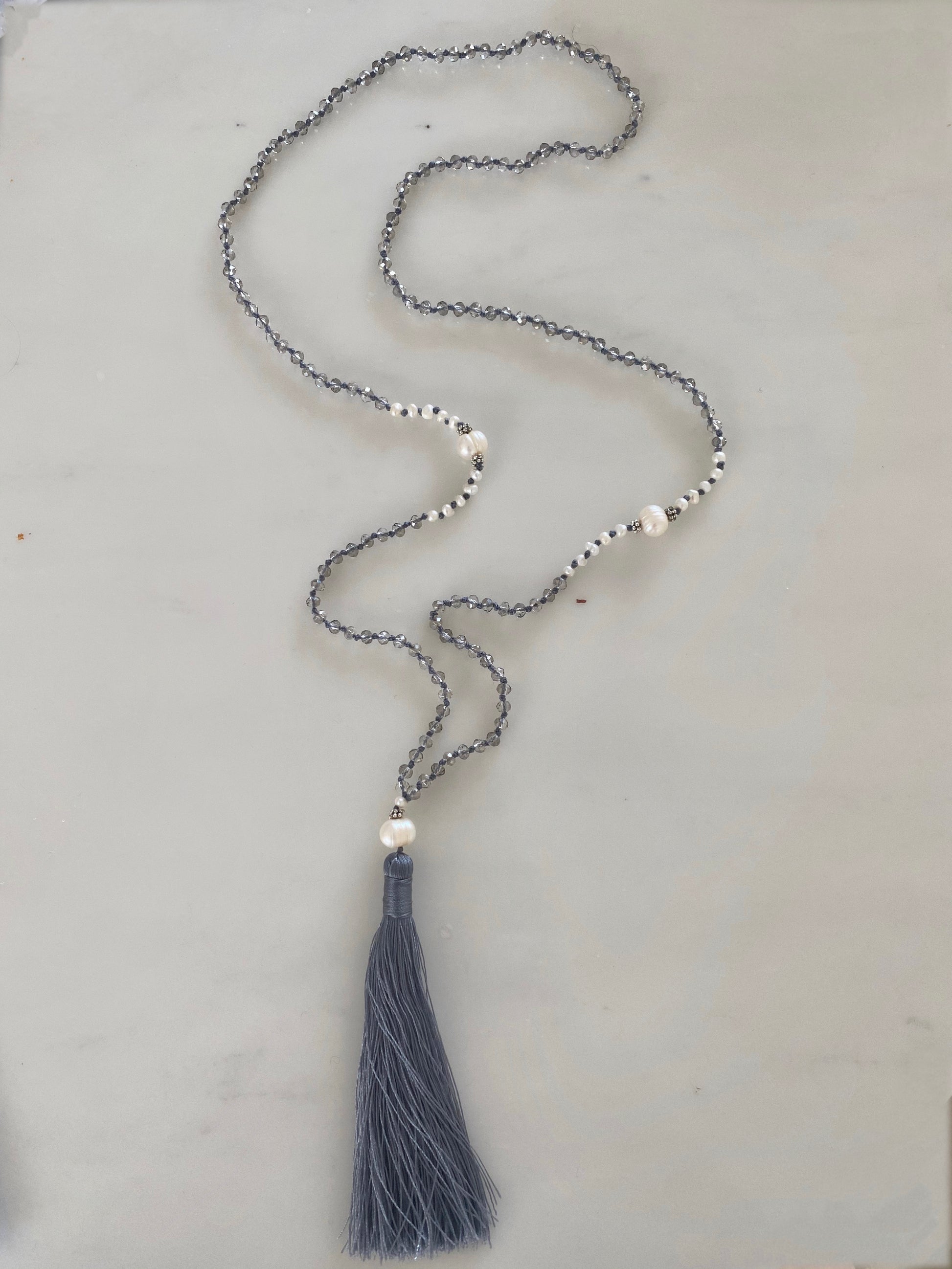 This gentle grey necklace is made up of small and larger white pearls, hand knotted in soft grey thread. Finished with a simplistic grey tassel.